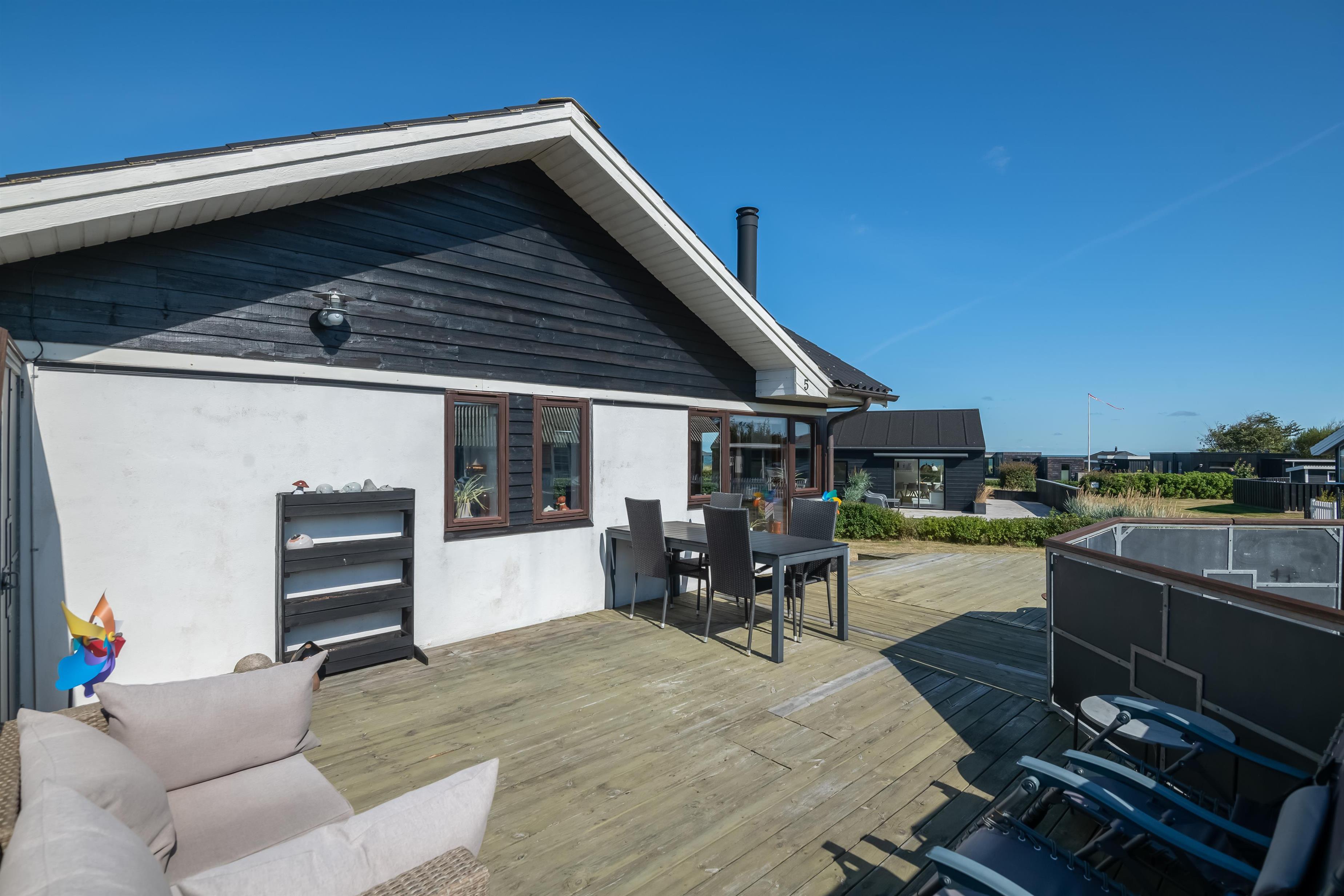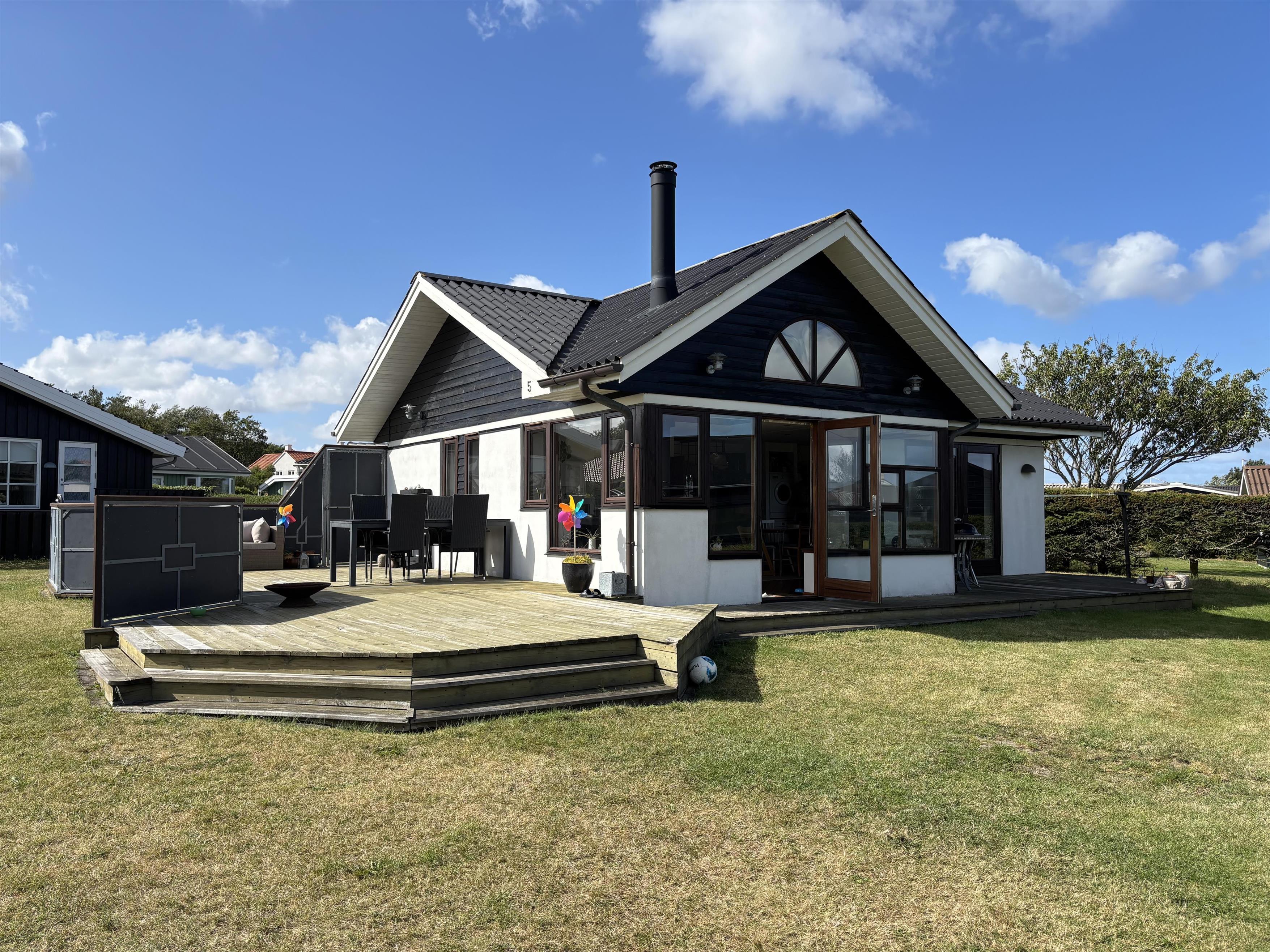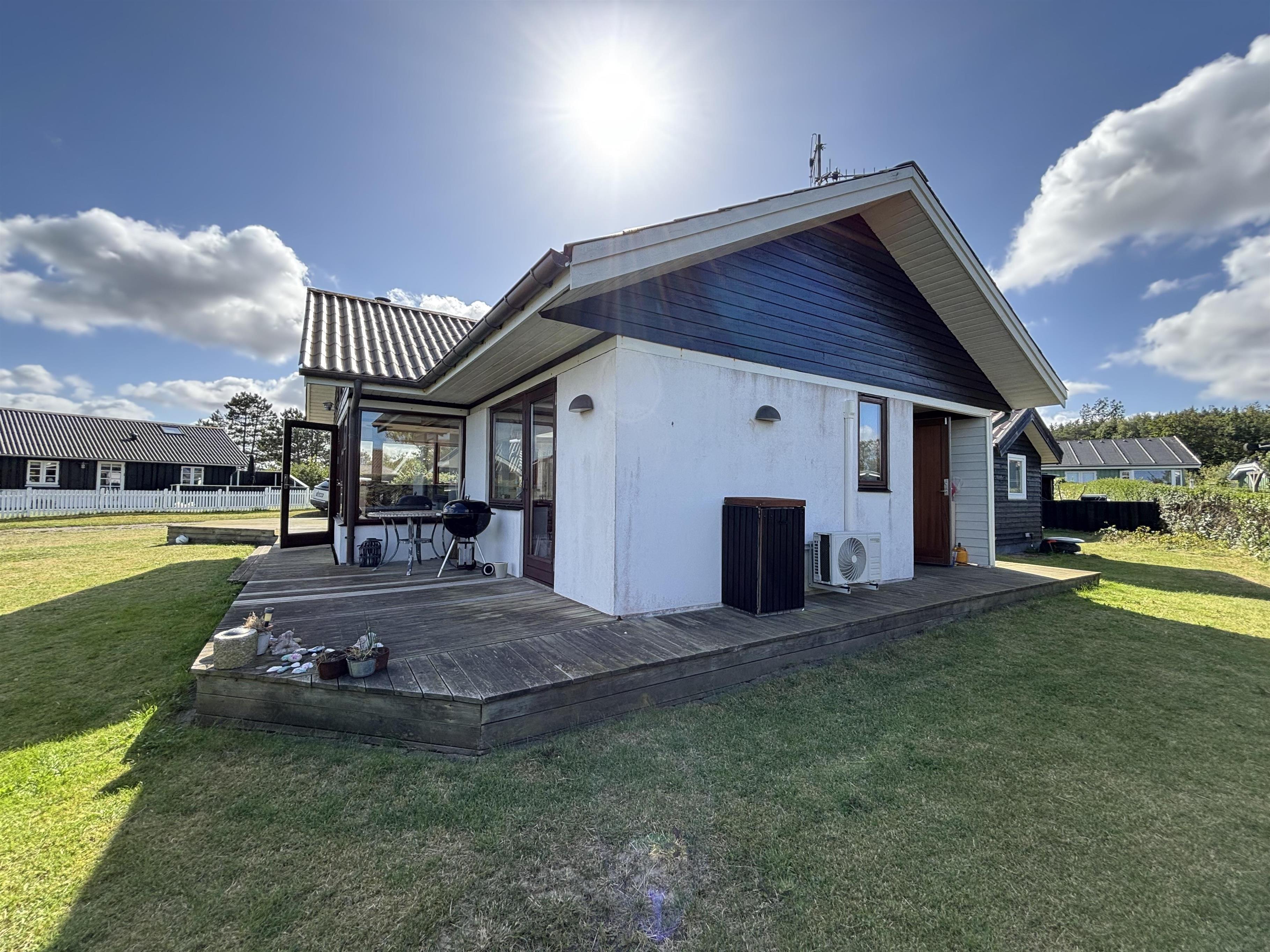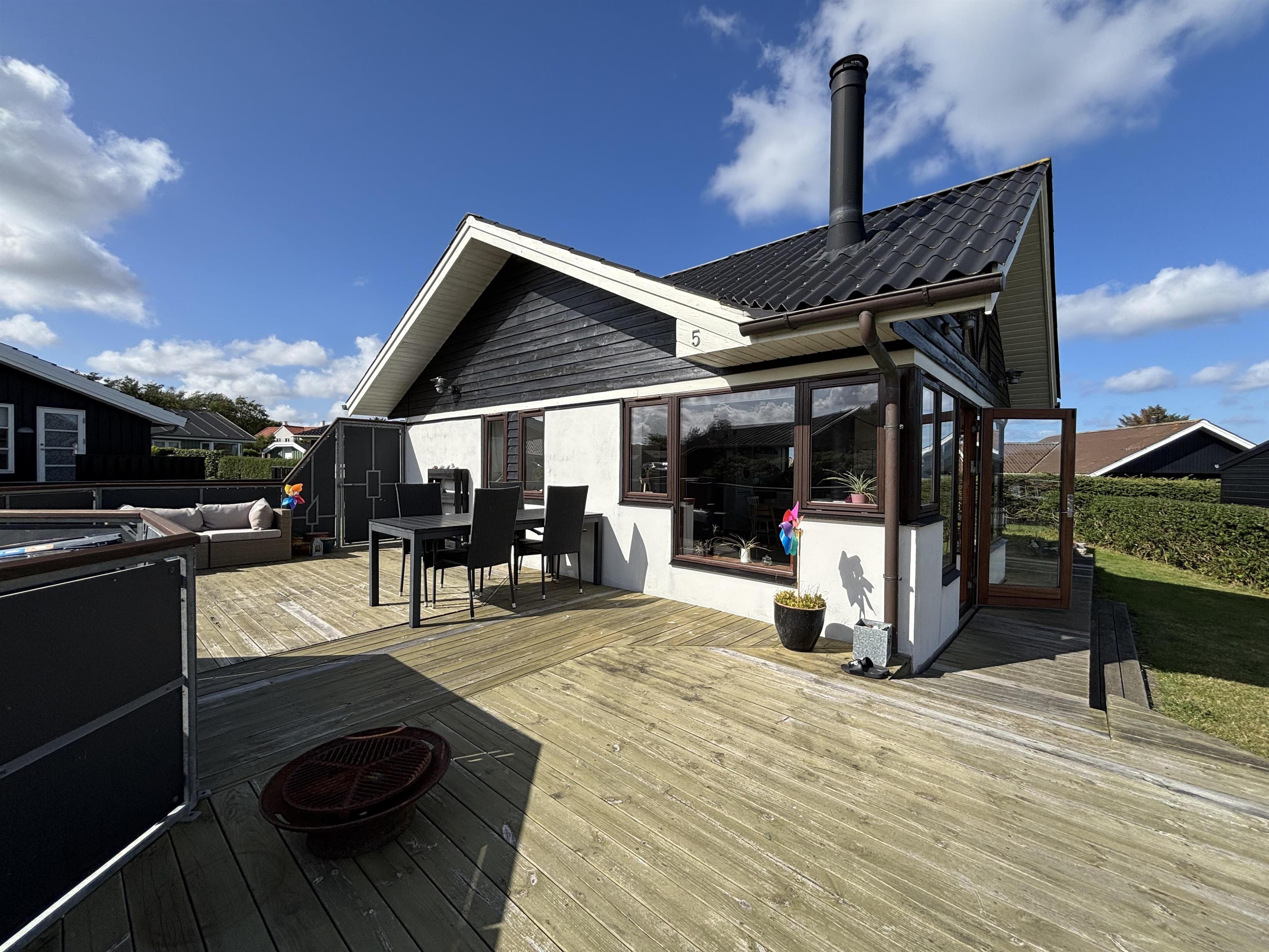 Køkken og stue går ud i et, med et super flot maritimt look, der skabes med skibsgulve, trækøkken, trædøre, træ/metal trappe og indretningen generelt. Rundt hele huset er der en dejlig stor træterrasse, med flere sidekroge og udgange både fra stue og køkken. Fra indkørslen er terrassen lavet sådan, at man kan, kører op med en kørestol, dog er der et små dørtrin ind/ud af huset. På bagsiden af huset er der en udebruser, så sandet nemt kan skyldes af efter en tur på den nærliggende sandstrand med blåt badeflag.