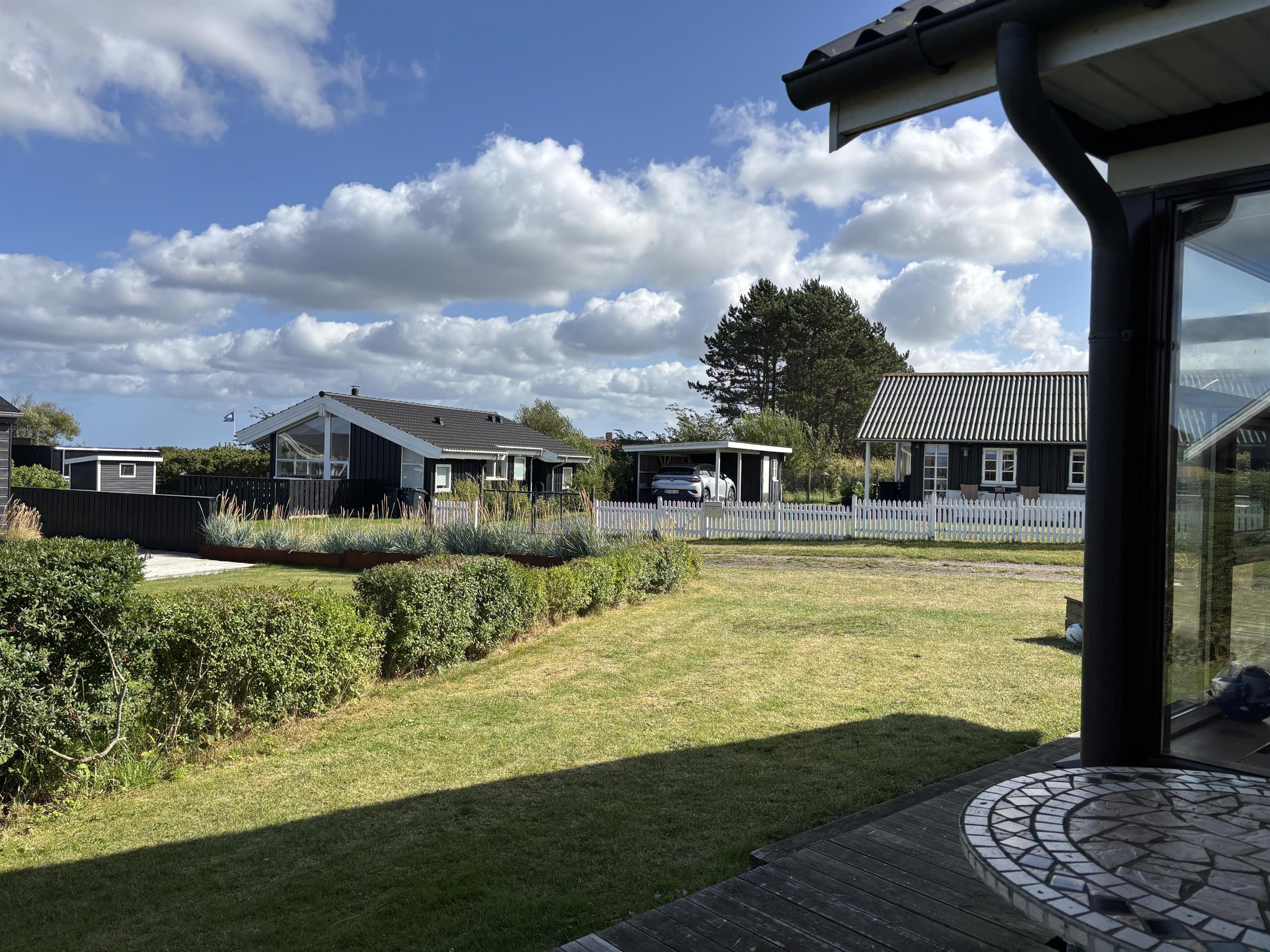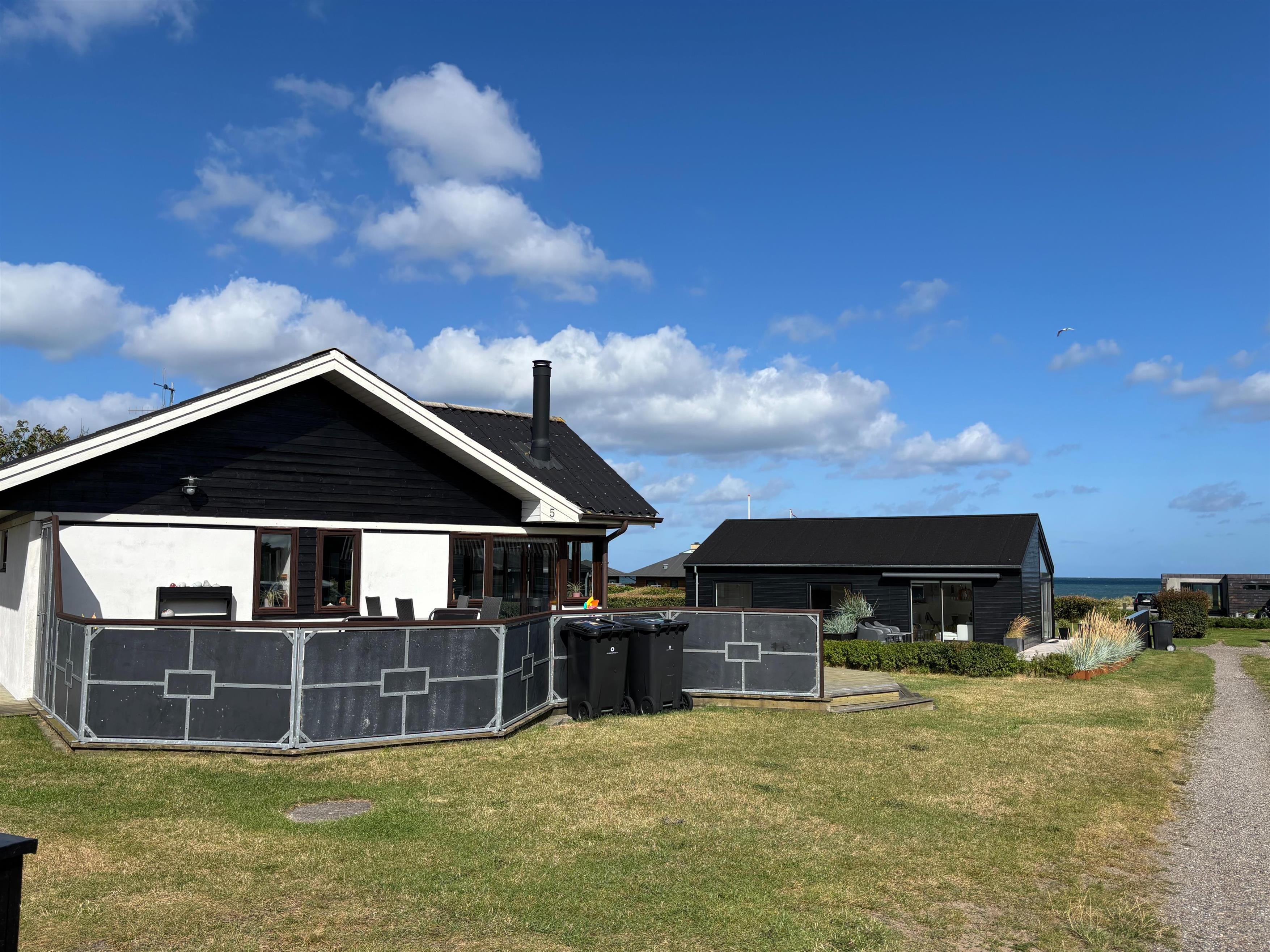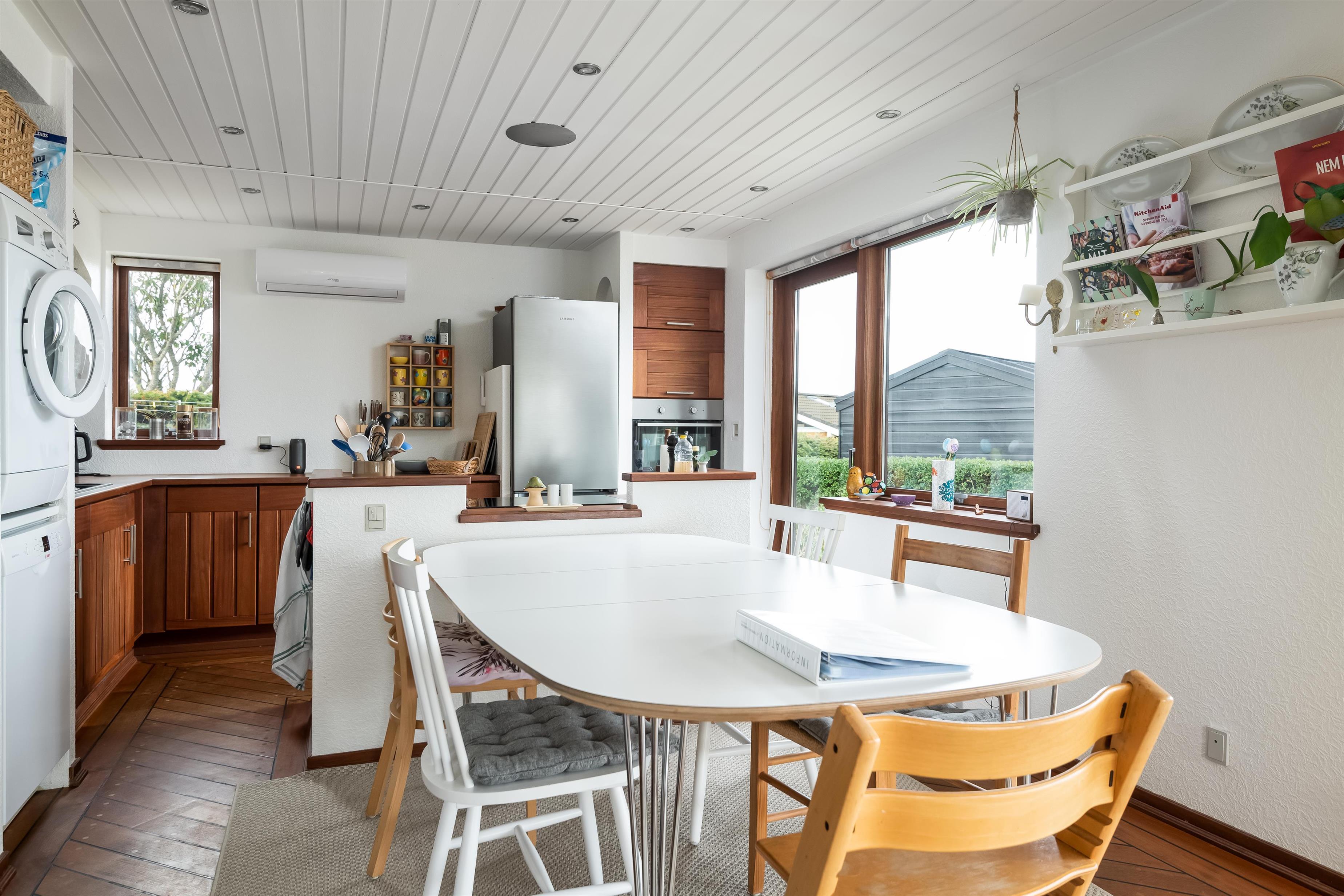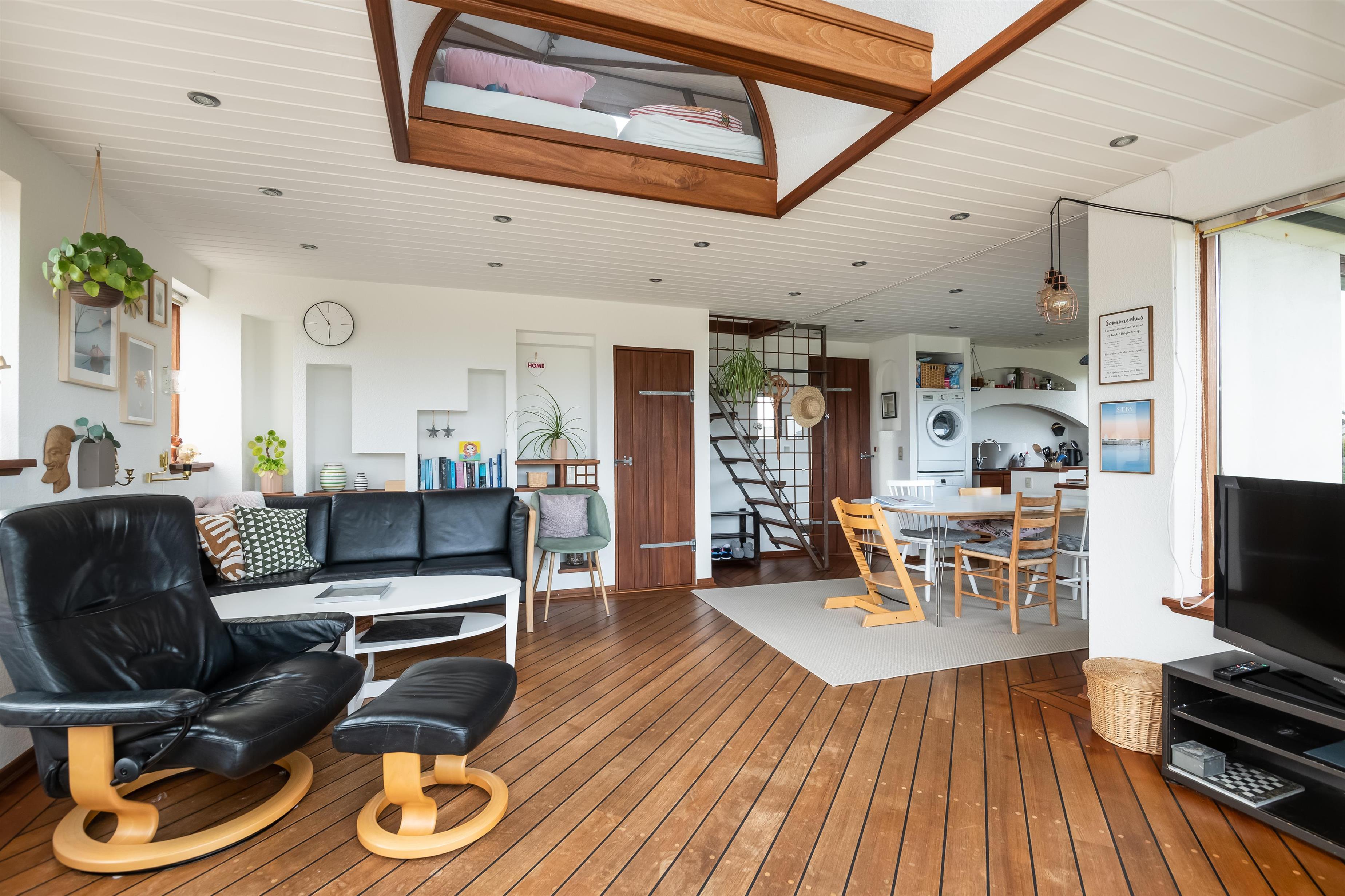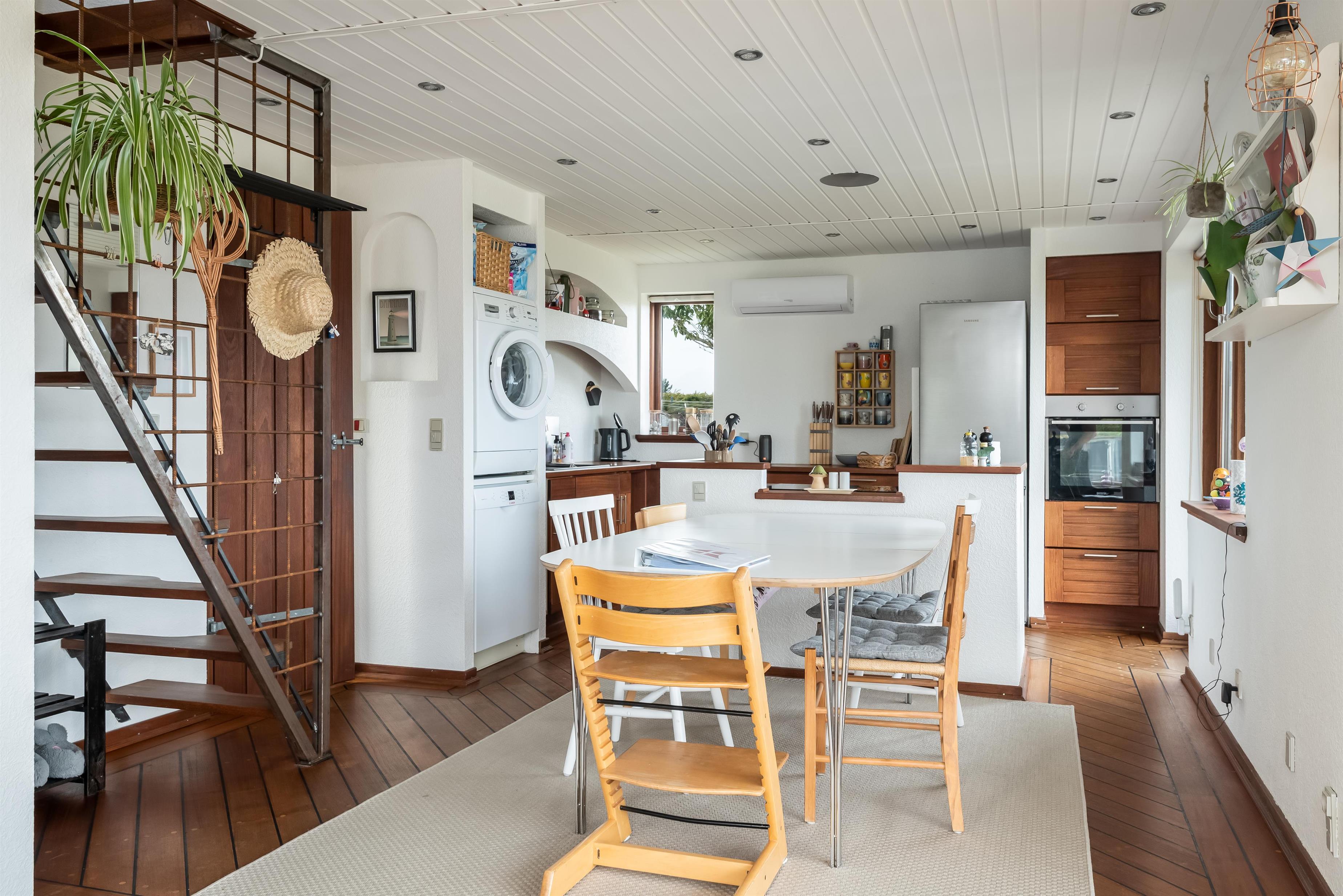 Køkken og stue går ud i et, med et super flot maritimt look, der skabes med skibsgulve, trækøkken, trædøre, træ/metal trappe og indretningen generelt. Rundt hele huset er der en dejlig stor træterrasse, med flere sidekroge og udgange både fra stue og køkken. Fra indkørslen er terrassen lavet sådan, at man kan, kører op med en kørestol, dog er der et små dørtrin ind/ud af huset. På bagsiden af huset er der en udebruser, så sandet nemt kan skyldes af efter en tur på den nærliggende sandstrand med blåt badeflag.