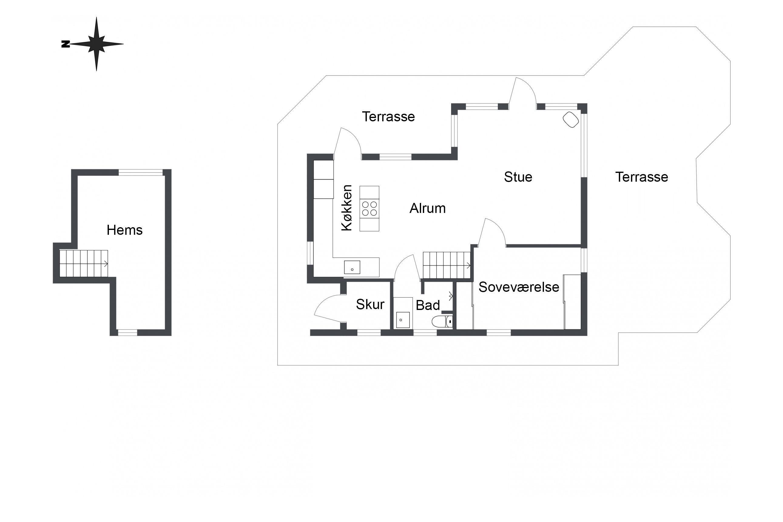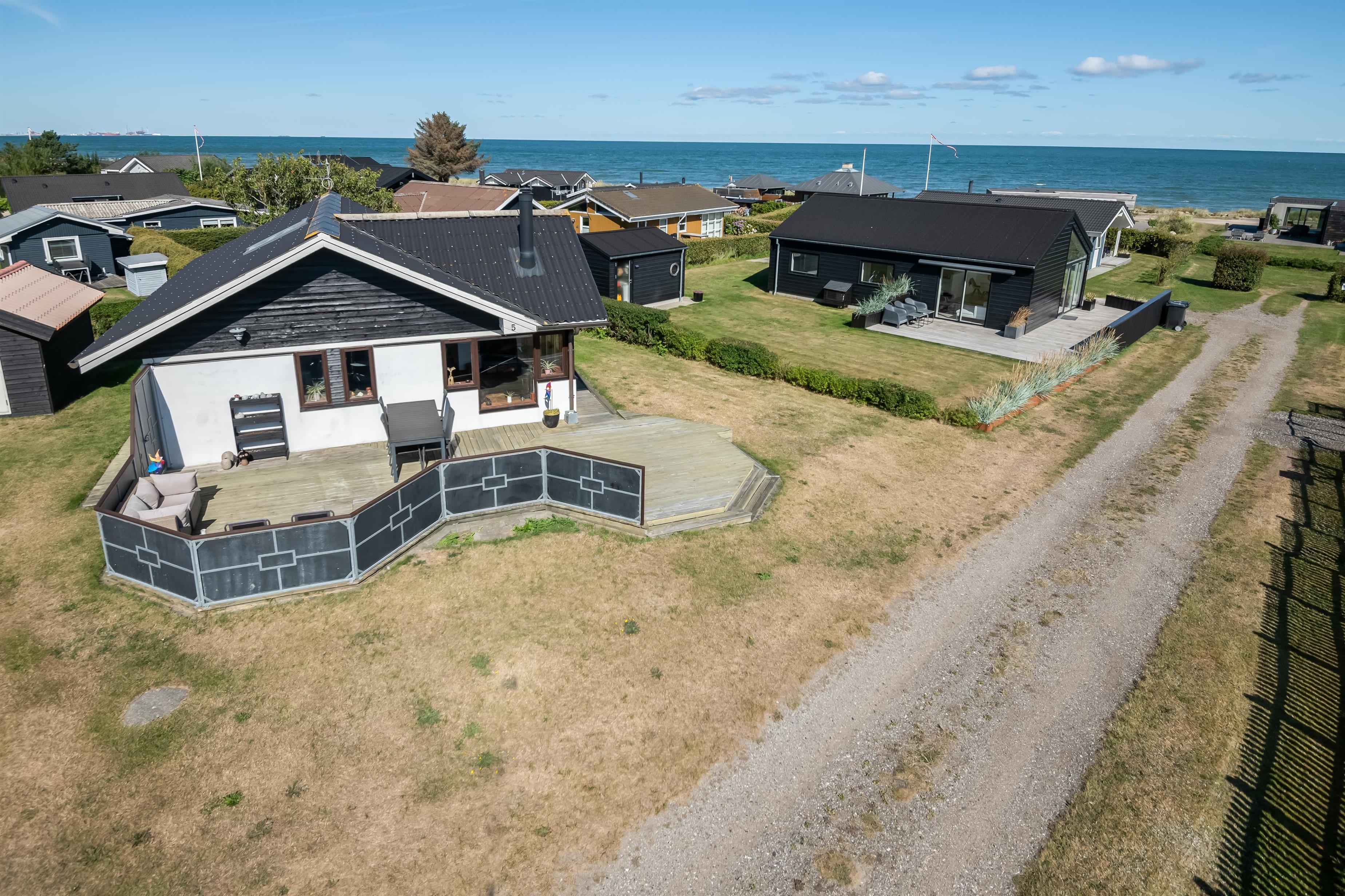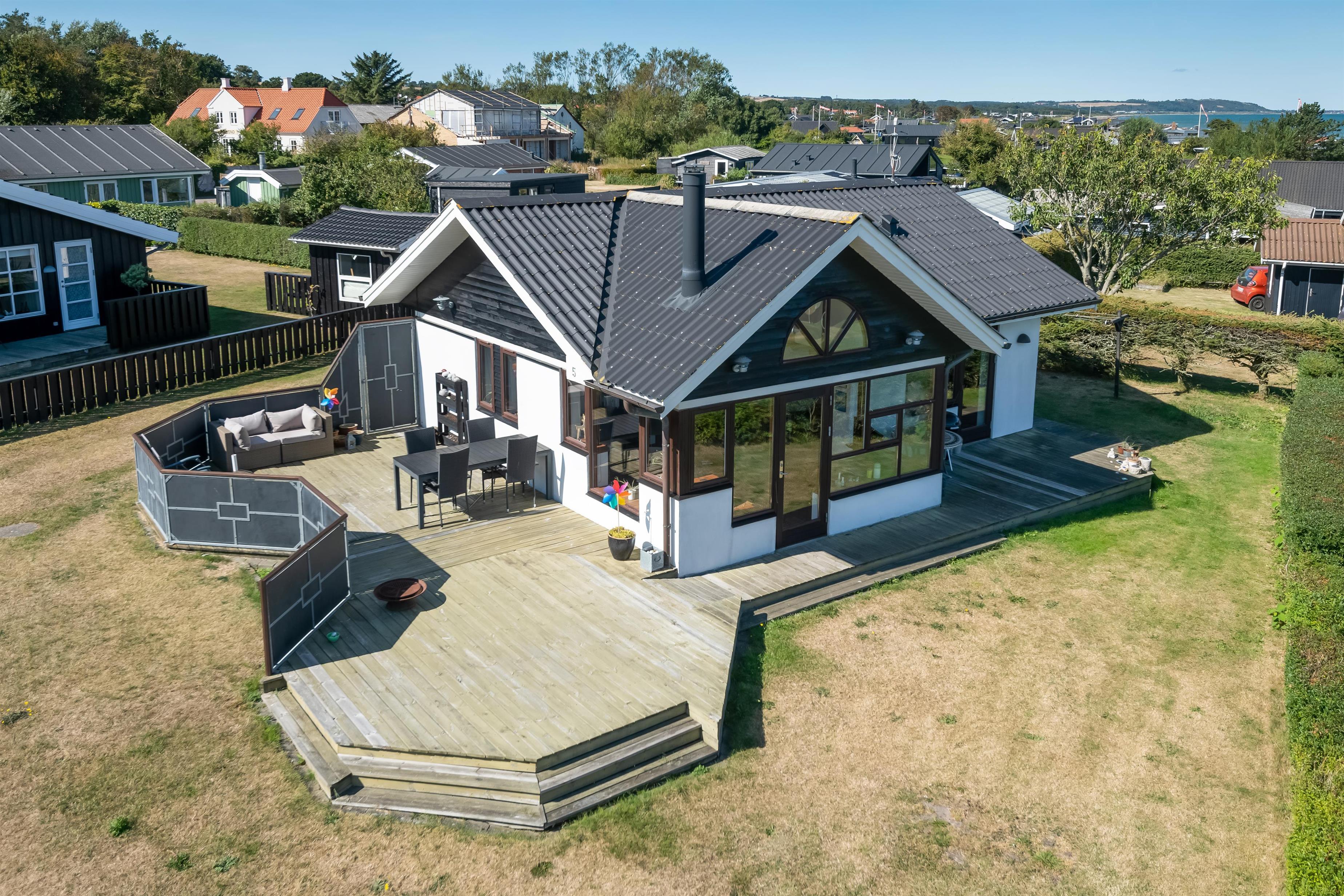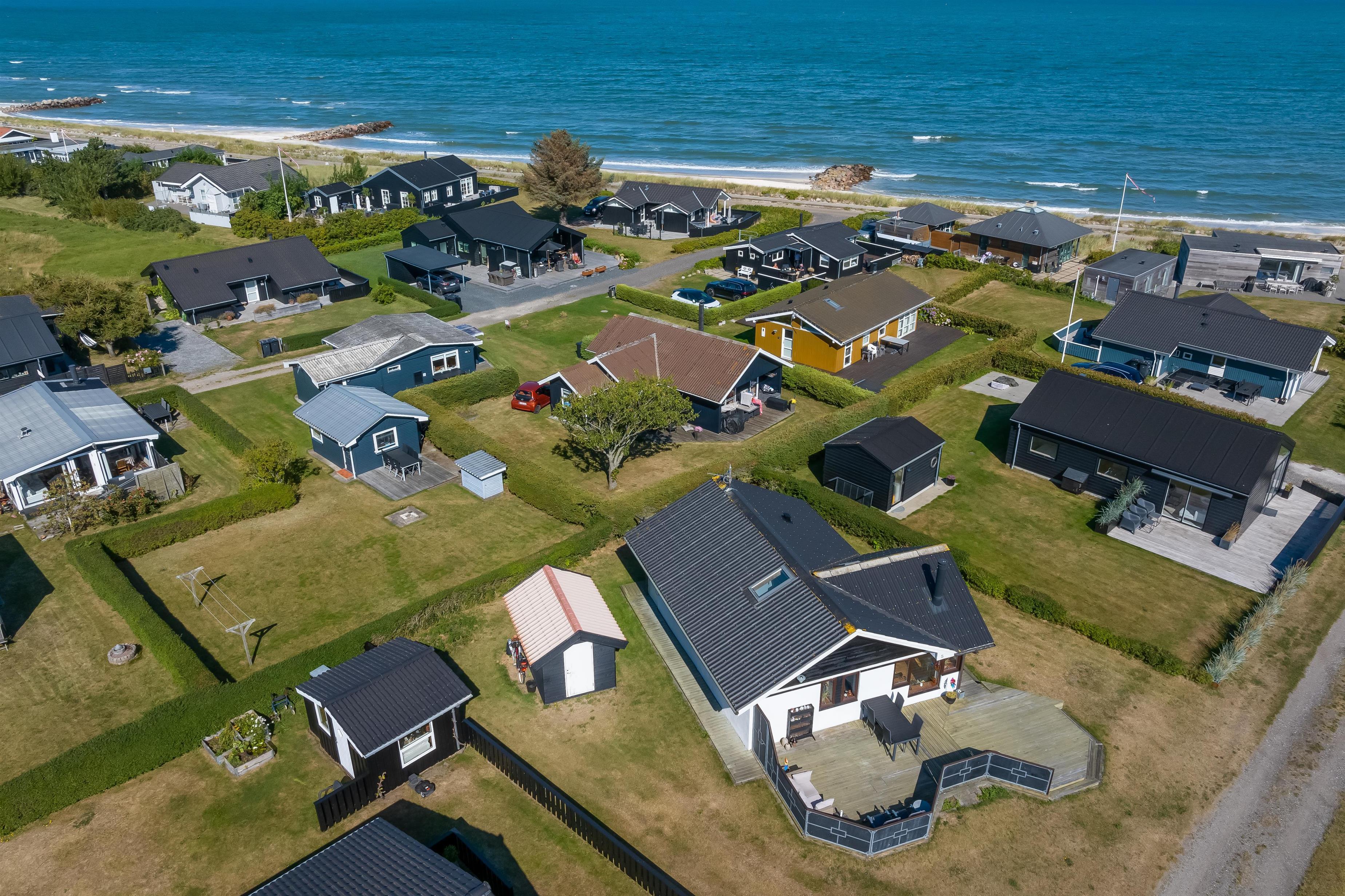 Køkken og stue går ud i et, med et super flot maritimt look, der skabes med skibsgulve, trækøkken, trædøre, træ/metal trappe og indretningen generelt. Rundt hele huset er der en dejlig stor træterrasse, med flere sidekroge og udgange både fra stue og køkken. Fra indkørslen er terrassen lavet sådan, at man kan, kører op med en kørestol, dog er der et små dørtrin ind/ud af huset. På bagsiden af huset er der en udebruser, så sandet nemt kan skyldes af efter en tur på den nærliggende sandstrand med blåt badeflag.