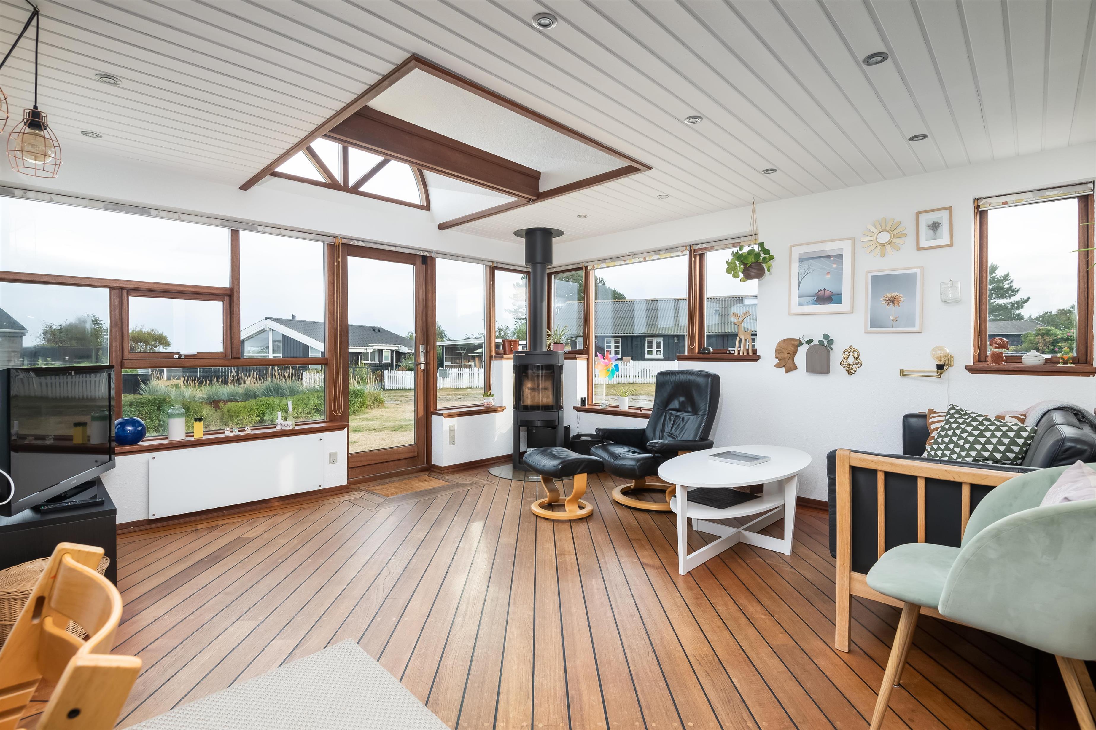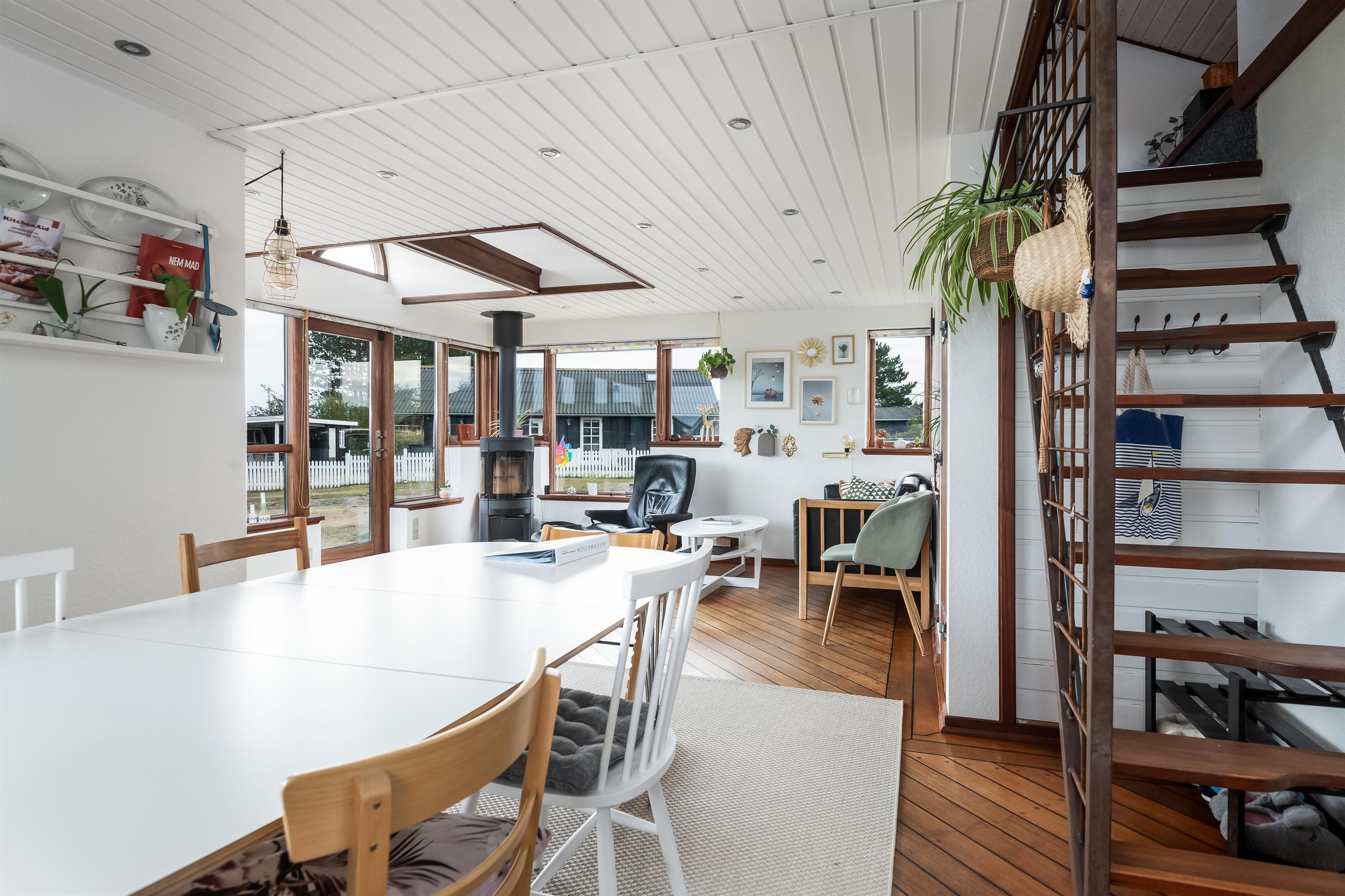 Stuen rummer sofagruppe med plads til hygge og brætspil og en dejlig brændeovn til de kølige sensommeraftner. De dejlige store vinduer med udsigt til omgivelserne og terrassen, gør at det intime hus ikke virker småt og klemt.