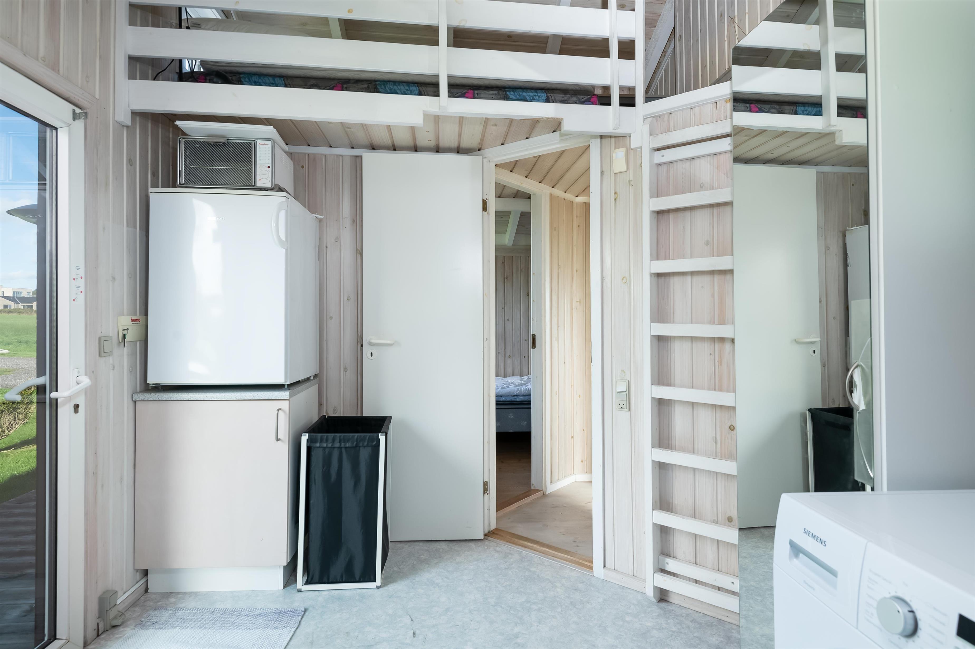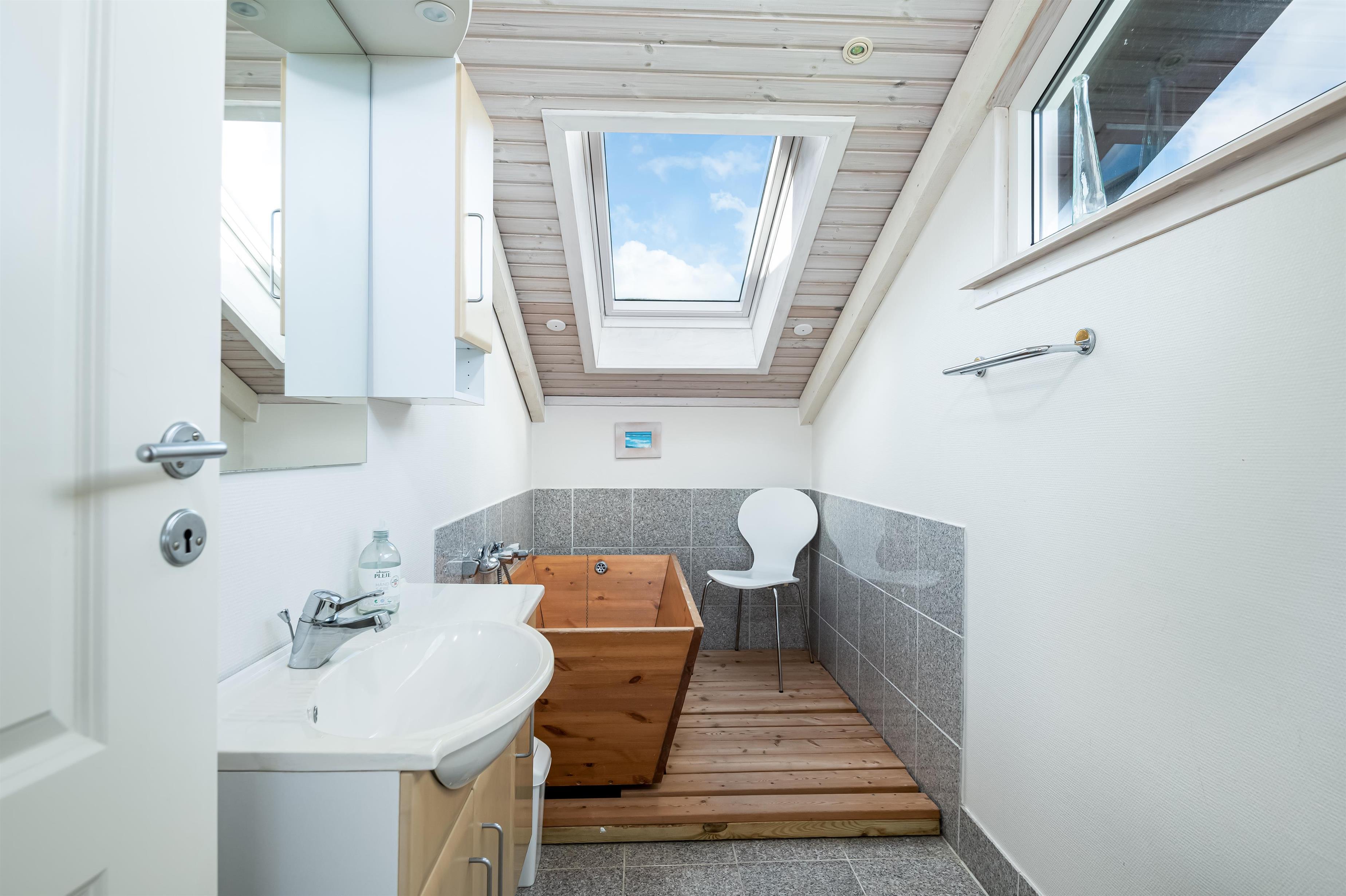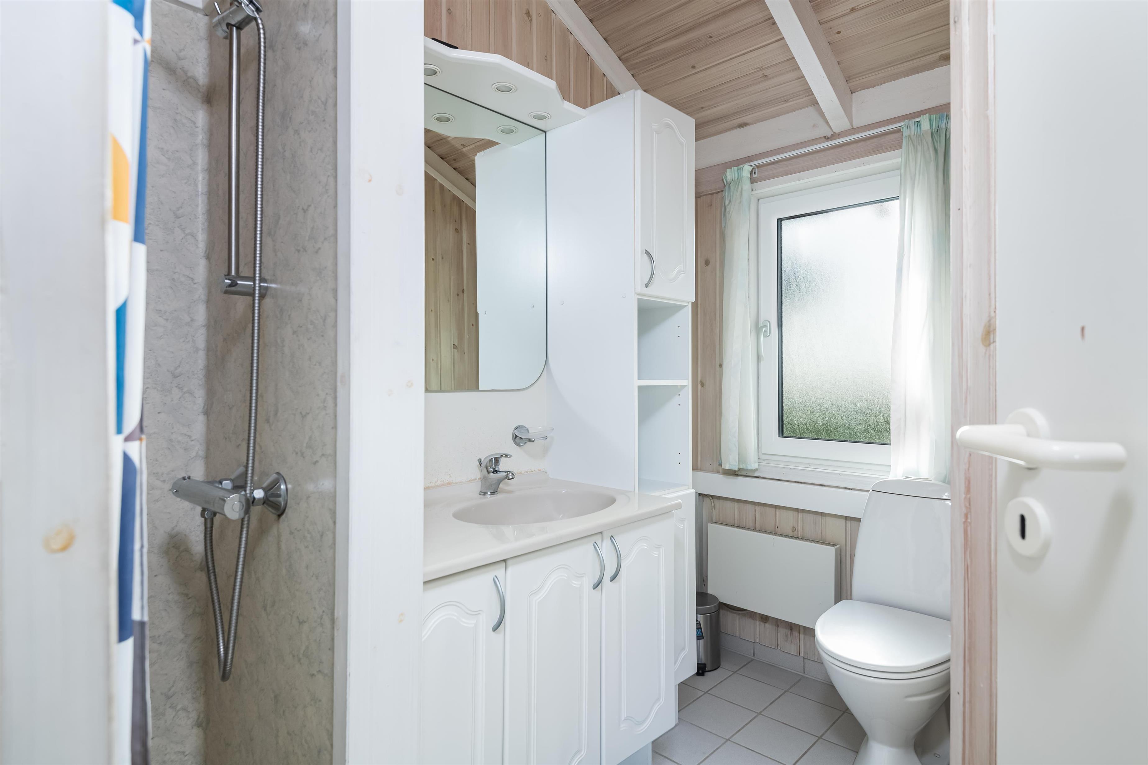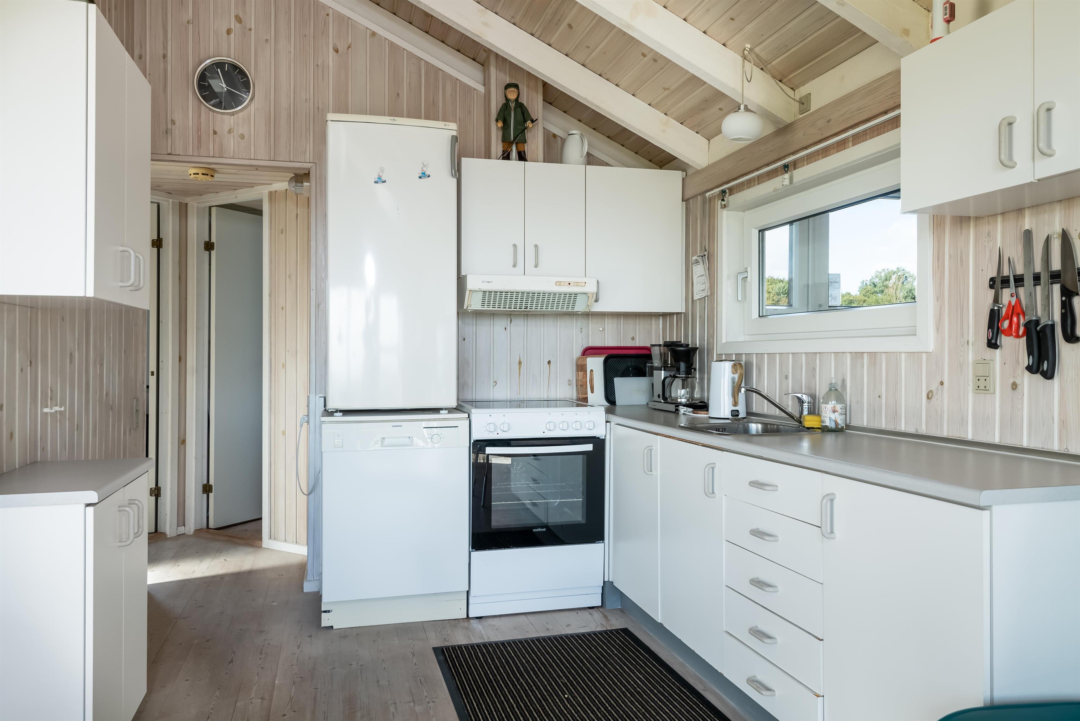 Køkkenet er enkelt, men godt indrettet og her er alt, hvad der skal bruges af faciliteter til forberedelse af jeres dejlige feriemåltider. Komfur, køleskab med frost og opvaskemaskine. Der er også vaskemaskine og fryser i huset, hvis I får brug for det. Det er et hus med loft til kip og synlige hvide bjælker. Det har en pæn og enkel indretning. Der er 2 badeværelser og det ene har badekar og adgang direkte fra soveværelse og i det andet er der en bruseniche.