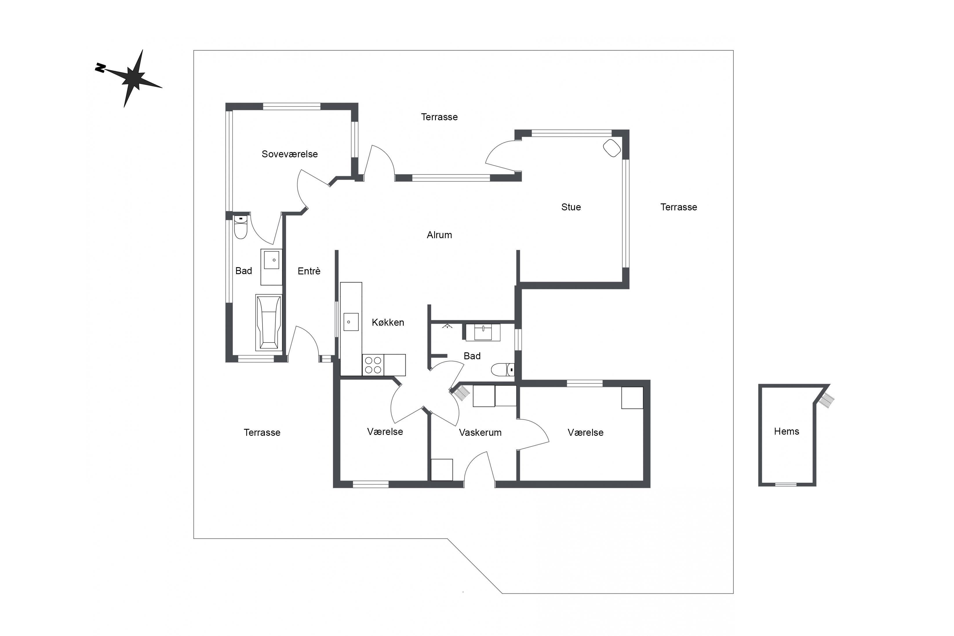 En terrassedør i køkken alrum fører jer direkte ud til skøn træterrasse, som løber hele vejen rundt om feriehuset. Her er havemøbler og kulgrill, så I kan nyde sommerens solskinsdage og gode grillstunder.