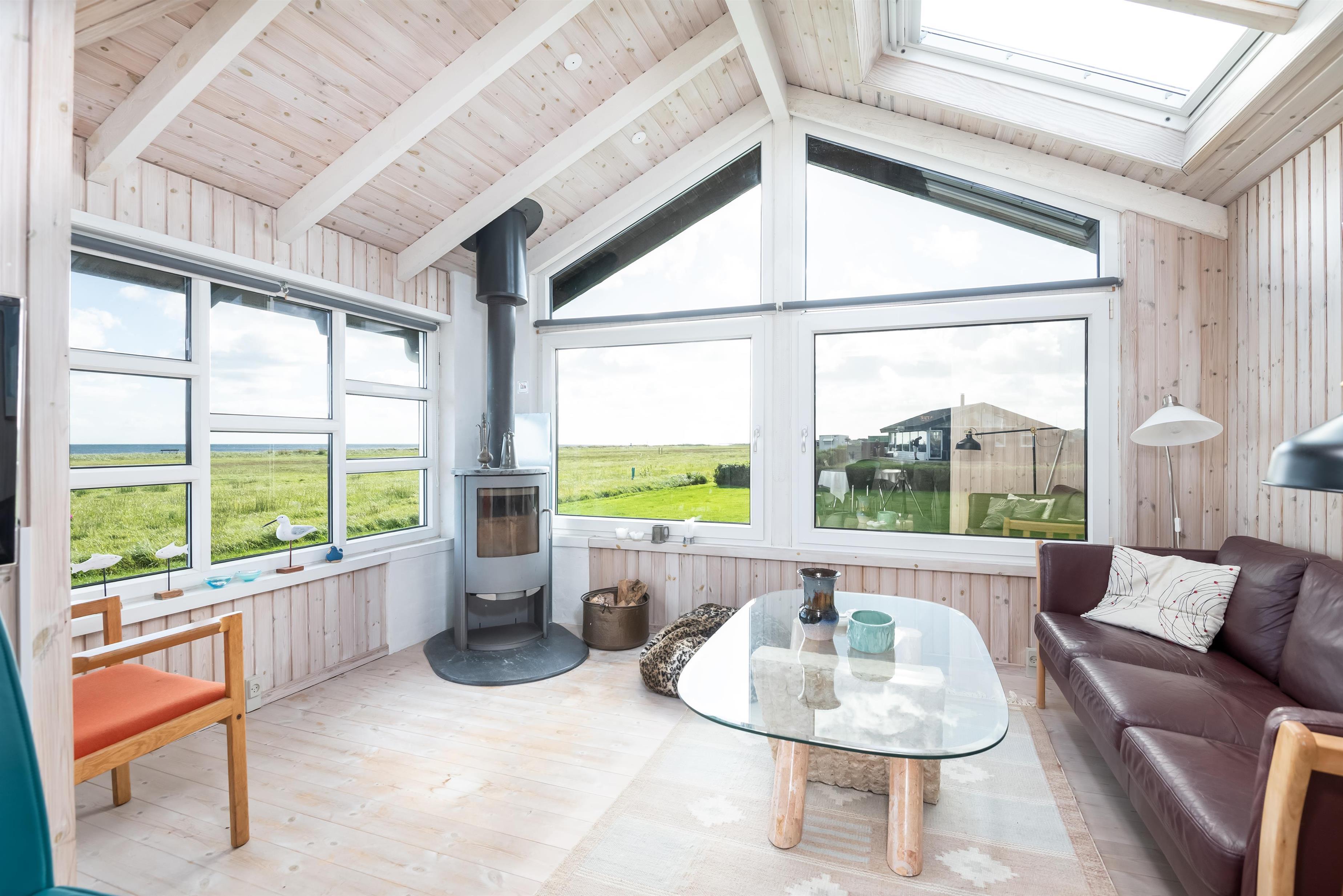 Køkkenet går ud i et med spisestue og stuen ligger i sin egne lille sektion "udestue". Her kan du sidde og nyde varmen fra brændeovnen og en fantastisk havudsigt over Kattegat, der kun ligger 80 meter fra huset. Da det er en østvendt kyst, vil I hver morgen kunne se de smukkeste solopgange og via lille sti har I mulighed for badeture i frisk havvand på den flotte sandstrand. I har også mulighed for at fange middagens friske fisk fra kysten - der er mange lystfiskere på denne strækning.