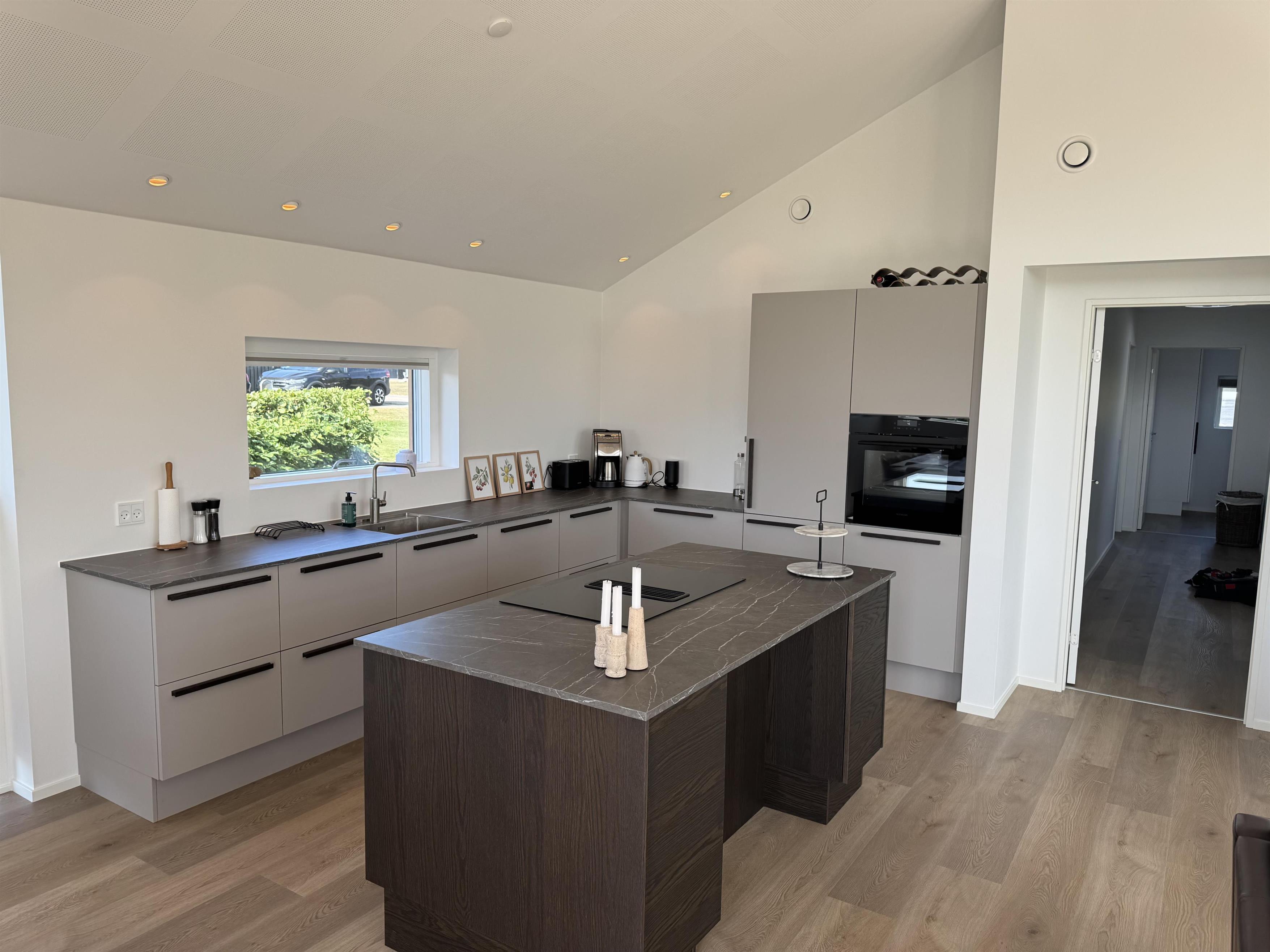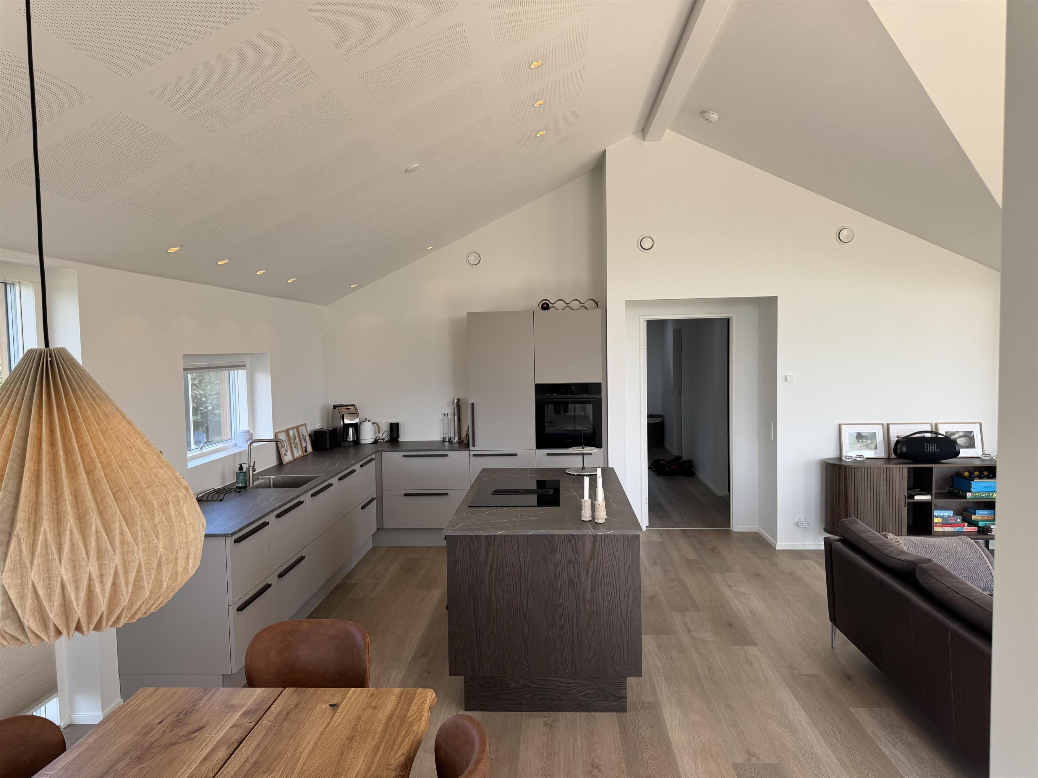 Alrummet er rummeligt, højt til loftet og lyst indrettet, med stort vinduesparti vendt mod havet. Derudover er der sofagruppe og spiseområde i tæt forbindelse med køkkenet og tilhørerende køkken ø, der indbyder til hyggelige timer og god mad. Huset er udstyret med kølefryseskab, opvaskemaskine, vaskemaskine og tørretumbler.