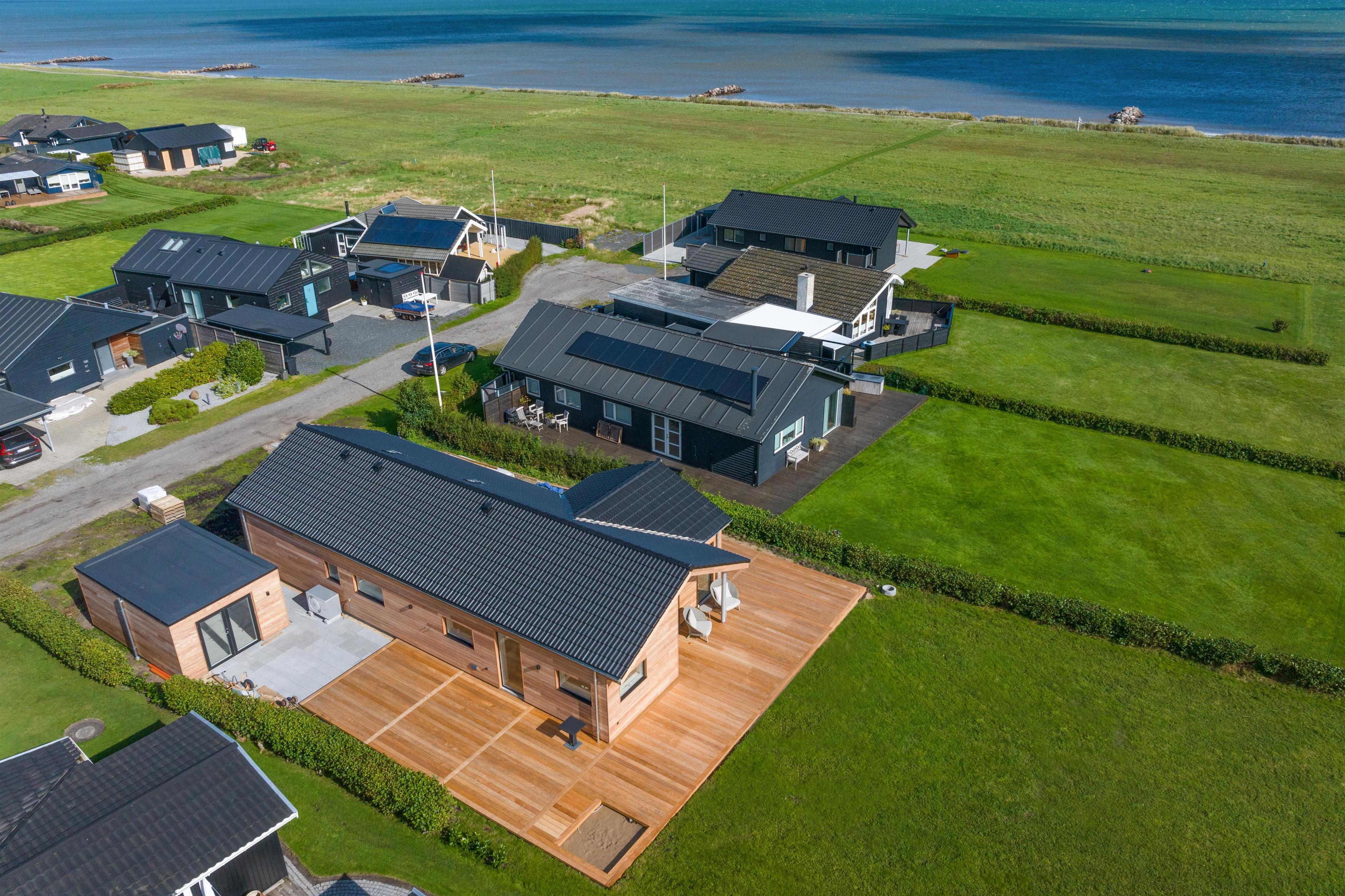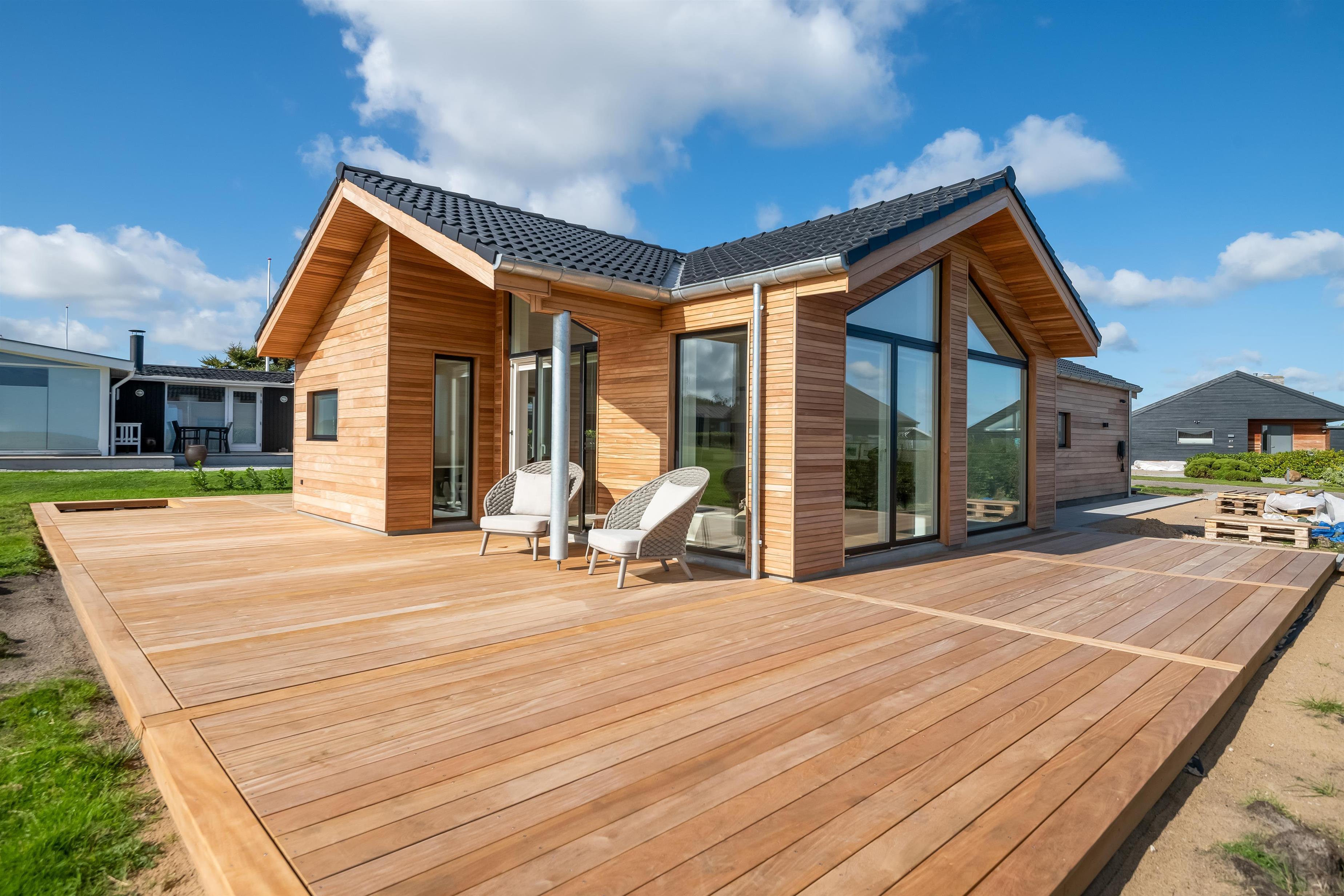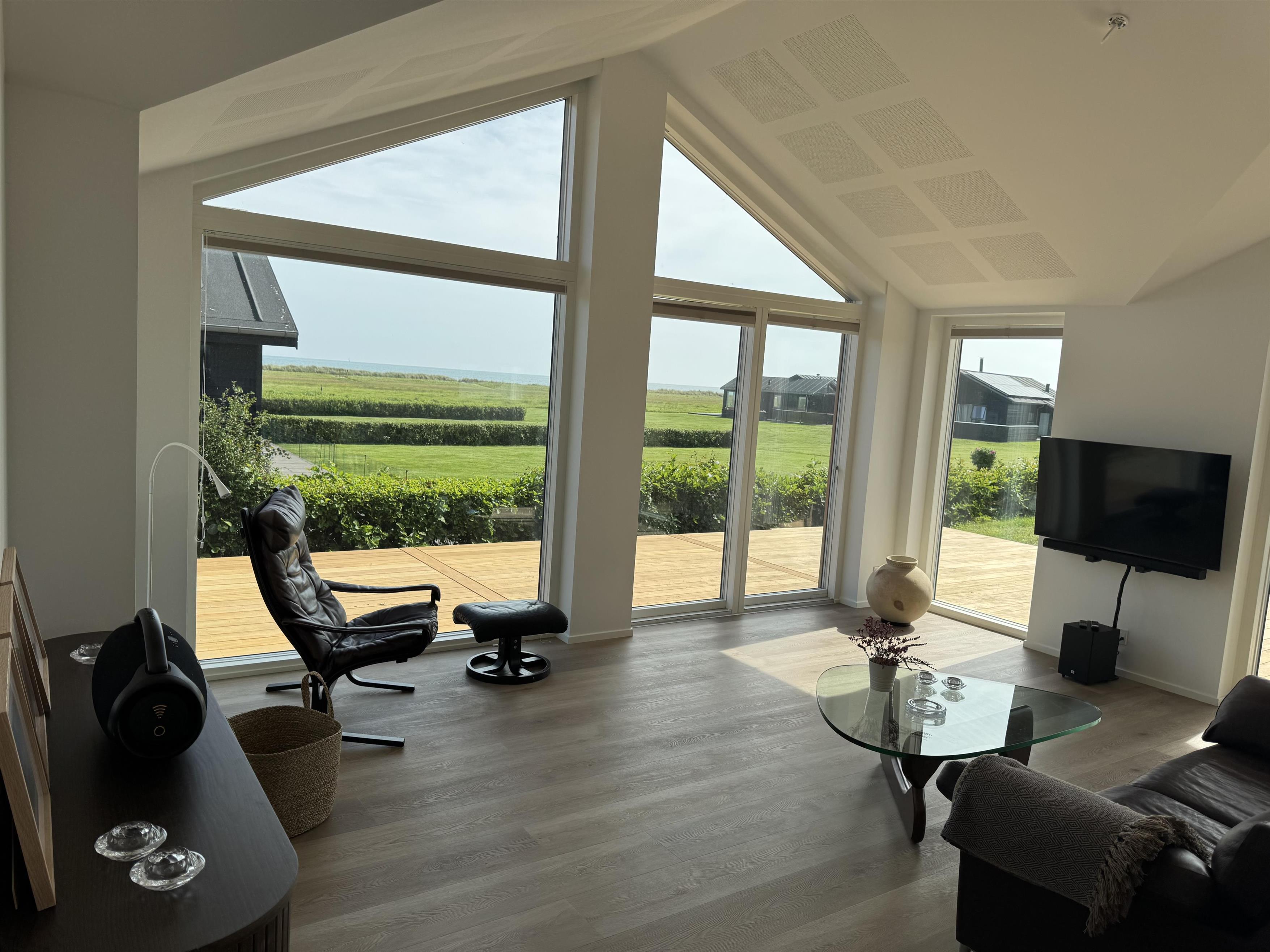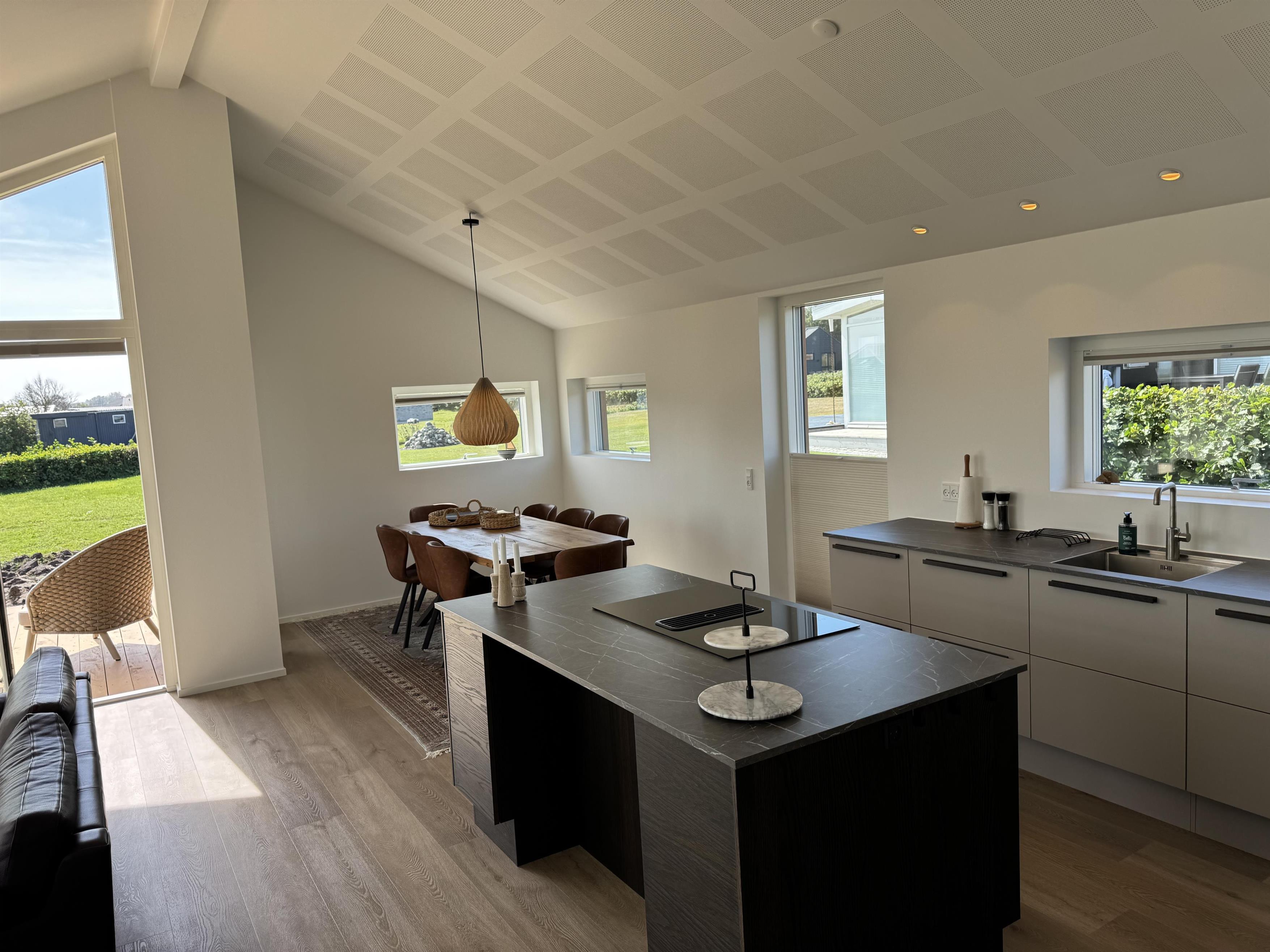 Dette dejlige træsommerhus er opført i 2025 og indeholder store lyse rum og udkig til havet, der blot ligger 150 meter væk.