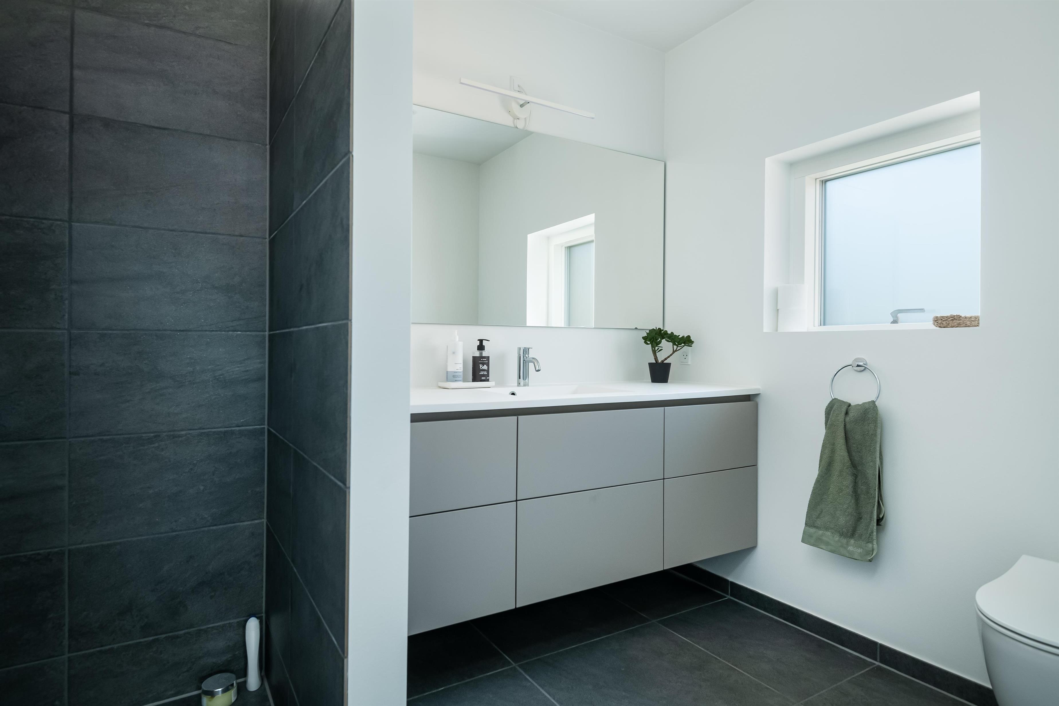 Fra alrummet går der en fordelingsgang, der rummer adgangen til entré, to badeværelser samt tre gode værelser. To af værelserne med dobbelt seng, og det sidste værelse er med køjeseng, hvor den nederste køje er en ¾ seng.