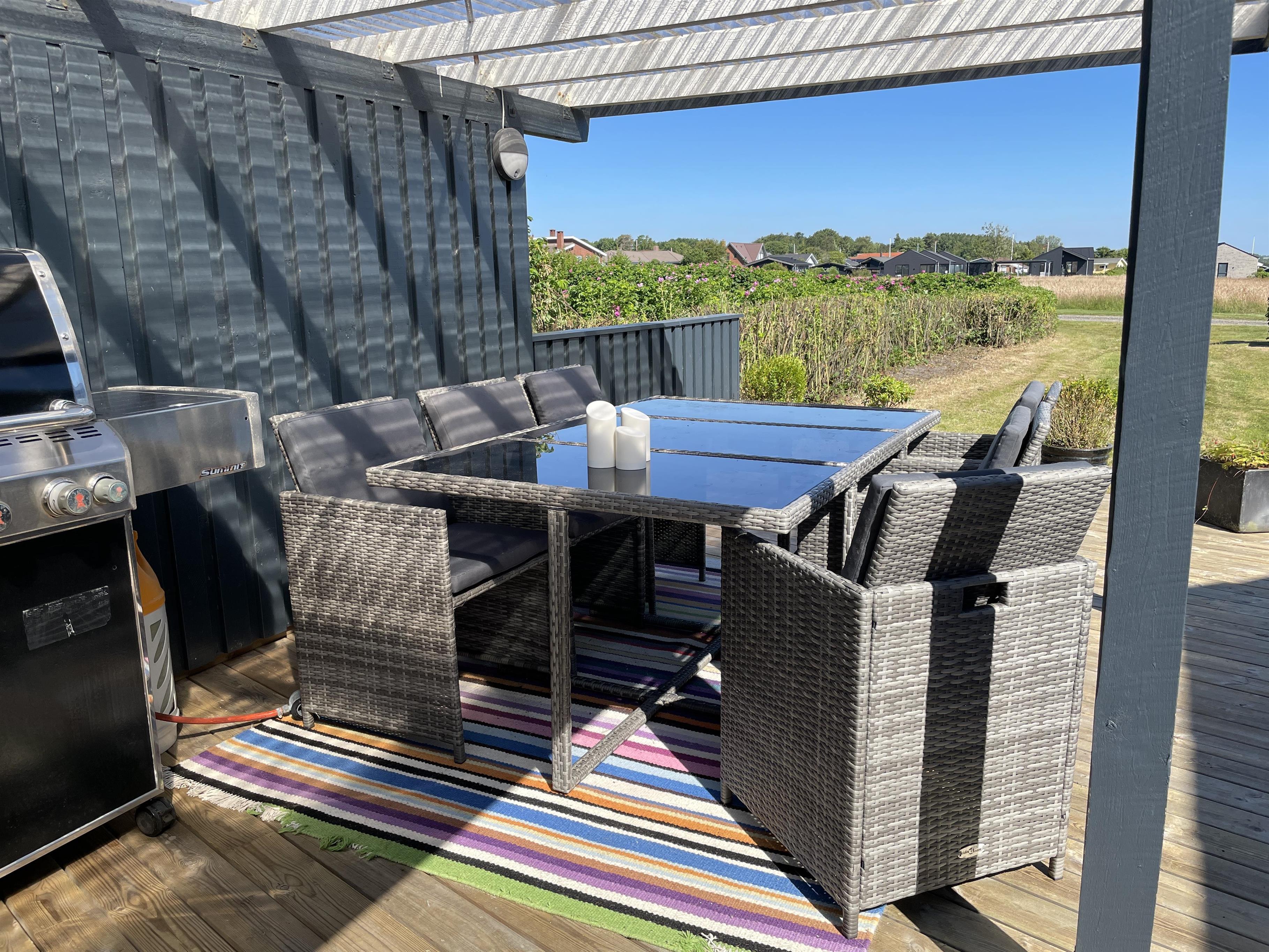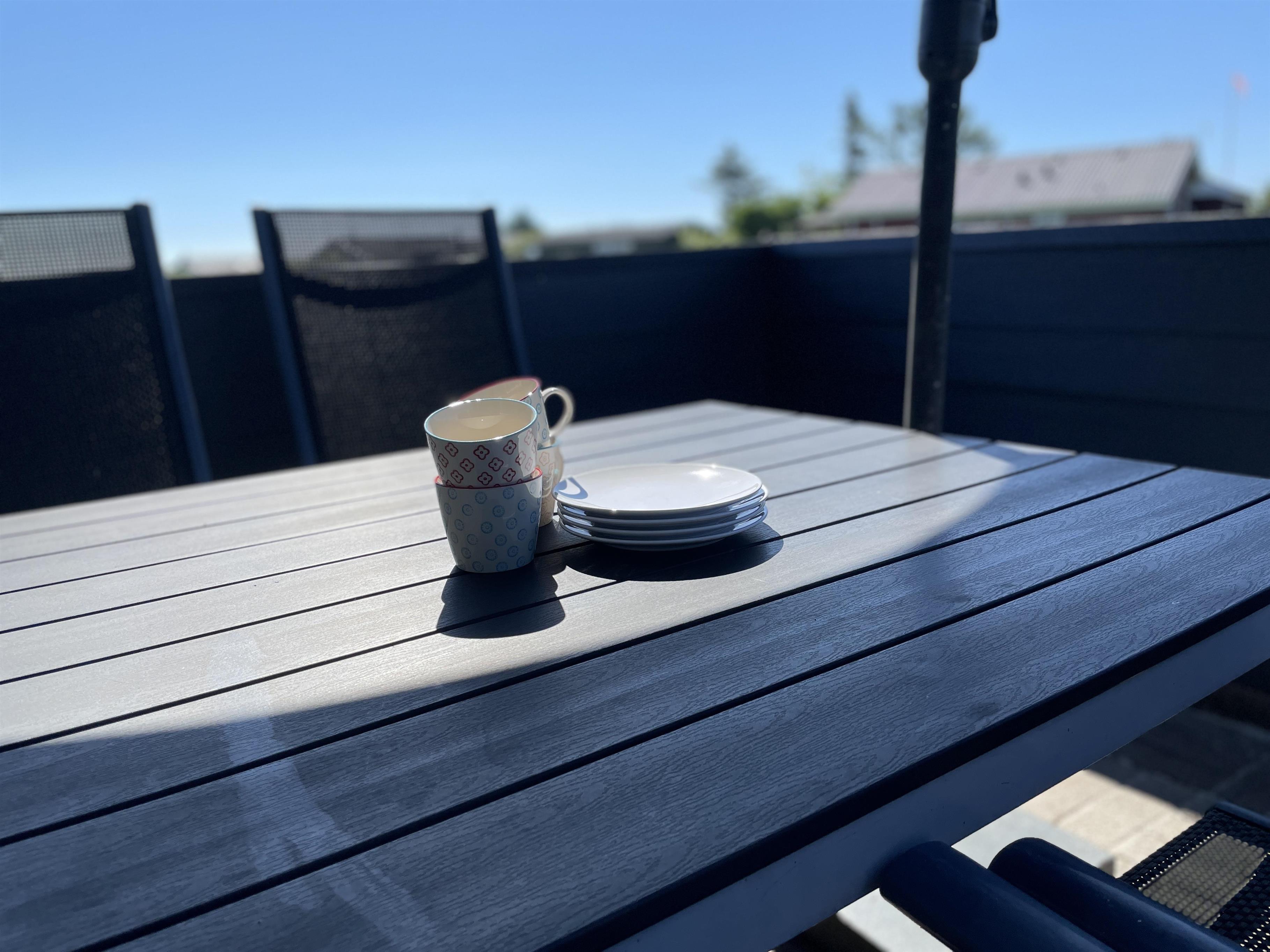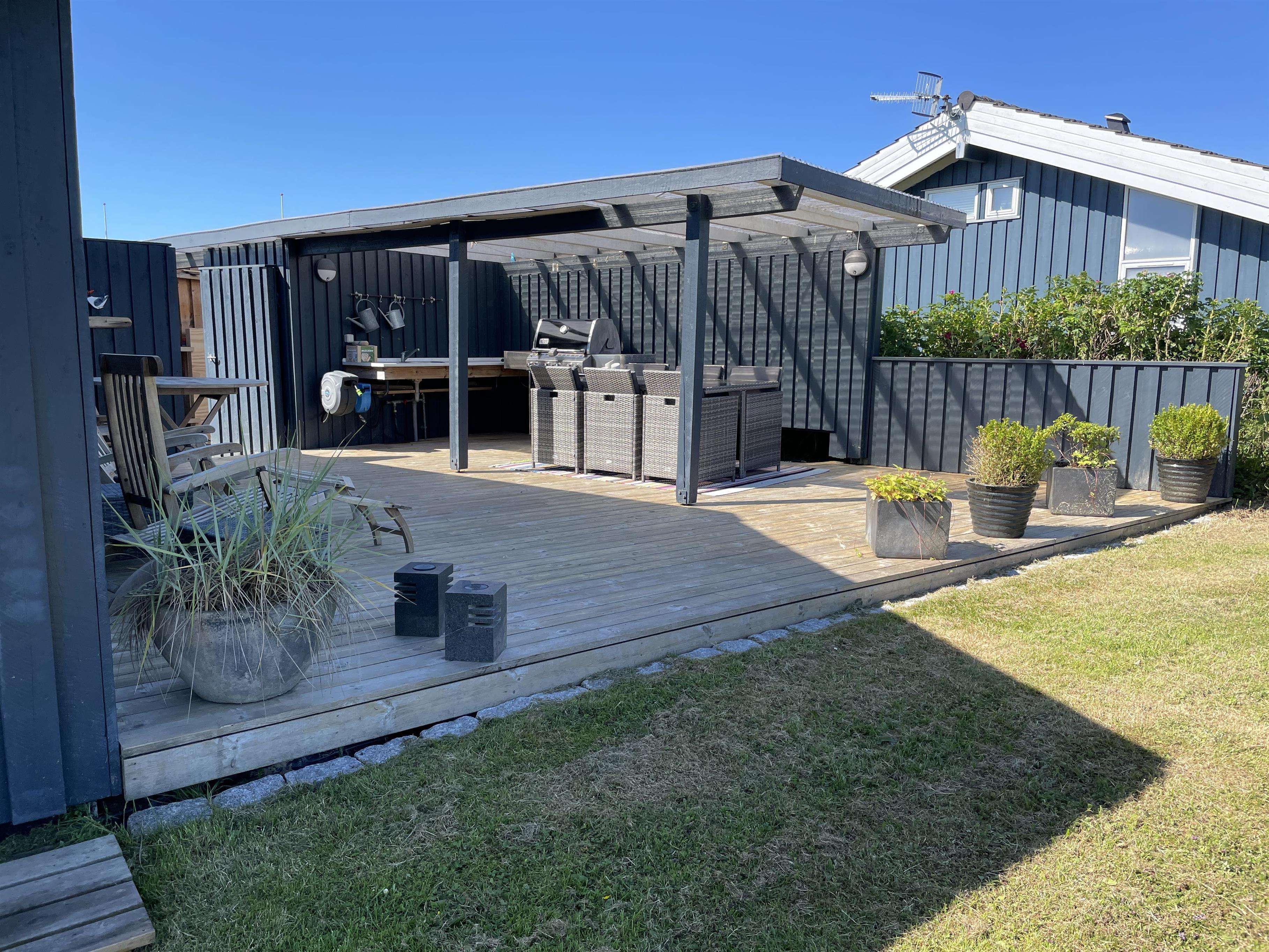 En terrasse giver mulighed for at nyde morgensolen, og en anden stor nyere træterrasse med overdækning giver mulighed for at nyde de sene eftermiddage og aftensolen. Her er et udekøkken med vand installeret, og et nyt spisebord med stole til, så her kan I nyde jeres sommerretter og blive ude selvom duggen falder.