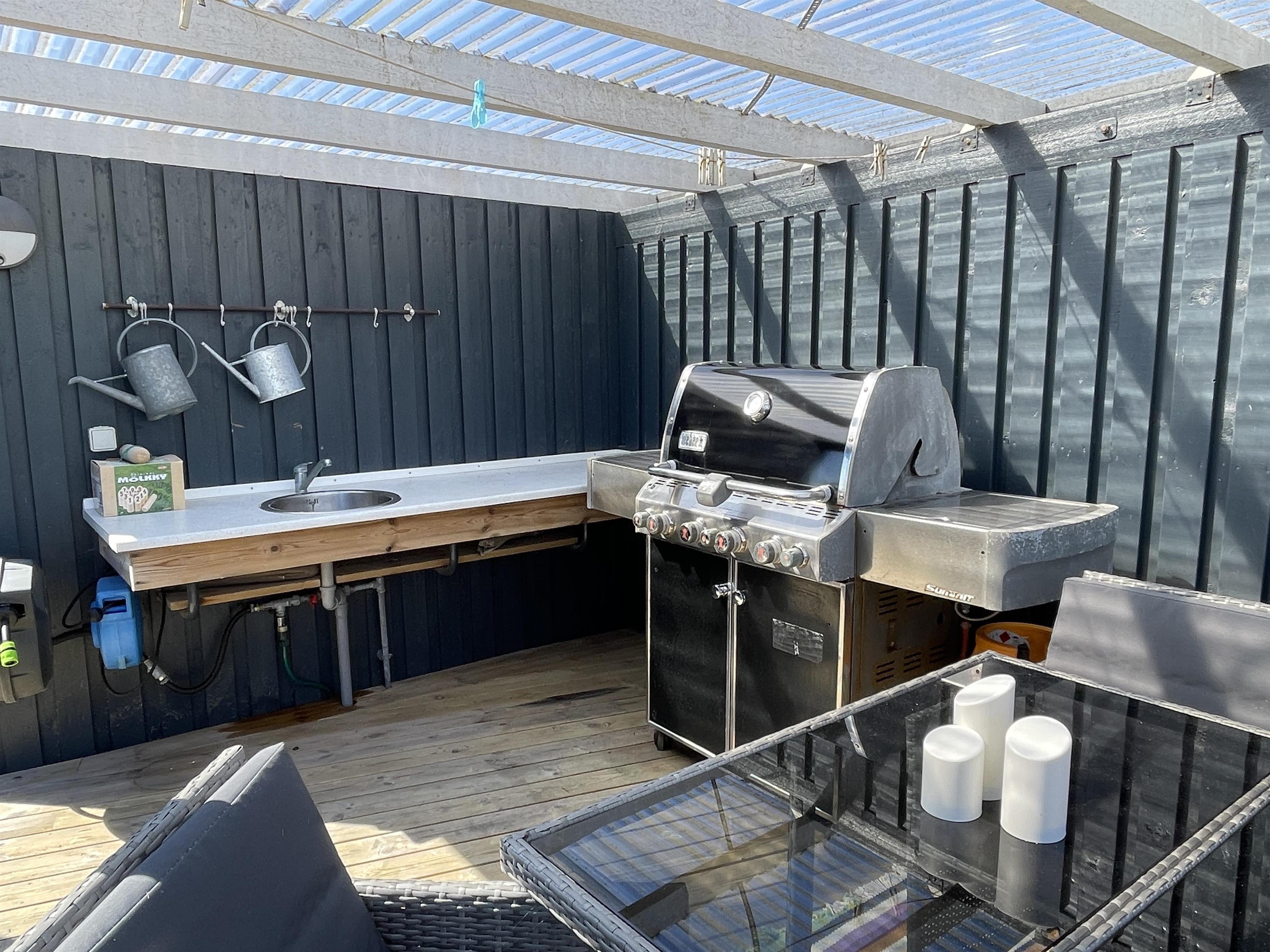 Der er udebruser og udekøkken med vand i forbindelse med aftenterrassen.
