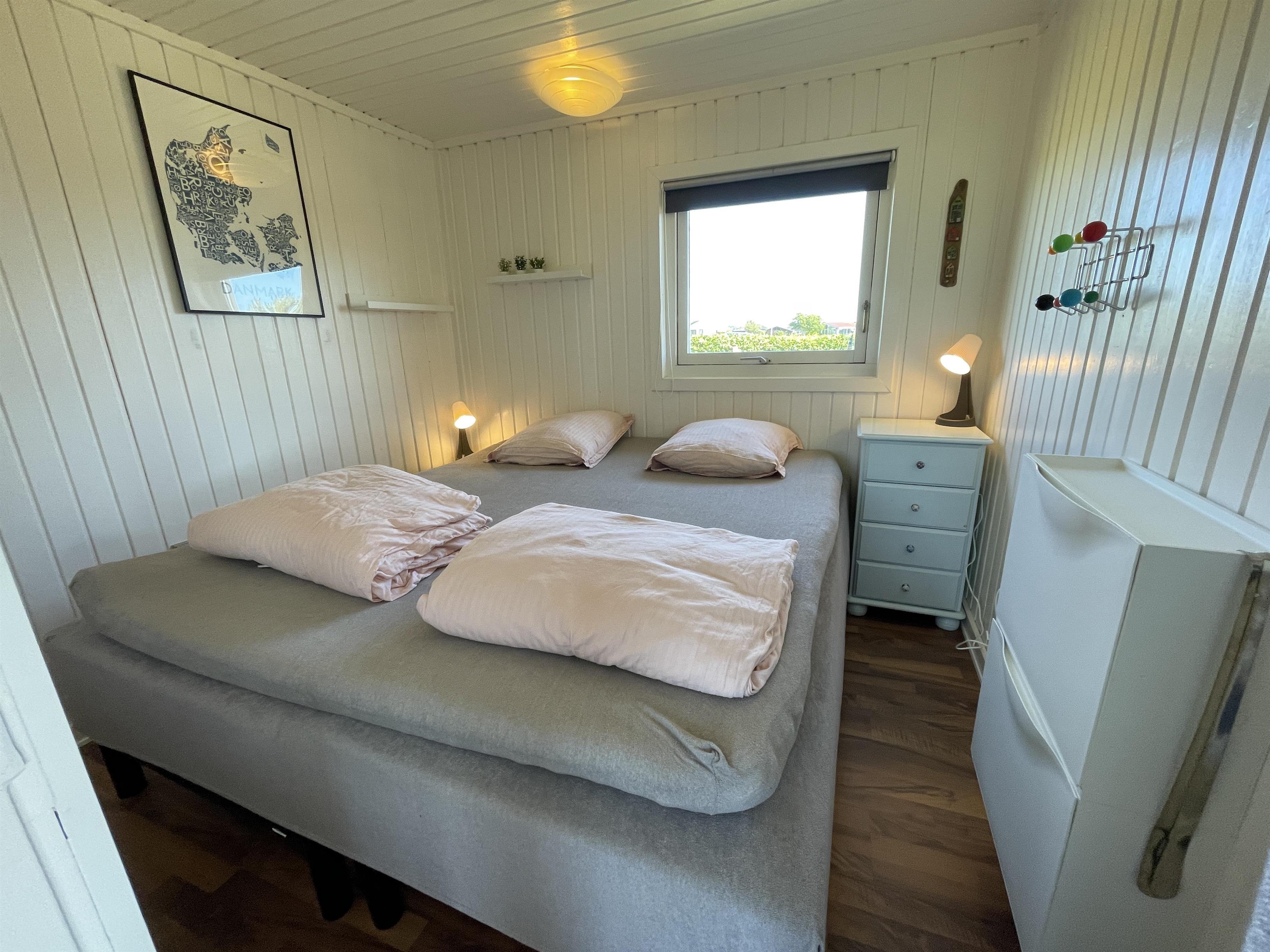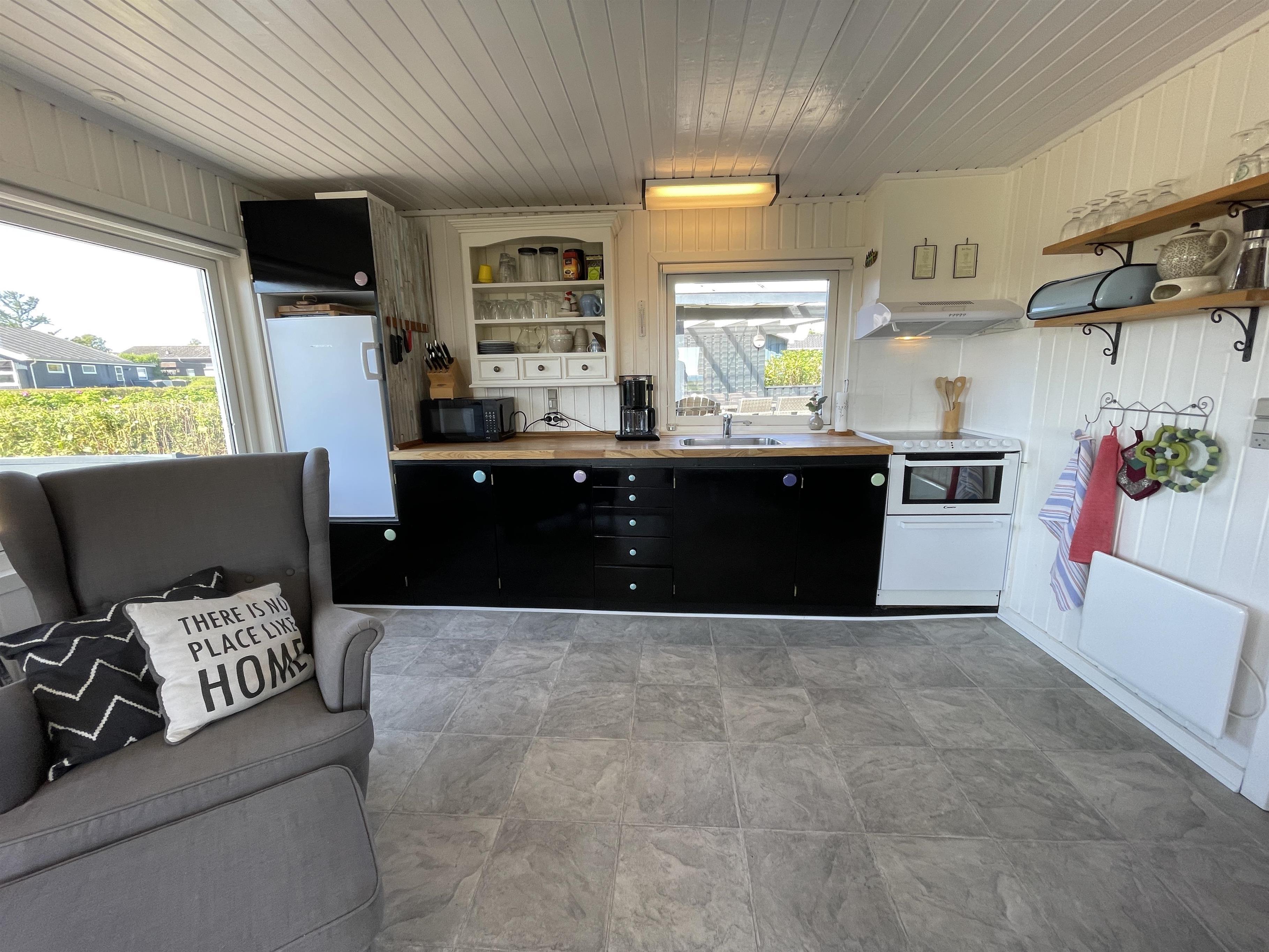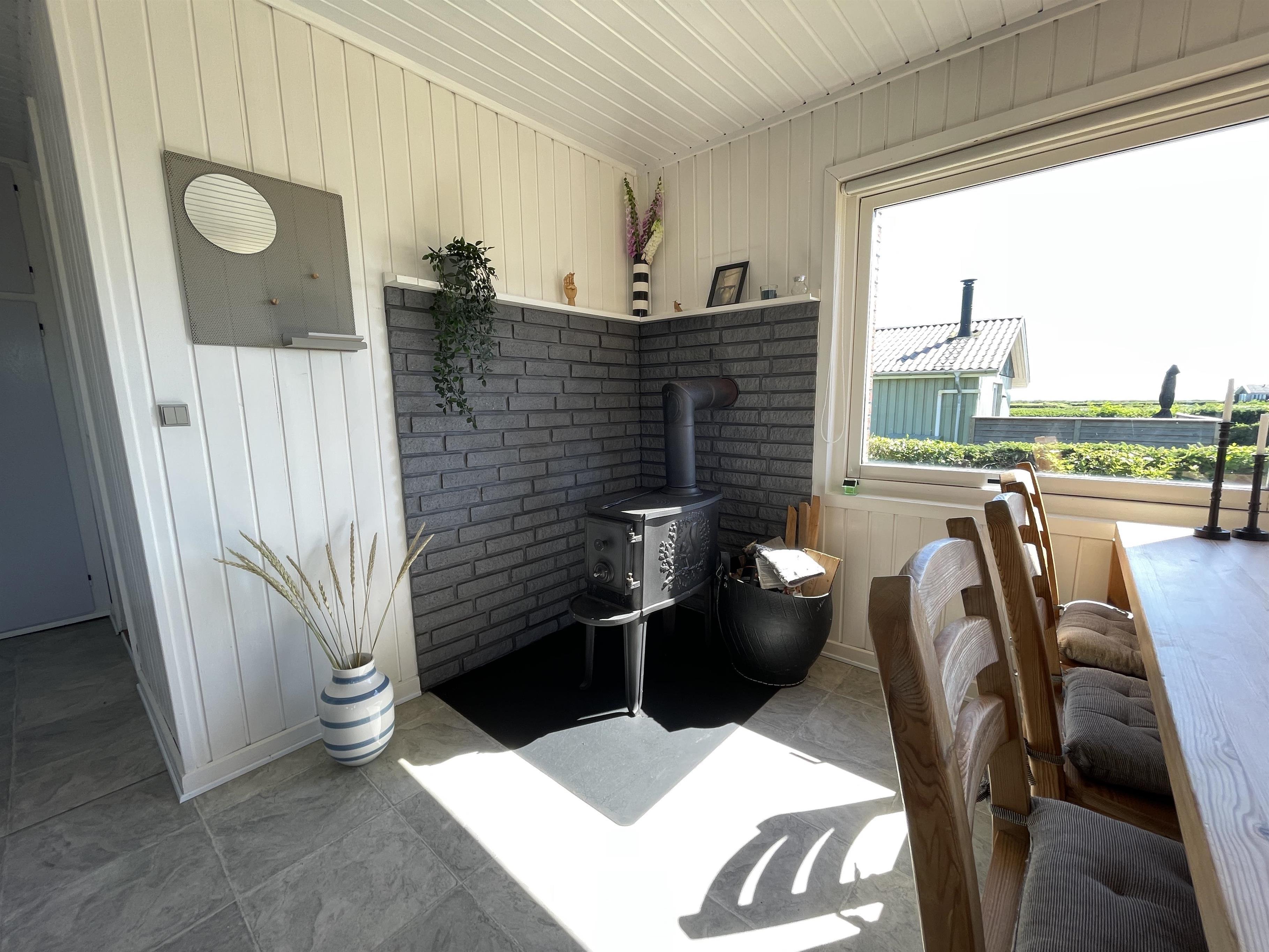 Der er 2 værelser i hver sin ende af huset med plads til ialt 4 personer. Køkkenet er pænt, og der er alt, som skal bruges, når sommermaden skal laves og anrettes. Køkken, stue og spisebord hænger godt sammen i et stort og lyst rum, med en brændeovn i det ene hjørne. Der er en behagelig sofa samt en god lænestol i stuen, og der er et flot spisebord i træ med en rigtig god udsigt til havet og til den berømte smukke strandpromenade, som fører ind til havnen i Sæby.