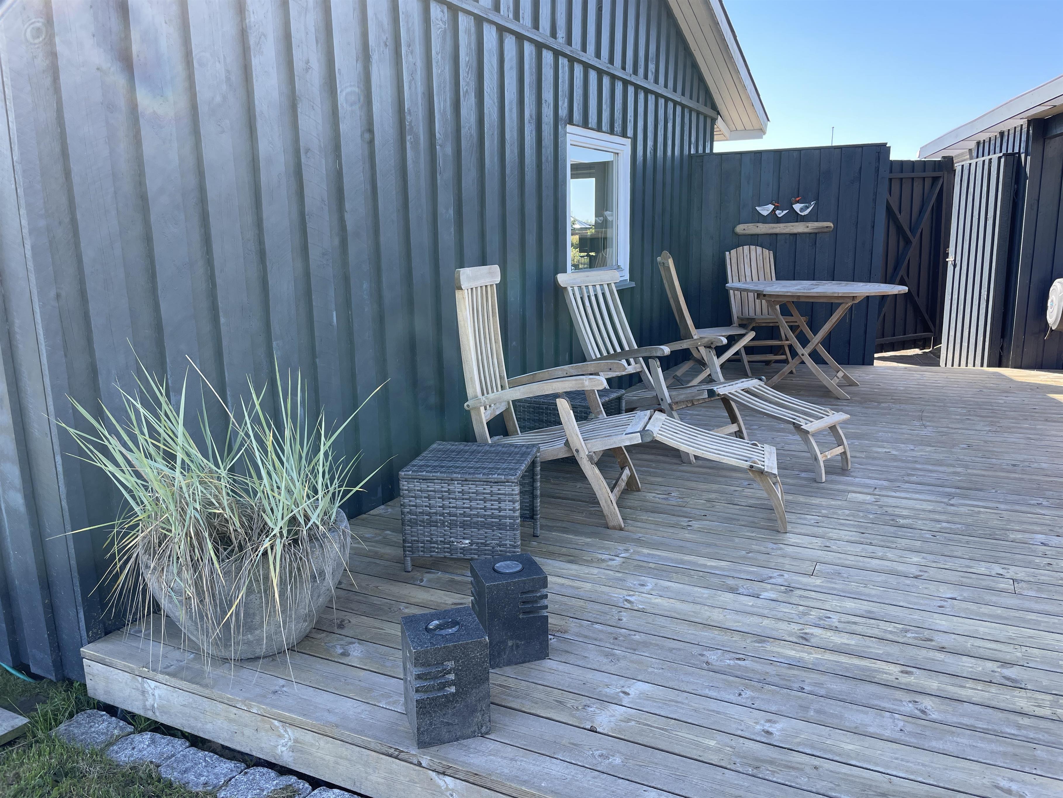 Er du til sol og sommer, eller hygge på en gråvejrsdag, så er dette den helt rigtige feriebolig, den kan nemlig begge dele med gode terrasser, udebruser og brændeovn!