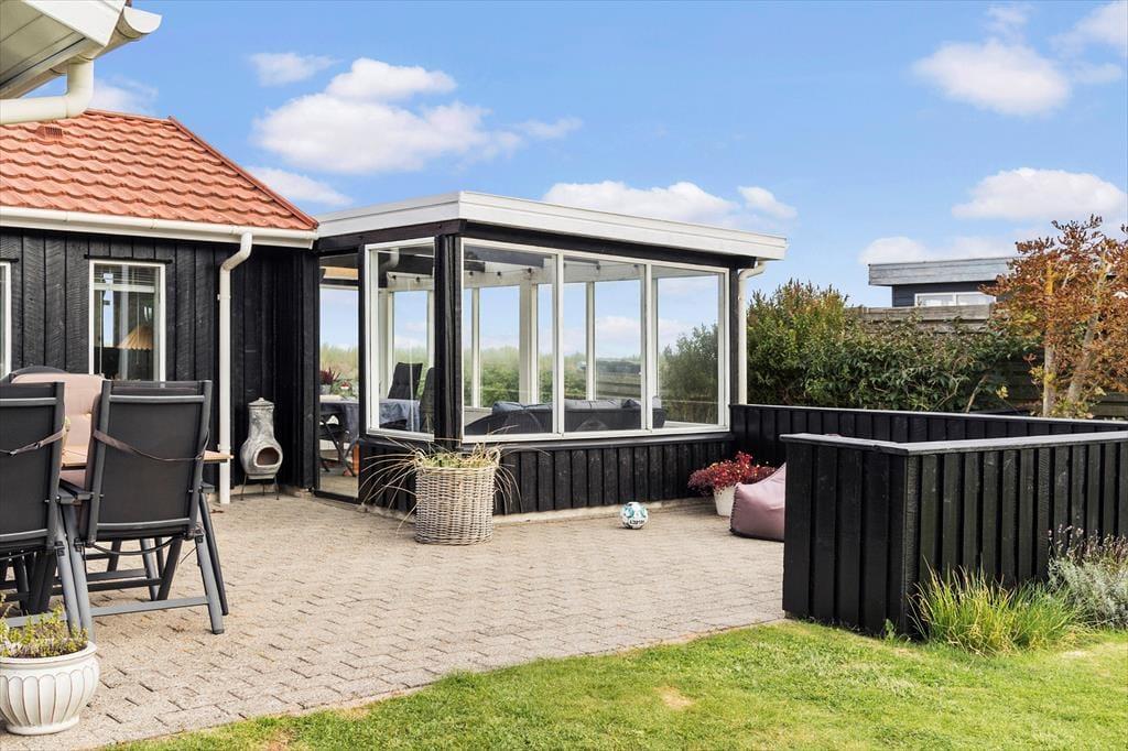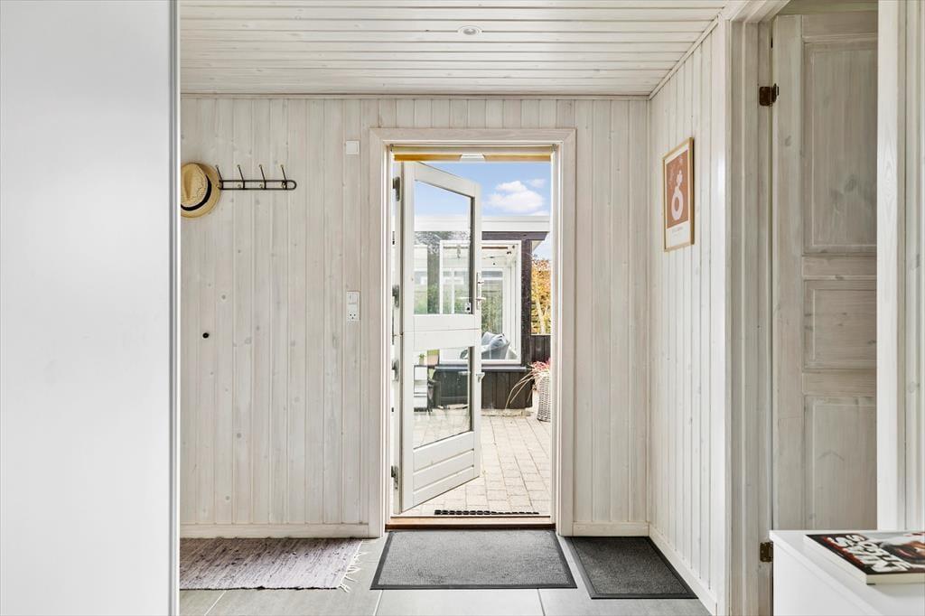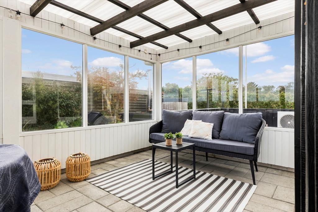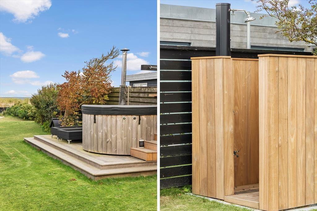Det er uden tvivl udendørs, at ferielivet vil udfolde sig til fulde. Sommerhuset har en stor terrasse med næsten direkte adgang til stranden, så du let kan tage en dukkert i Kattegat om morgenen. Når du kommer tilbage, kan du skylle saltvandet af dig under den udendørs bruser, inden du slapper af i det lækre vildmarksbad, hvor du kan nyde både havudsigten og himlen over dig. Terrassen er det perfekte sted at grille aftensmaden og dele de smukke solnedgange med dine nærmeste. Med flere udendørs siddepladser er der altid en krog med læ at finde, og hvis du har brug for lidt skygge, kan du trække ind i den dejlige udestue og fortsætte afslapningen.