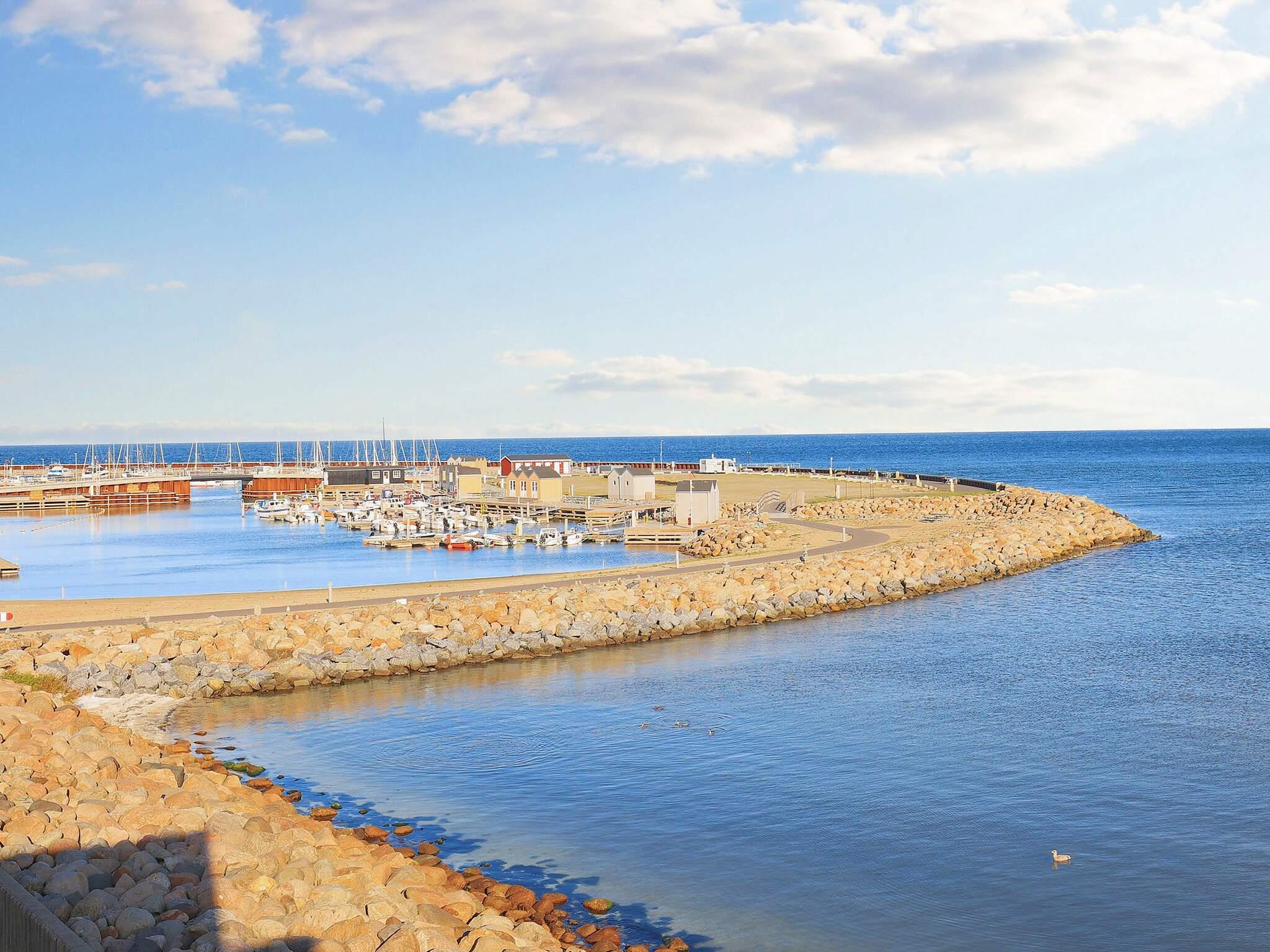 gå fra sommerhuset langs strandpromenaden til Sæby Havn, som er omgivet af byens