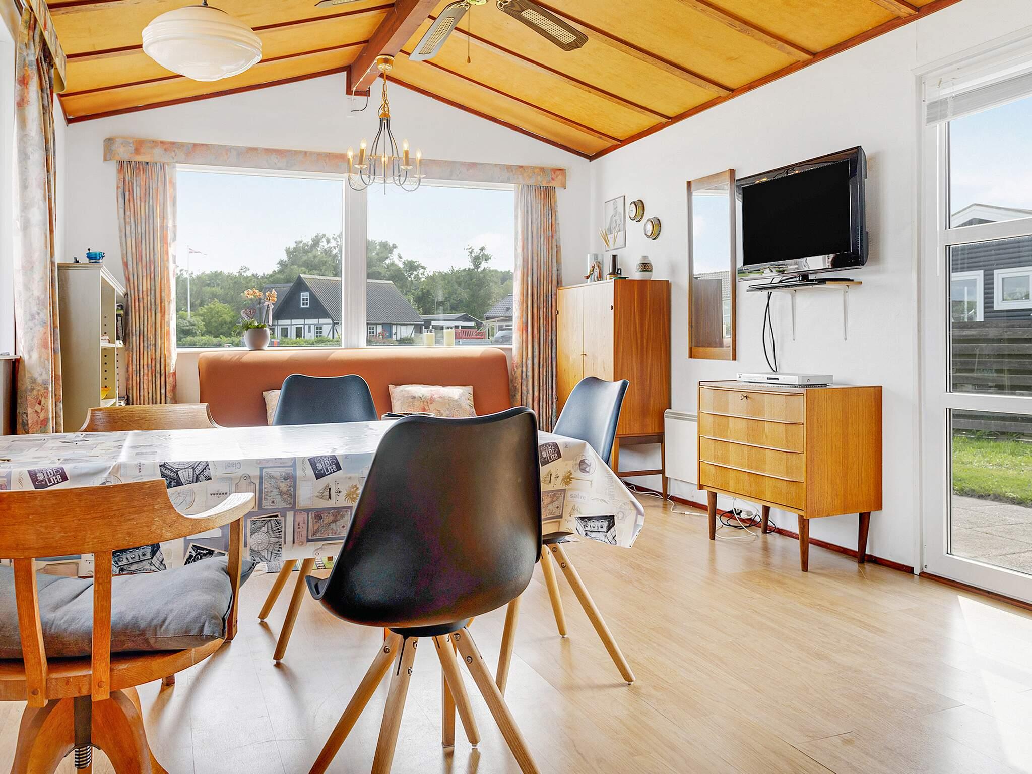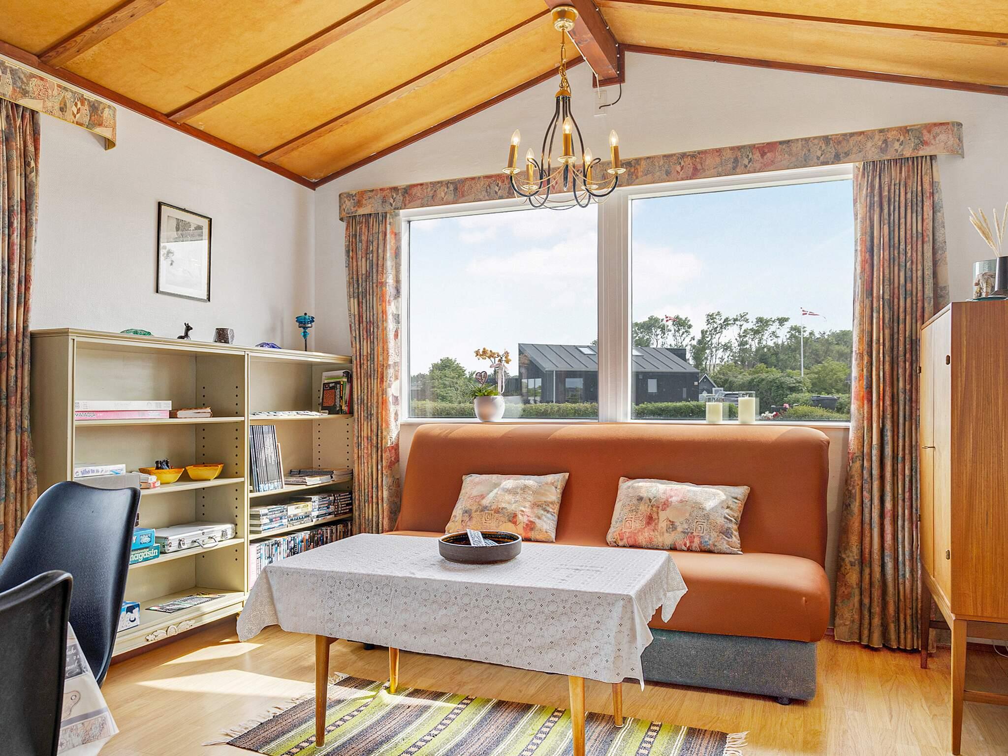 Sommerhuset har en enkel og funktionel indretning designet til ferieophold. I hjertet er det åbent køkken og opholdsstue med et spisebord og en sovesofa, hvilket gør det til et indbydende sted for familietid. Der er to små soveværelser: det ene med en køjeseng med to sovepladser og det andet med en 120 cm bred enkeltseng. Badeværelset er udstyret med bruser. Selvom det er beskedent i størrelse, har huset alt det nødvendige for en behagelig ferie ved havet.