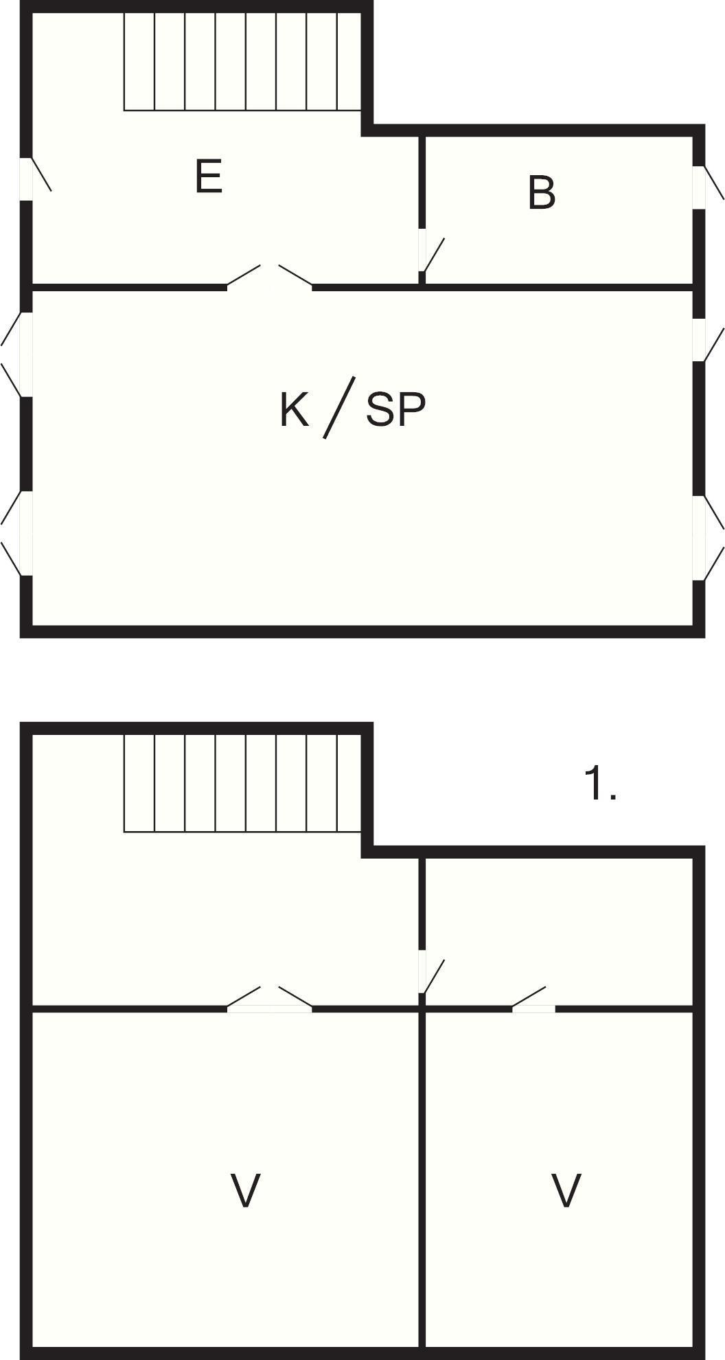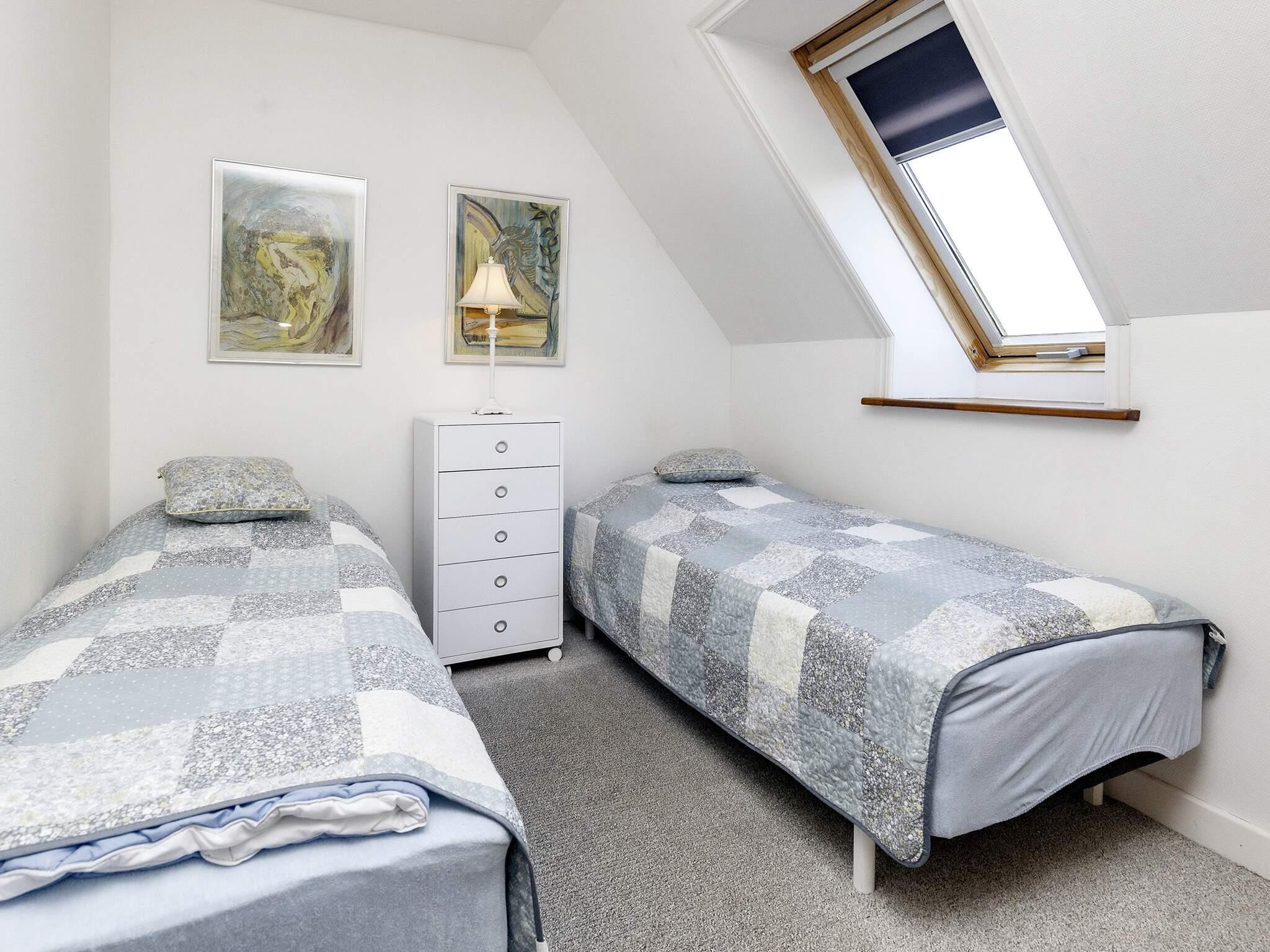 I entréen er der trappe op til soveværelserne. Der er to soveværelser med enkeltsenge, som kan skubbes sammen til en dobbeltseng i begge værelser, hvis det ønskes. Der er også en sovesofa på første sal.