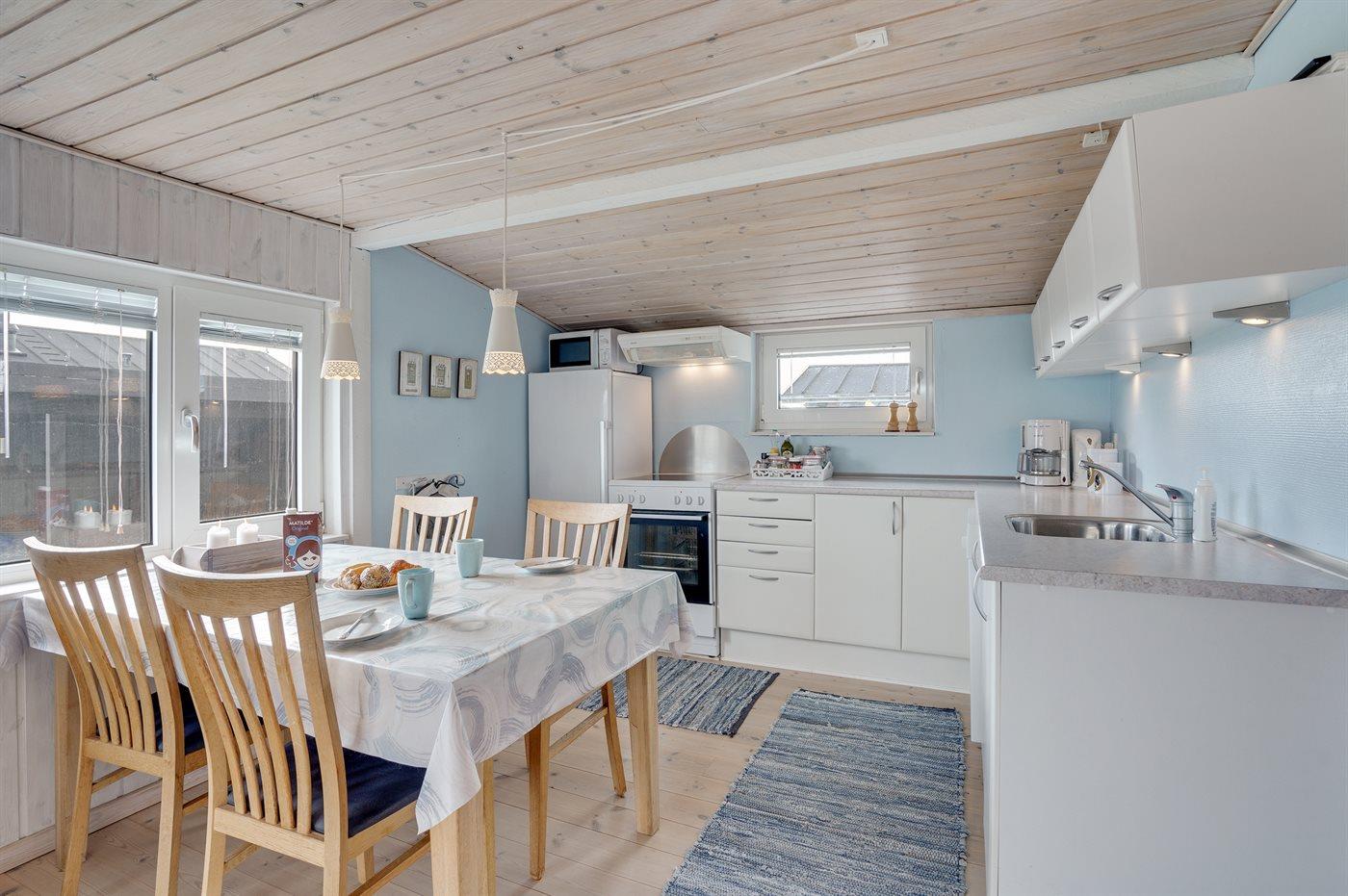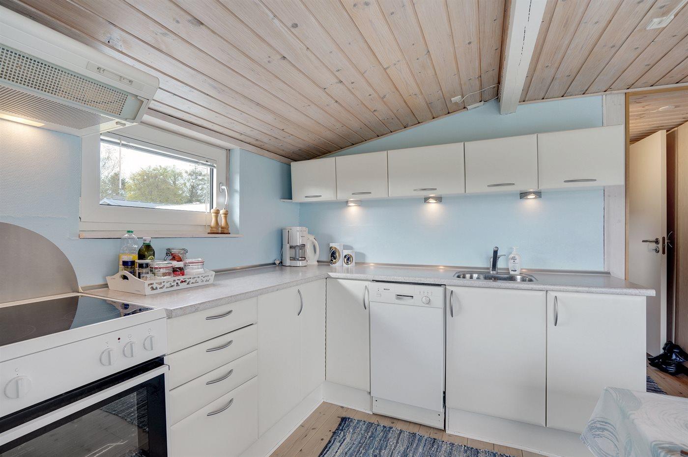 Køkkenet er udstyret med 1 køleskab. Der er 4 keramiske kogeplader, varmluftovn, mikrobølgeovn samt opvaskemaskine.