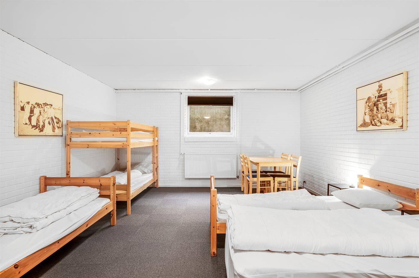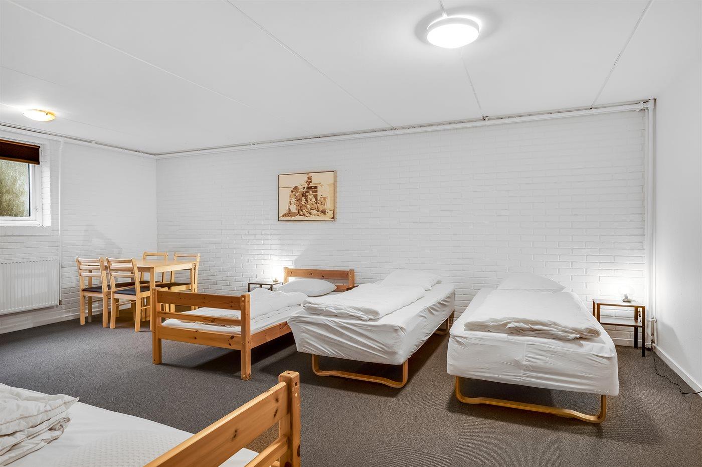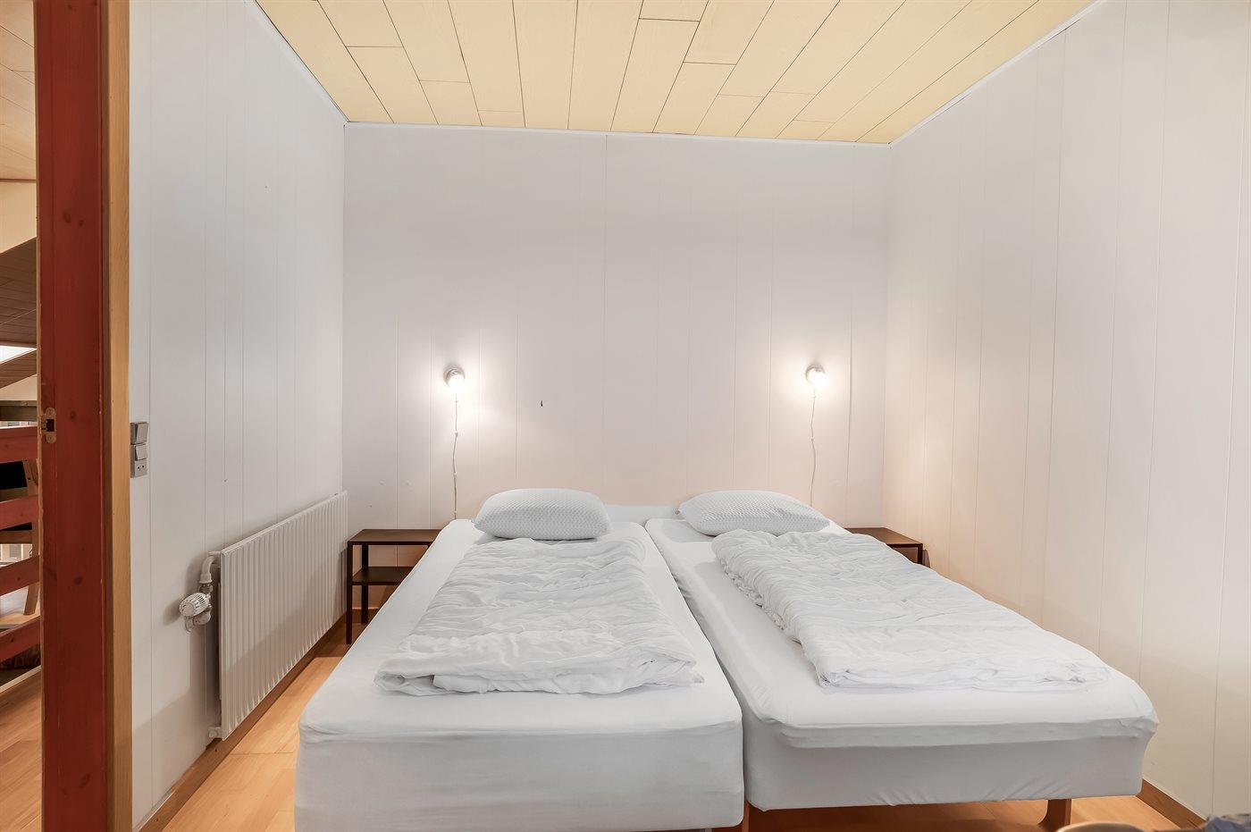 Der er i alt 8 soveværelser. Sovepladserne fordeler sig på: 2 sovepladser i dobbeltseng. 16 sovepladser i enkeltsenge. 3 sovepladser i køjesenge. Derudover er der 2 stk. barnesenge.