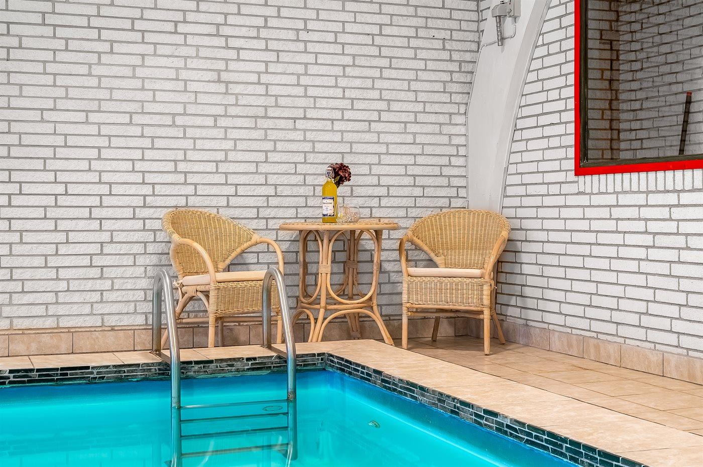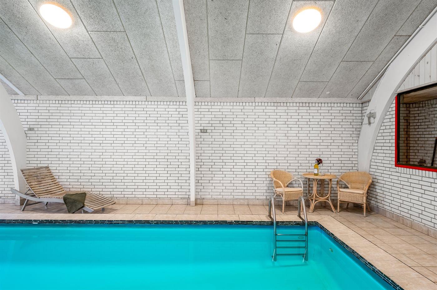 I den indendørs swimmingpool er der mulighed for leg og hyggeligt samvær. Swimmingpoolen måler op til 3 m i bredden, 8 m i længden og den fra 1,2 m op til 1,9 m dyb. Der er gulvvarme i swimmingpoolområdet.