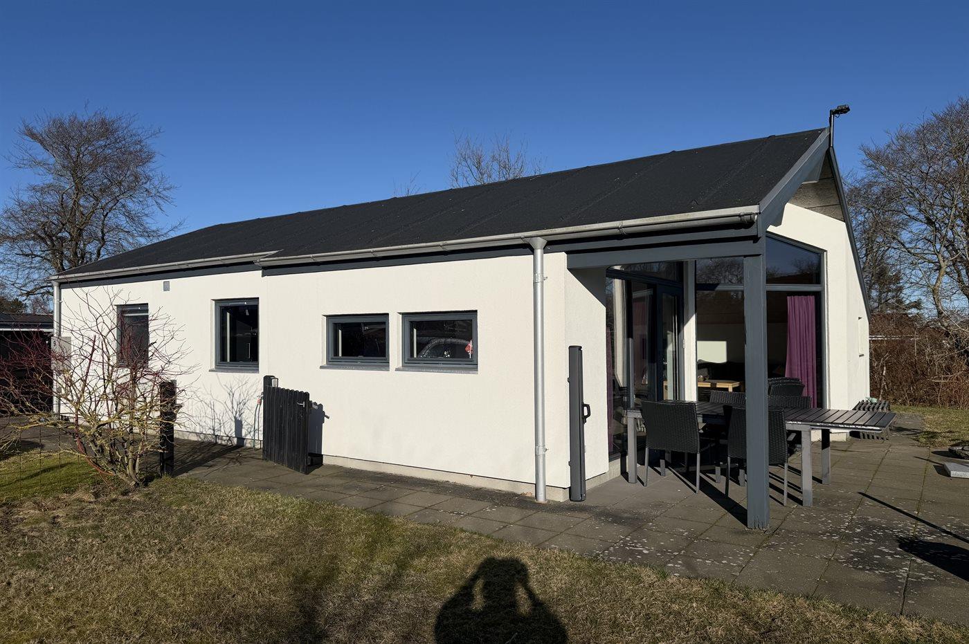 Lyst sommerhus tæt på sandstrand i Sæby med terrasse og elbiloplader.