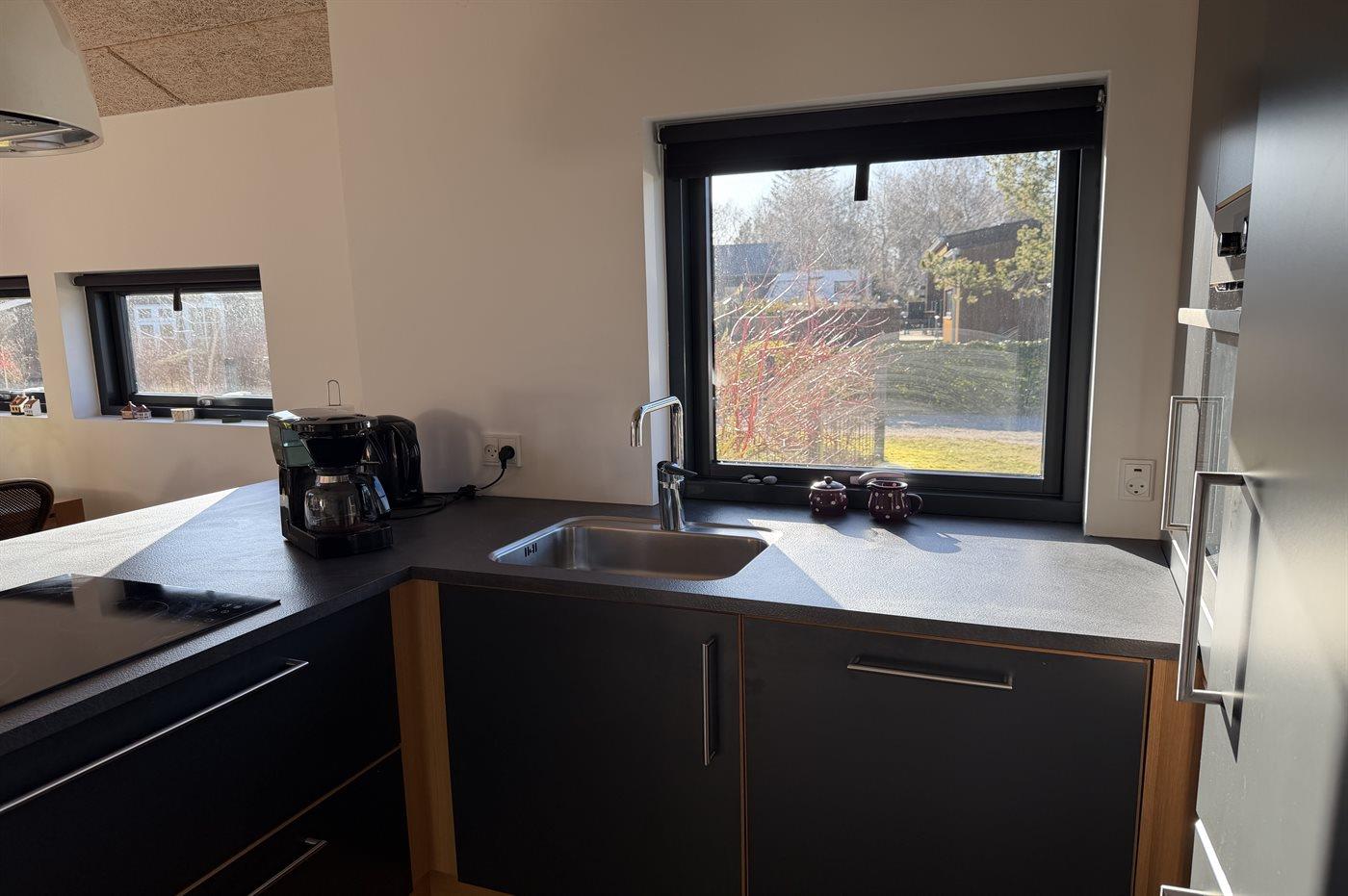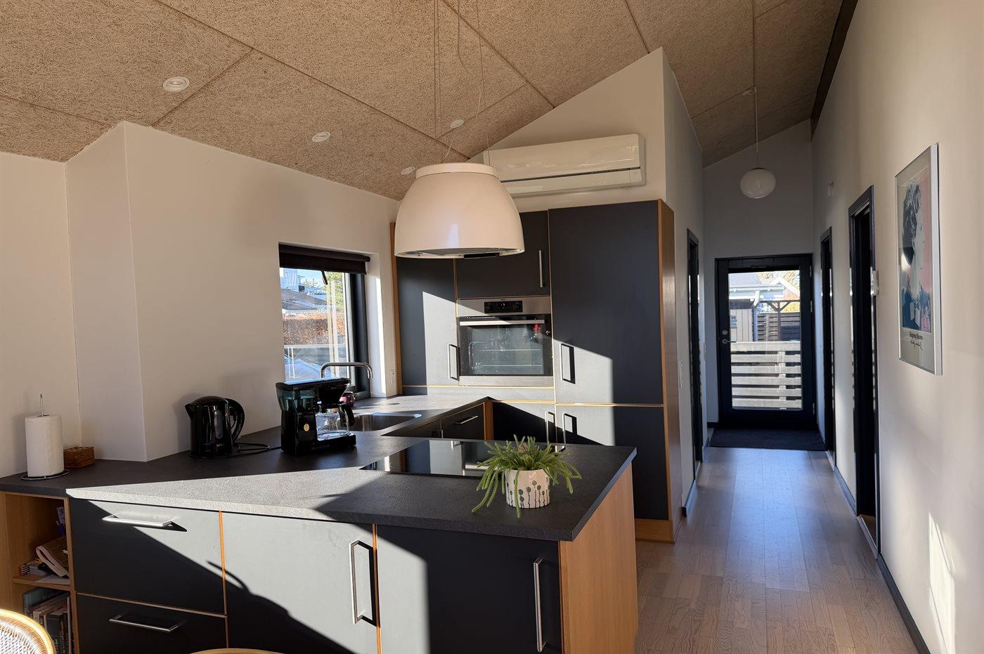 Køkkenet er udstyret med 1 køleskab. Der er 4 keramiske kogeplader, varmluftovn samt opvaskemaskine.