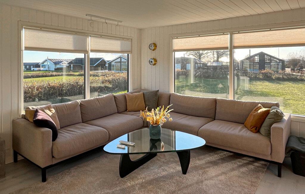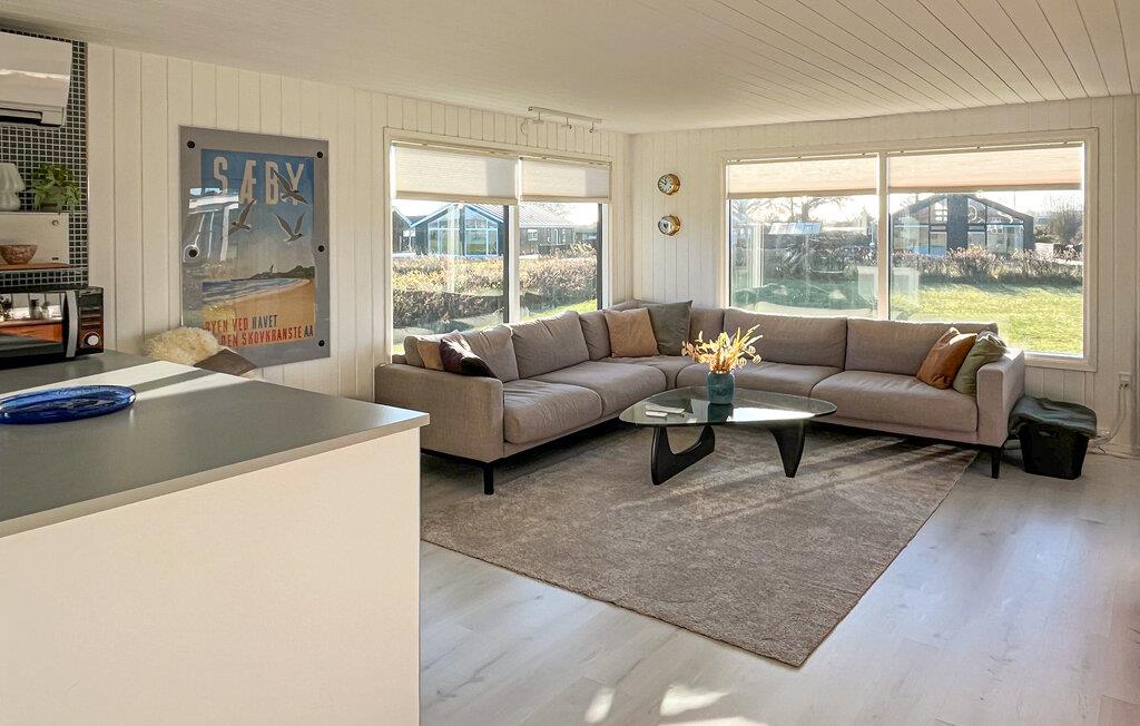 Læn jer tilbage i den hyggelige opholdsstue, der er møbleret med en stor hjørnesofa og varme farver. Værelset lægger op til at strække jer ud, læse eller se fjernsyn. De store vinduer tilbyder udsigt over de vidtstrakte naturomgivelser og lukker masser af lys ind, så I straks føler jer godt tilpas. Tilbered jeres måltider i det åbne køkken; den gennemtænkte planløsning, moderne apparater og rigelig bordplads gør madlavningen behagelig og ligetil.