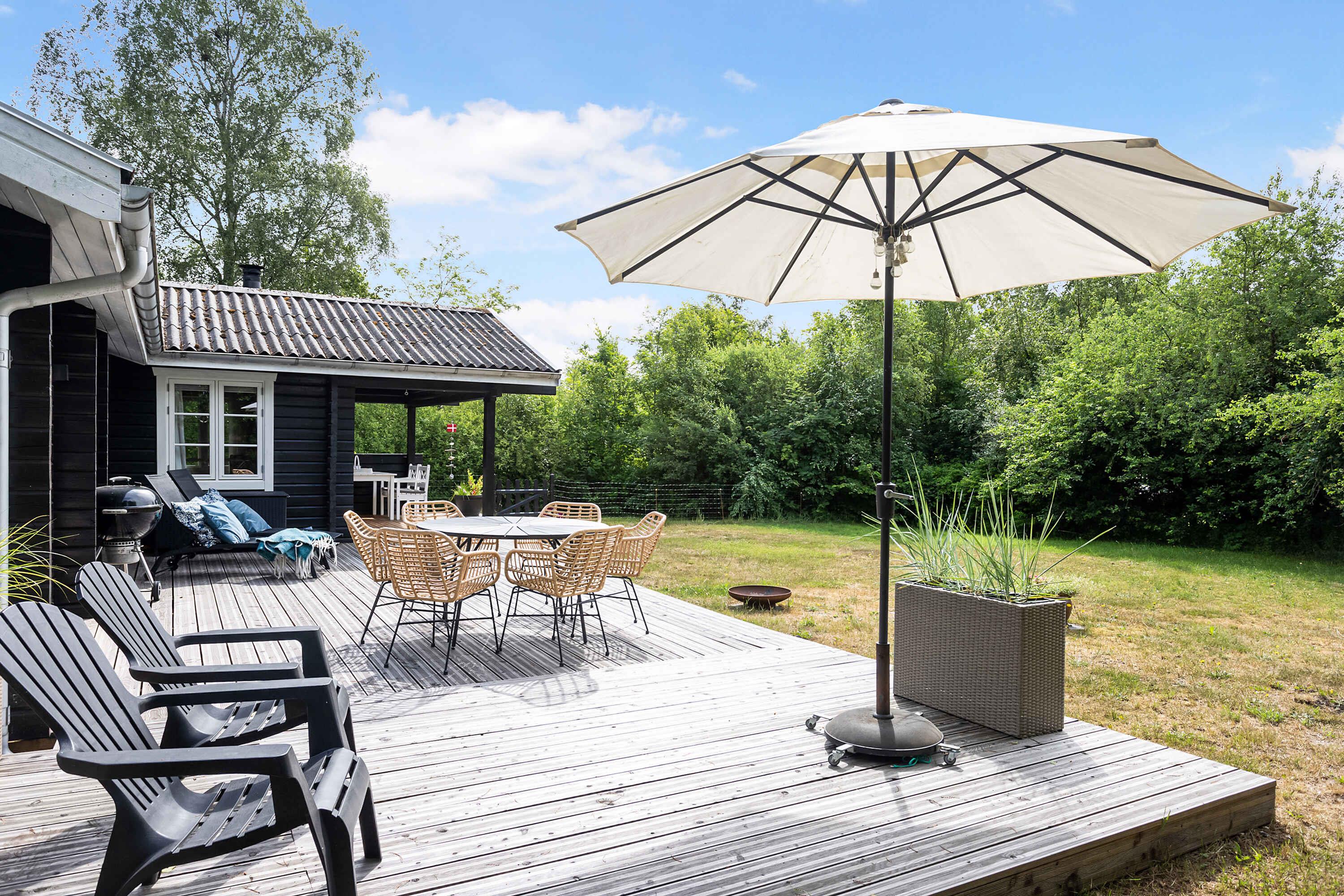 Skønt renoveret bjælkehus i Lyngså med strand og natur tæt på, inkl. moderne faciliteter og stor terrasse til afslapning.