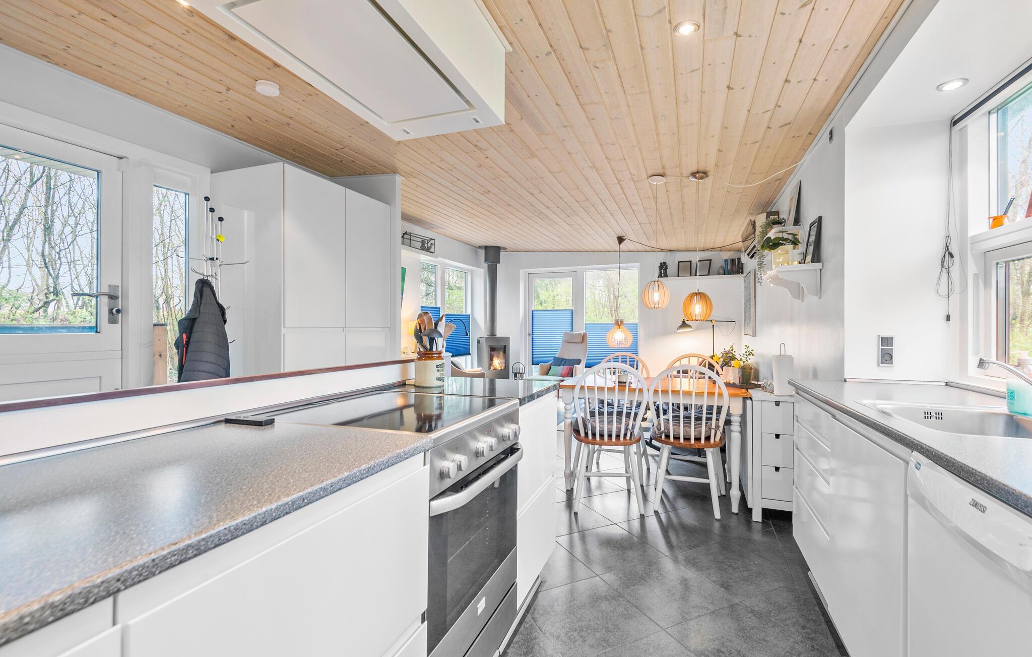 Tilbered nogle lækre retter i det funktionelle køkken og nyd dem ved spisebordet af træ, inden I lader aftenen gå på hæld i sofaen med hver jeres bog eller et spil kort til lyden af ildens blide knitren.