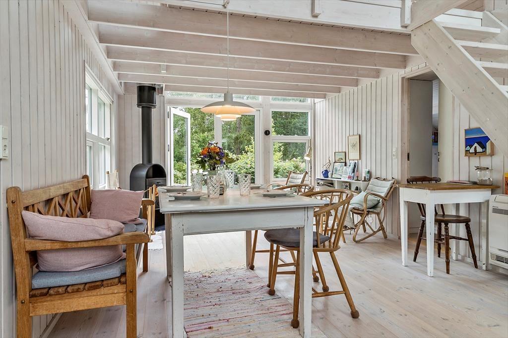 I forlængelse med køkkenet er spisebordet, hvor der er plads til, at alle husets gæster kan sidde og bruge mange timer sammen. Under trappen op til 1. sal er indrettet et lille skrivebord, så har man brug for lidt arbejdsro eller fordybelse, kan man sætte sig her, og kigge på brændeovnen og ud af de store vinduer.