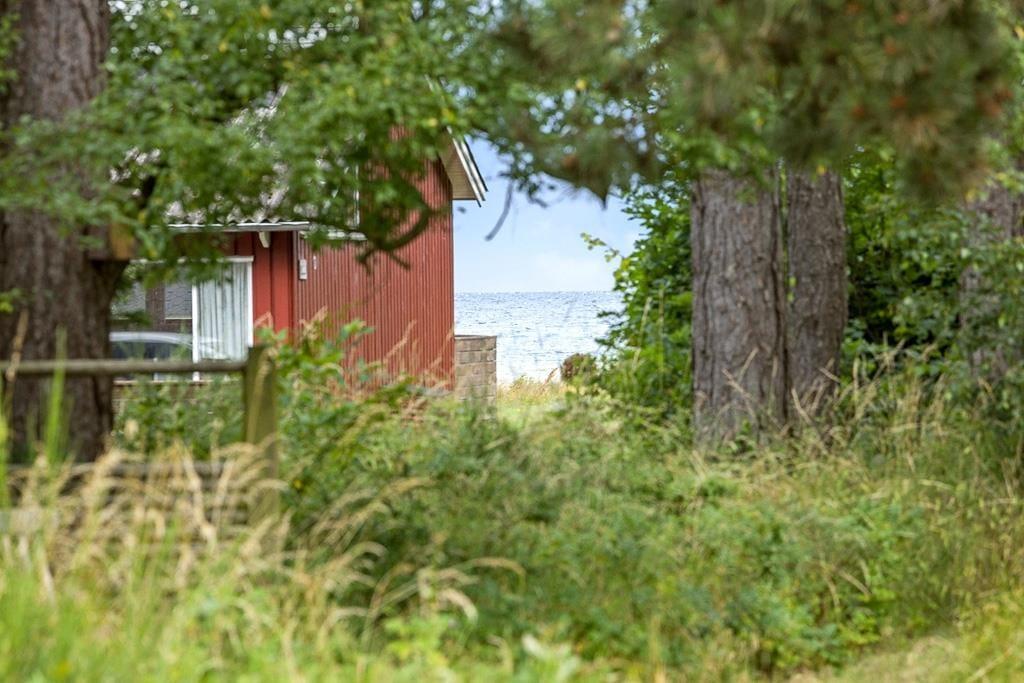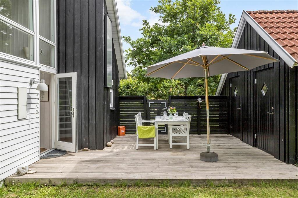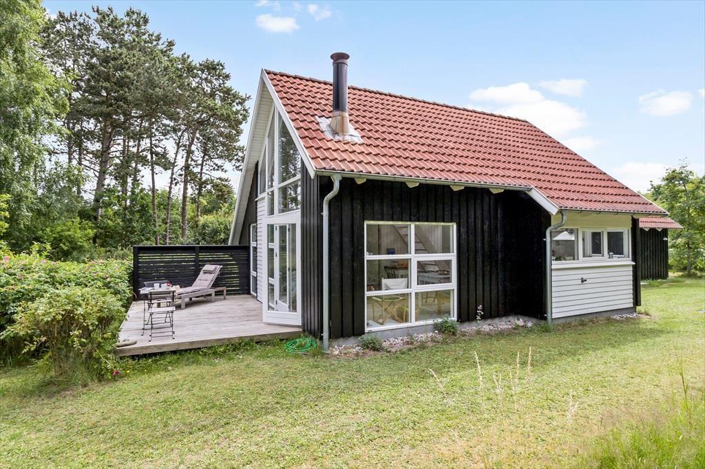 Sommerhuset er på en grund, der er omkranset af træer. Det gør, at man føler sig uforstyrret her, selvom der ligger flere sommerhuse i området. Mod grusvejen er et stakit, der afskærmer sommerhuset og de gode terrasser i hver ende af huset. Både fra køkkenet og stuen er der udgang til terrasserne, så man kan altid finde læ eller sol alt efter vejret. Rundt om huset er også en græsplæne, der giver luft omkring sommerhuset og god plads til både boldspil og afslapning. Herfra kan man også kigge ned til havet, der ligger ganske tæt på sommerhuset.