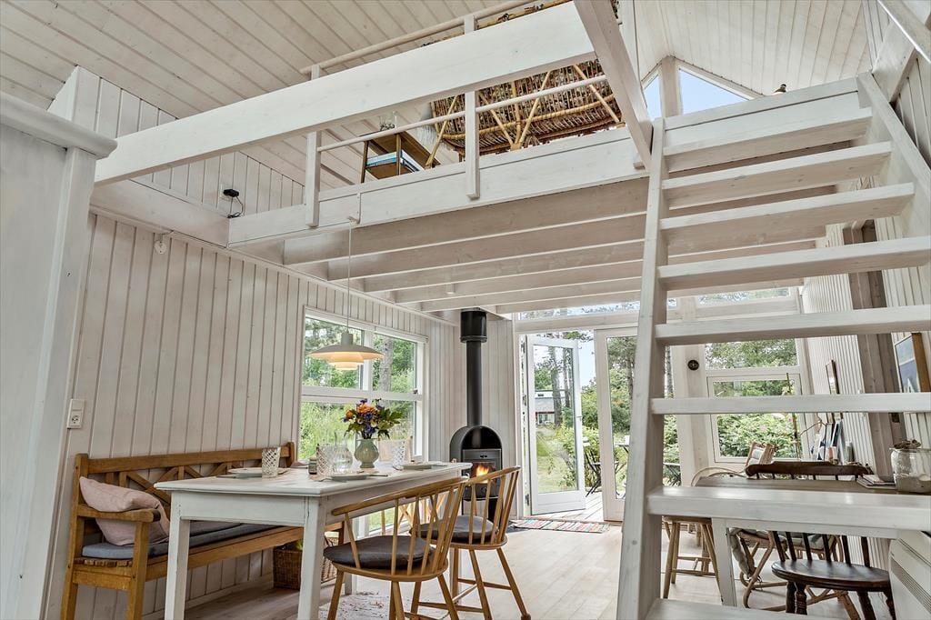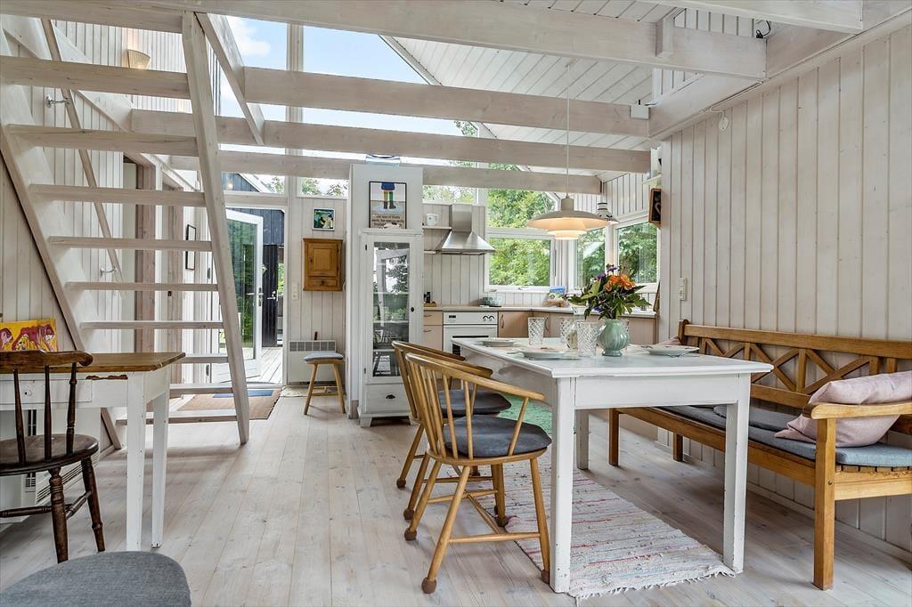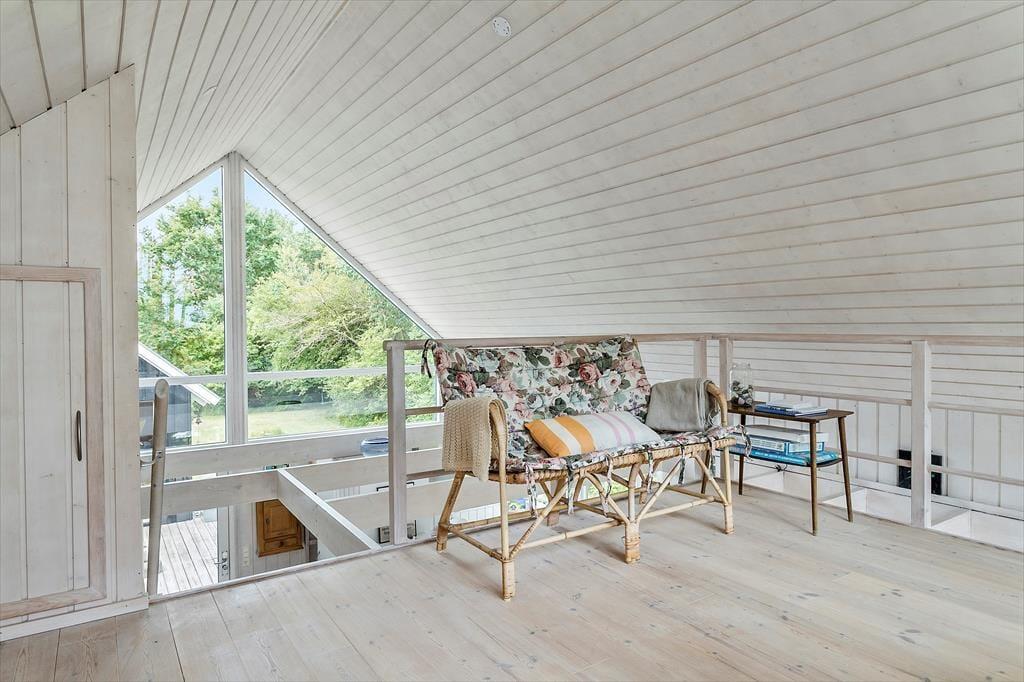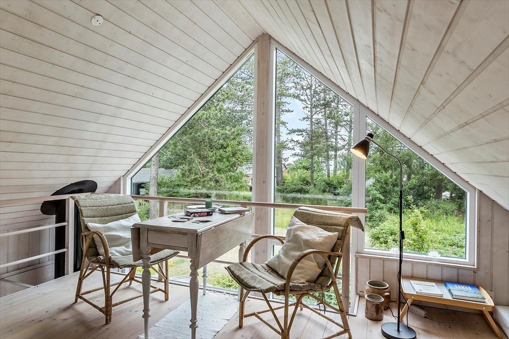 Fra køkkenalrummet er en trappe op til en lille første sal, hvor hyggen og udsigten også er i top. Mellem skråvægge og det store vindue mod nord, er indrettet et hyggeligt rum med stole og bord, der er ideelt til f.eks. at spille brætspil. Her er også en liggeplads, hvor man kan trække sig lidt tilbage og læse eller tage en middagslur. Dette rum giver ekstra plads til hygge samtidig med, at man stadig er forbundet med resten af huset. Huset er i en gennemført og hyggelig sommerhusstil, hvor lyset og naturen spiller en vigtig rolle i alle rum.
