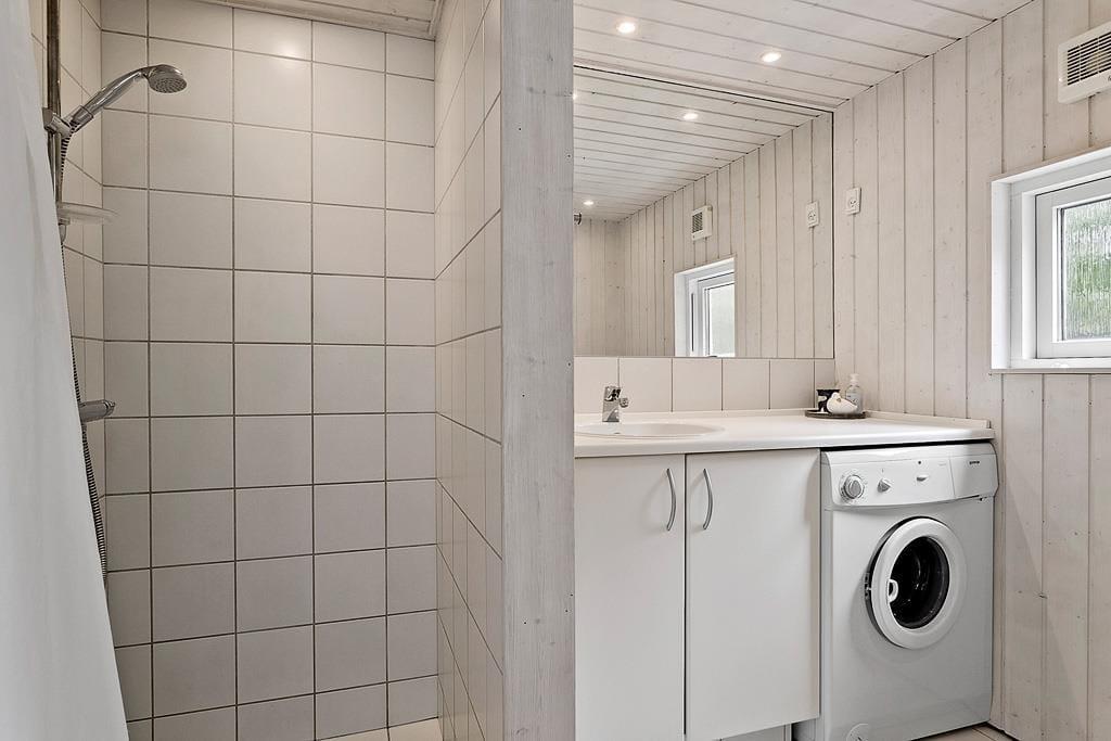 Ved soveværelserne finder du også badeværelset, hvor der er en god bruseniche samt en vaskemaskine. Huset har altså gode faciliteter, som sikrer en god sommerhusferie.