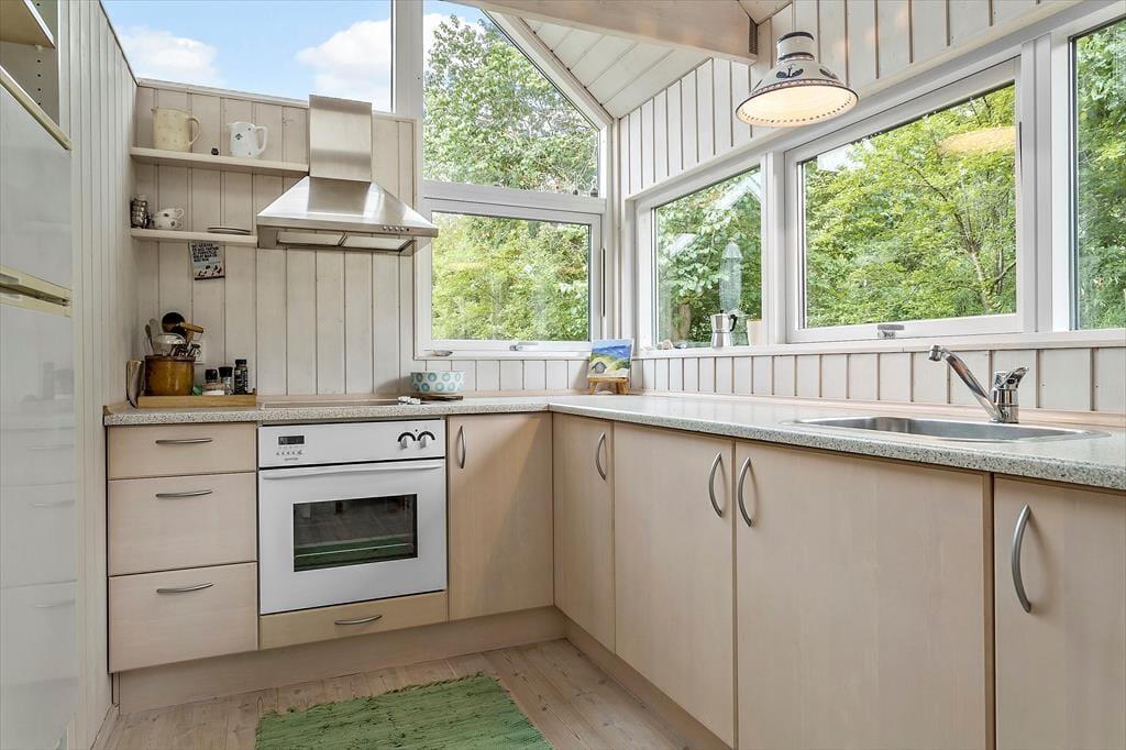 I køkkenalrummet går vinduerne helt op til kip, og dermed er der et dejligt lysindfald fra både nord- og sydsiden. Køkkenet er funktionelt og har alt det, du skal bruge når måltiderne skal tilberedes. Her er blandt andet ovn og køle-fryseskab samt gode vinduer ud mod haven, så man altid kan følge med i livet udenfor.