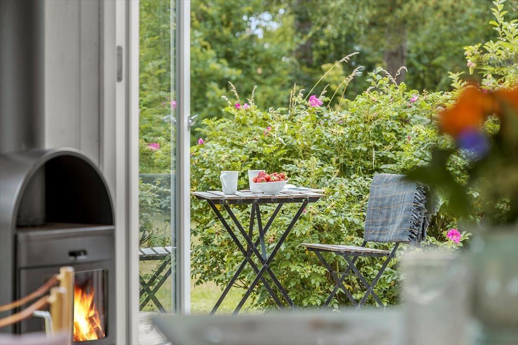 Brændeovnen skaber et hyggeligt hjørne med store vinduer ud mod kysten. Fra terrassedøren kan man også gå direkte ud på træterrassen. Der findes næppe et bedre sted at sætte sig med en god bog eller drikke en kop the i godt selskab.