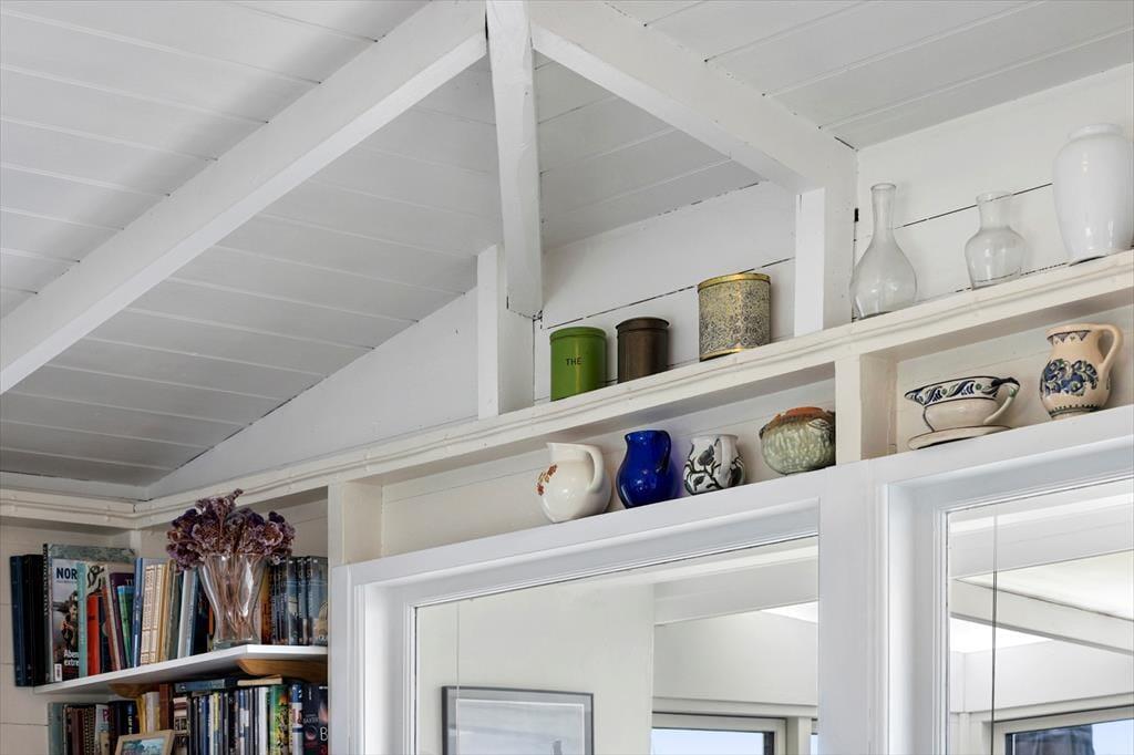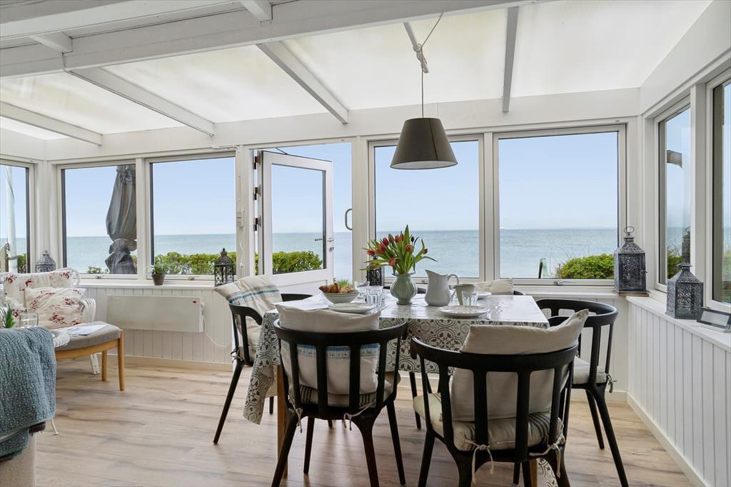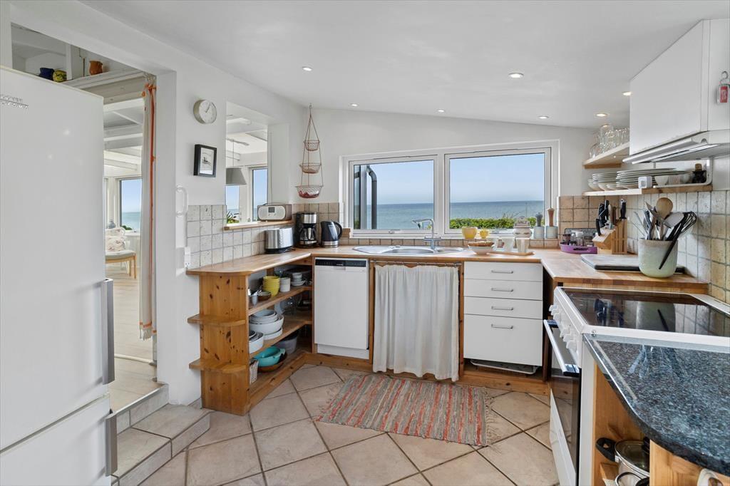 Køkkenet er rummeligt og med plads til at tilberede feriens måltider, og samtidig kan I nyde den fantastiske udsigt, når I står ved køkkenbordet. Et par trin op går man fra køkkenet og ind i stuen, der er husets hjerte og samlingsrum. I udestuen er der panoramavinduer, der giver den fulde udsigt over havet, og det er svært ikke at bruge mange timer på at nyde denne udsigt. I udestuen er spisebordet med plads til jer alle, så det giver mulighed for, at uanset hvordan vejret er, kan jeres måltider nydes med denne udsigt som baggrund. Ved siden af spisebordet er også et lille sofahjørne og en lænestol, hvor det er oplagt at slappe af med en god bog eller drikke en kop eftermiddagskaffe. Her kan I tilbringe mange timer sammen og nyde solnedgangen og den smukke udsigt til havet.