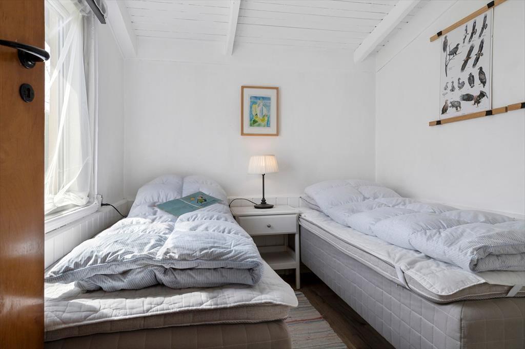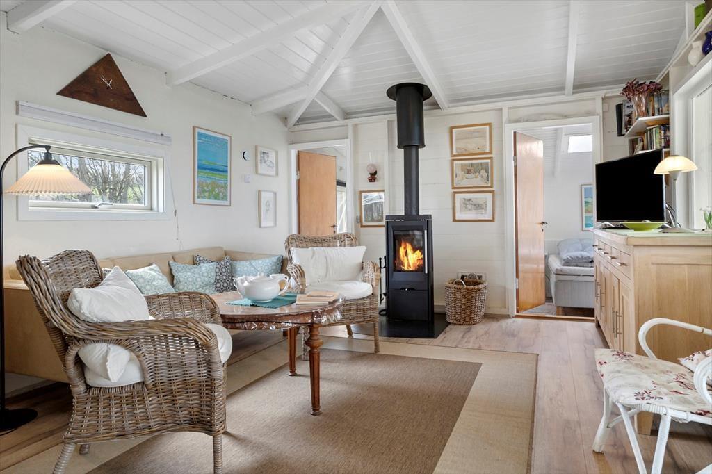 Stuen er hyggelig og indbydende med lyse trævægge og lofter. Her er en sofa og lænestole, så du kan sætte dig godt til rette og tænde for TV´et eller I kan spille et spil. I stuen er også en brændeovn, så selv når det er koldt ude, kan I tænde op for varmen og hyggen indenfor. Fra stuen er der et trin ned til de to soveværelser. Værelserne har en god størrelse, og i det ene soveværelse, hvor der er udsigt til havet, er en dobbeltseng. I det andet værelse er to gode senge og vindue mod de grønne omgivelser.