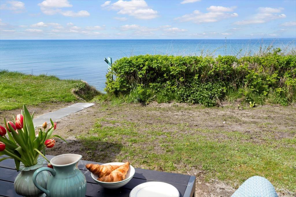 Du kan næsten ikke komme tættere på stranden, end når du skal bo i dette sommerhus.Så snart du træder udenfor døren er havet og stranden helt tæt på. Den sikre vej til stranden er dog 100 meter ad grusvejen, hvor du kan gå direkte ned og tage en dukkert. I kan selvfølgelig også sætte jer foran huset i havemøblerne, og nyde en middag og se solnedgangen fra første parket. Ved husets indgang er der endnu en terrasse, der er syd-øst vendt, så her er der mulighed for at sidde helt i læ og stadig nyde omgivelserne.