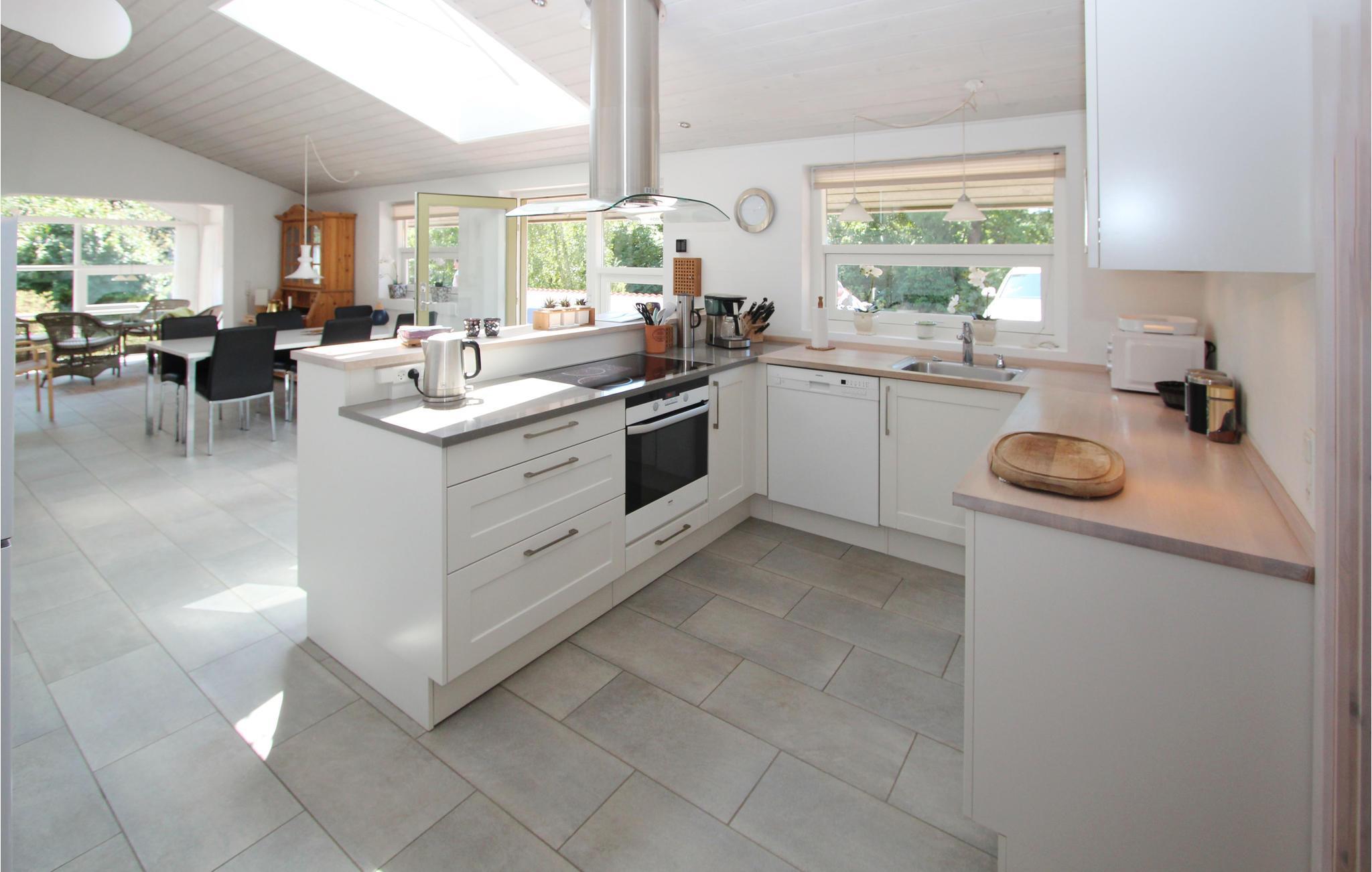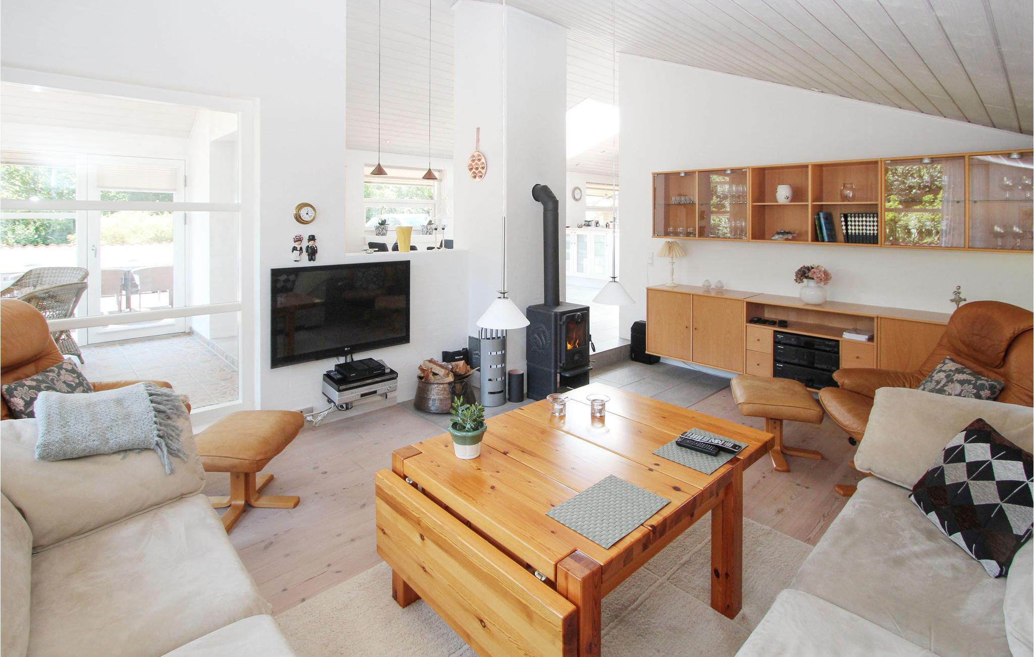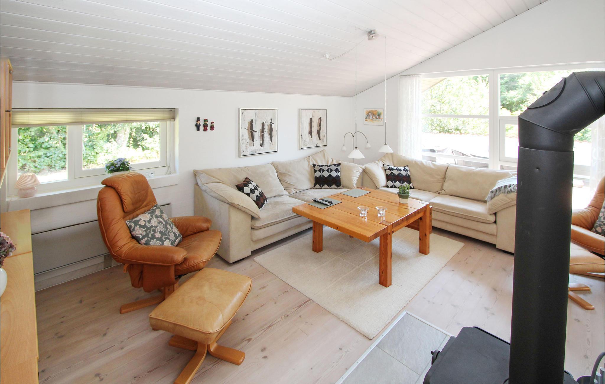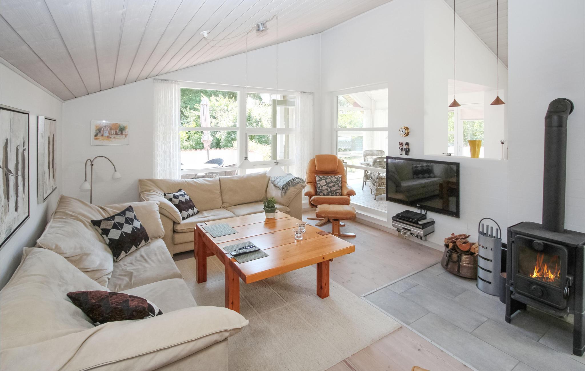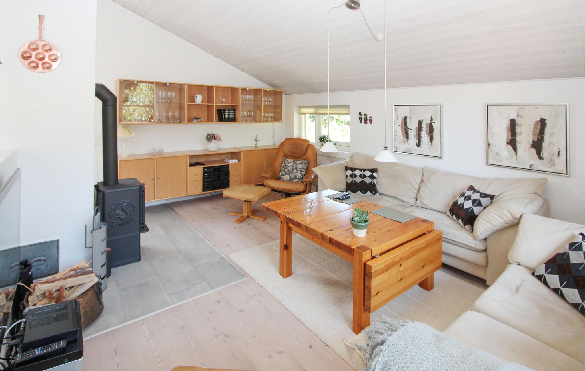 Huset byder jer velkommen tæt på stranden og Sælvig Bugt. Grænserne mellem indendørs og udendørs flyder sammen i husets opholdsrum. Nyd det smukke dagslys og den vidunderlige udsigt til det fri, mens I tilbringer en uforglemmelig tid sammen her. Sofaområdet indbyder til lange aftener ved brændeovnen, som skaber en hyggelig atmosfære med sine knitrende lyde.