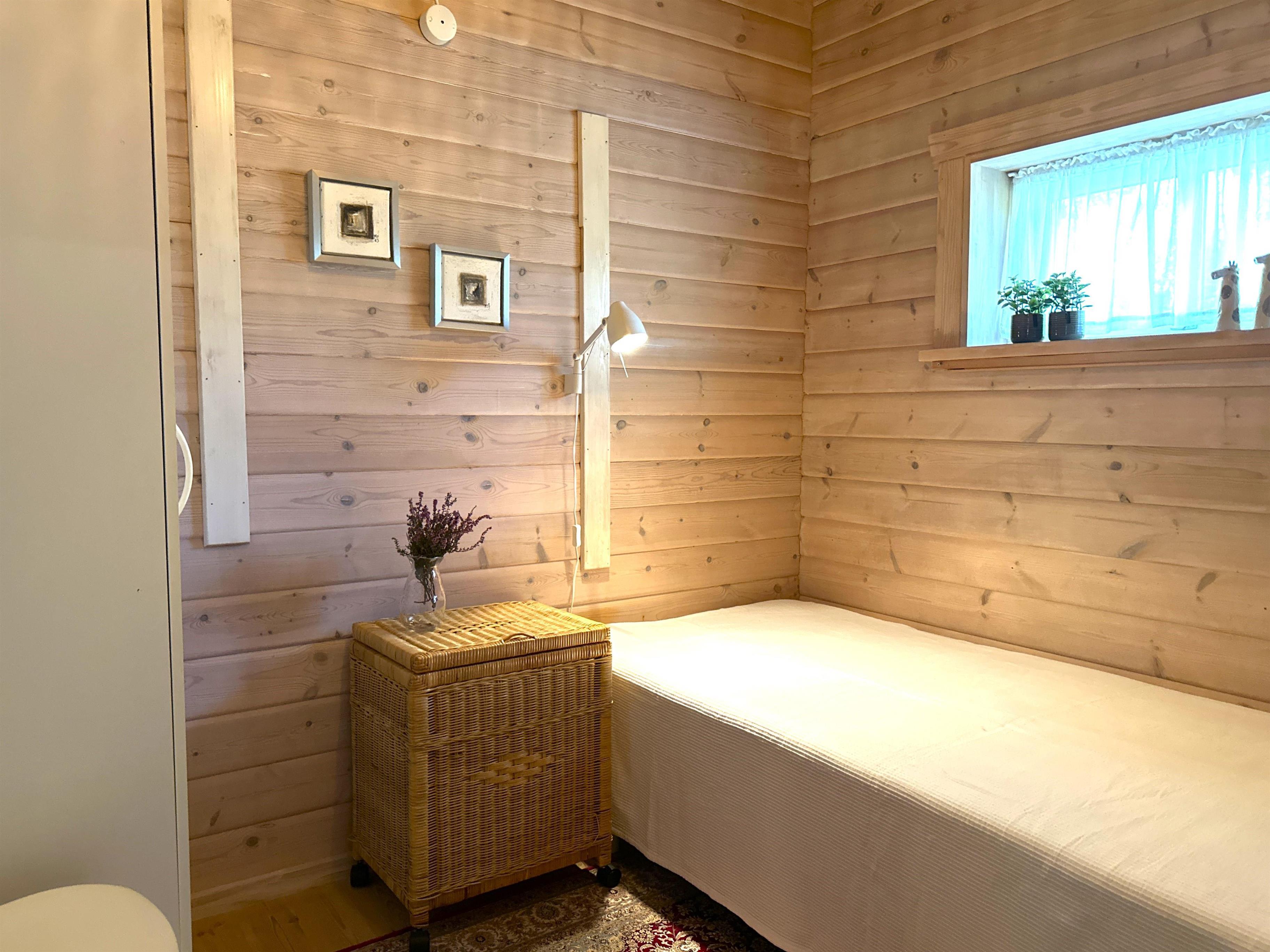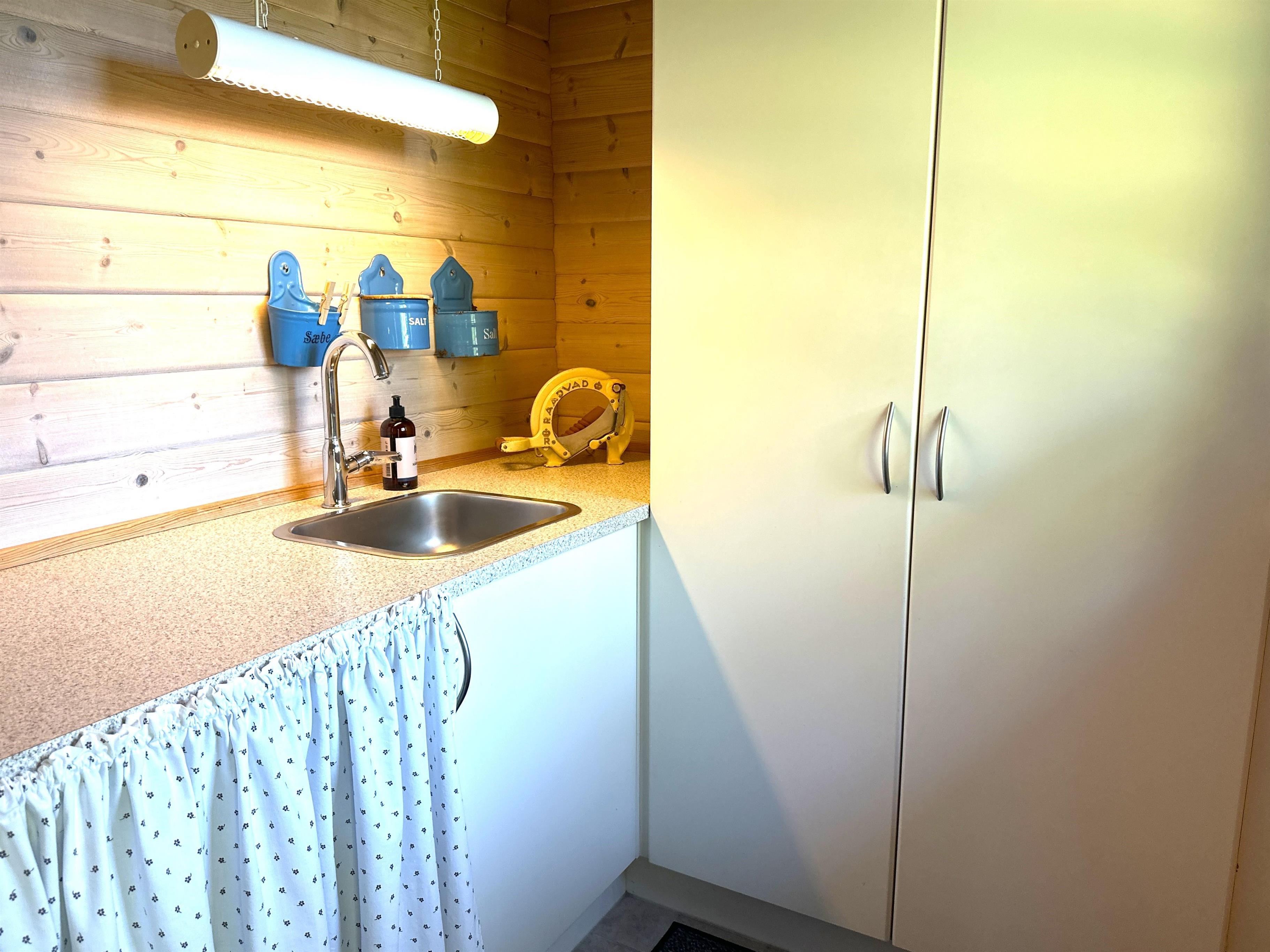 Når du træder ind i sommerhuset, bliver du mødt af et lyst og indbydende køkken-alrum med stor spiseplads, hvor familien kan samles til hyggelige måltider. Køkkenet er fuldt udstyret med alt, hvad du har brug for til madlavning – herunder opvaskemaskine, ovn, komfur, kaffemaskine og rigeligt med service. Alrummet ligger i åben forbindelse med en stor, velindrettet stue med bløde sofaer, brændeovn og fladskærms-TV. De mange vinduer og terrassedøre lukker masser af naturligt lys ind og giver en følelse af at være tæt på haven – selv når du opholder dig indenfor.