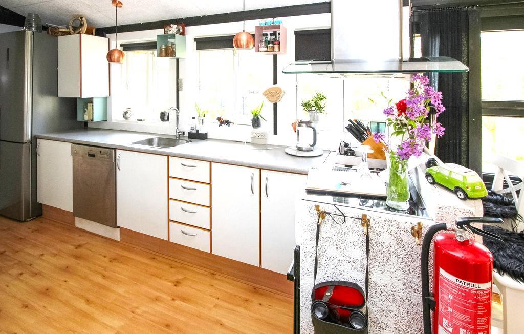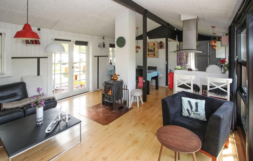 Sommerhuset byder på et lyst og hyggeligt køkken-alrum med god spiseplads, sofahjørne og en brændeovn, der skaber ekstra stemning på de kølige aftener. Der er et badeværelse med brusekabine, samt to soveværelser i hovedhuset – et med dobbeltseng og et med køjeseng. I det tilhørende anneks finder du yderligere to sovepladser, ideelt til gæster eller større børn.