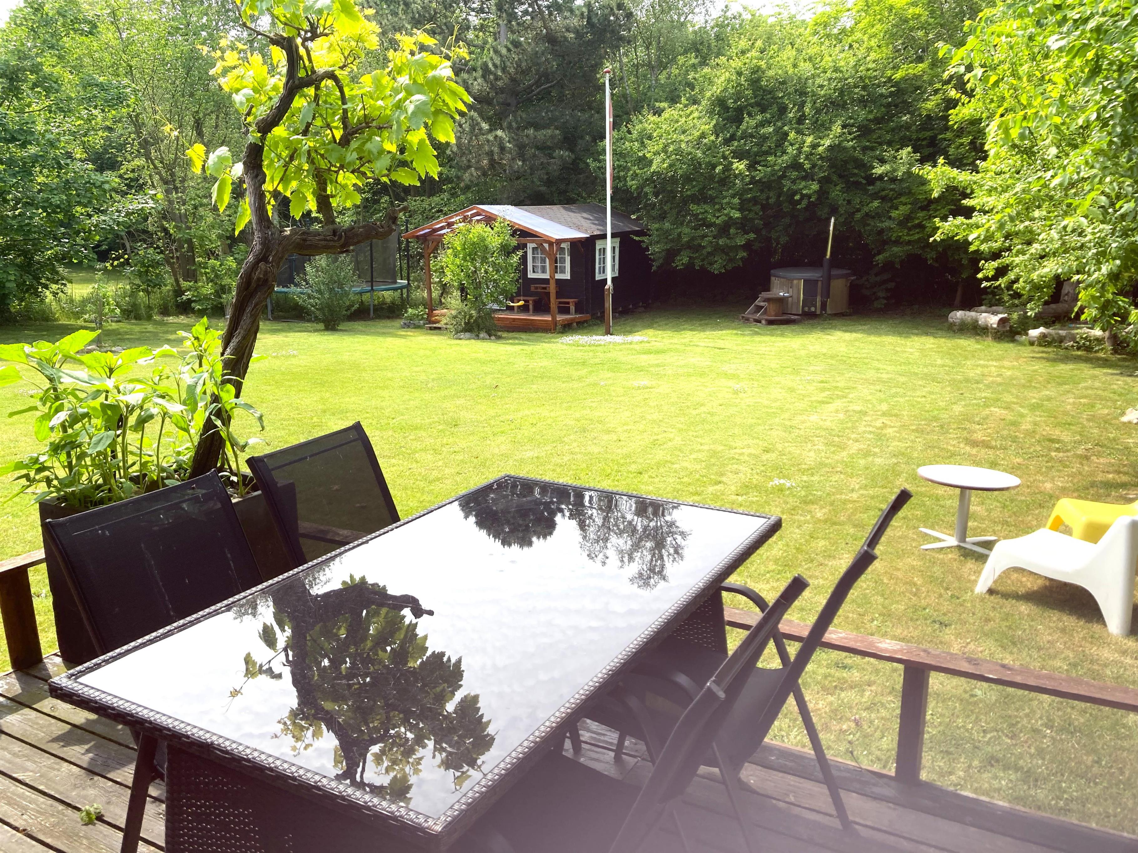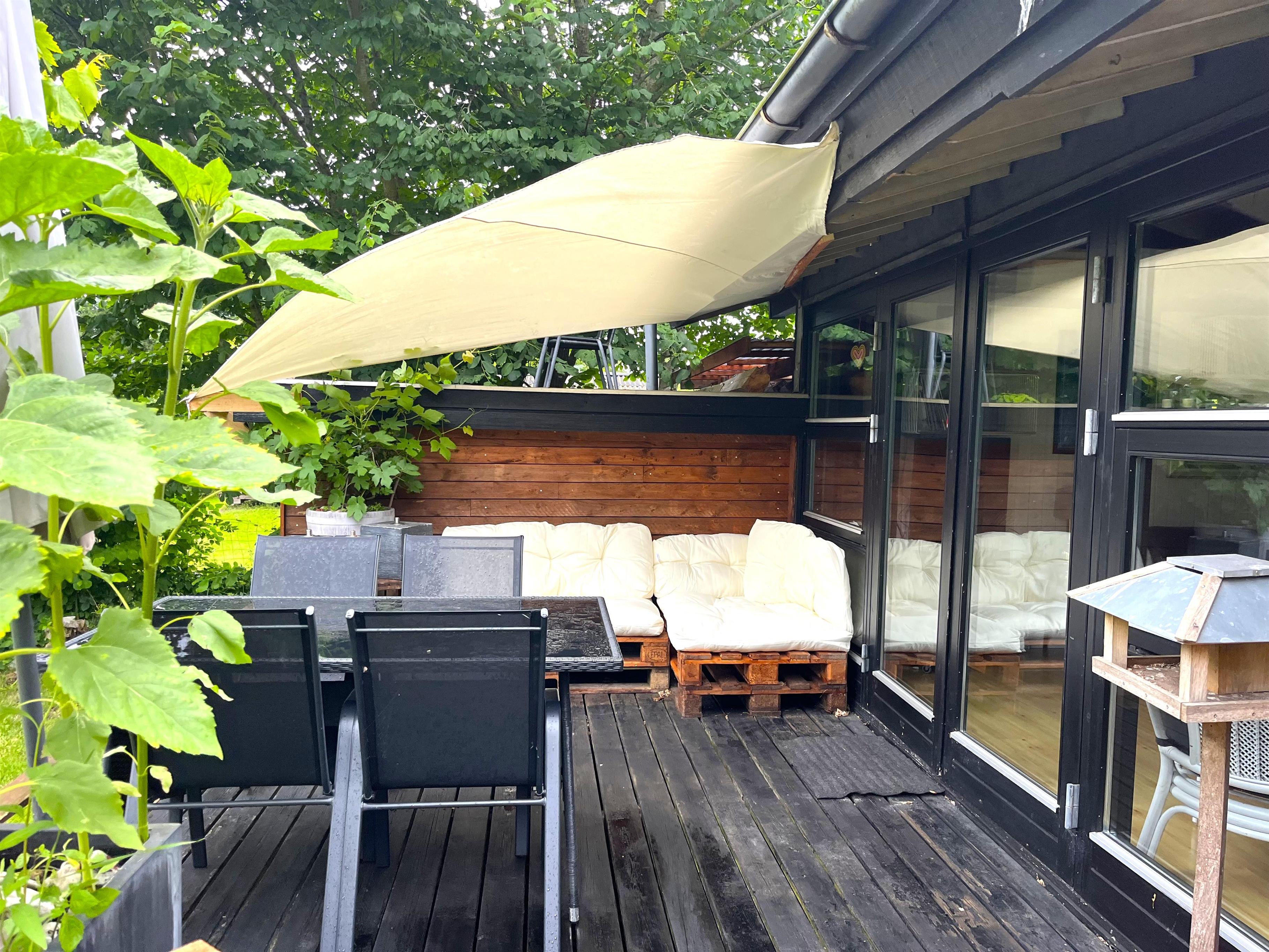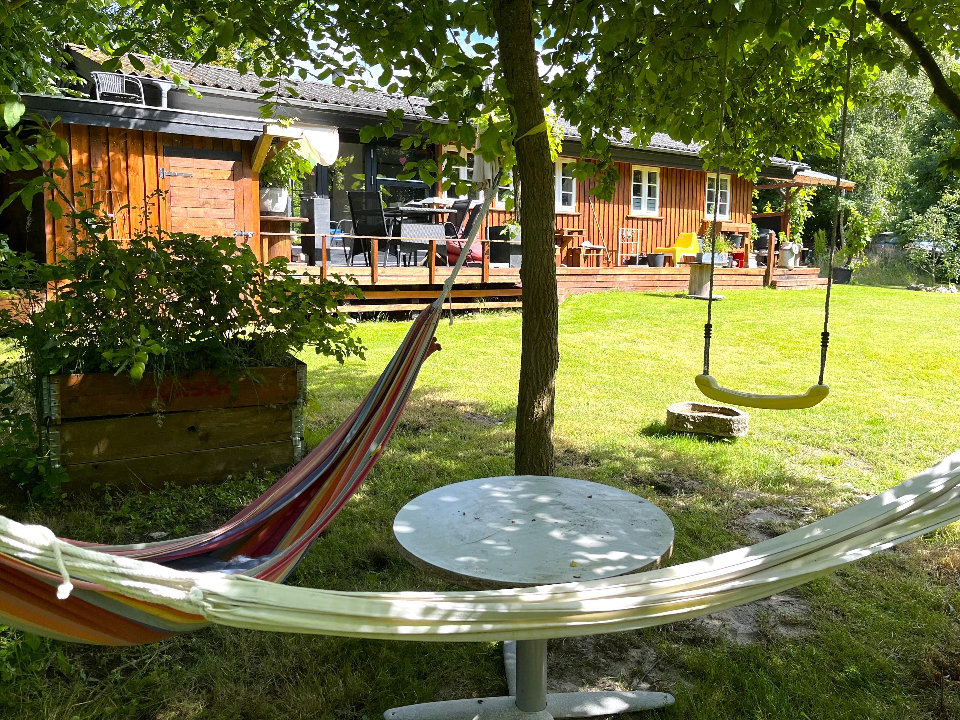 Træd ud på den skønne terrasse, hvor små kroge og hyggelige opholdspladser indbyder til afslapning i sommervejret. Her finder du både havemøbler, bålplads, vildmarksbad og hængekøjer – perfekte rammer for både ro og familietid. Haven giver rig mulighed for leg og udendørs spil. Stranden ligger blot få hundrede meter fra huset, så en frisk dukkert er aldrig langt væk.