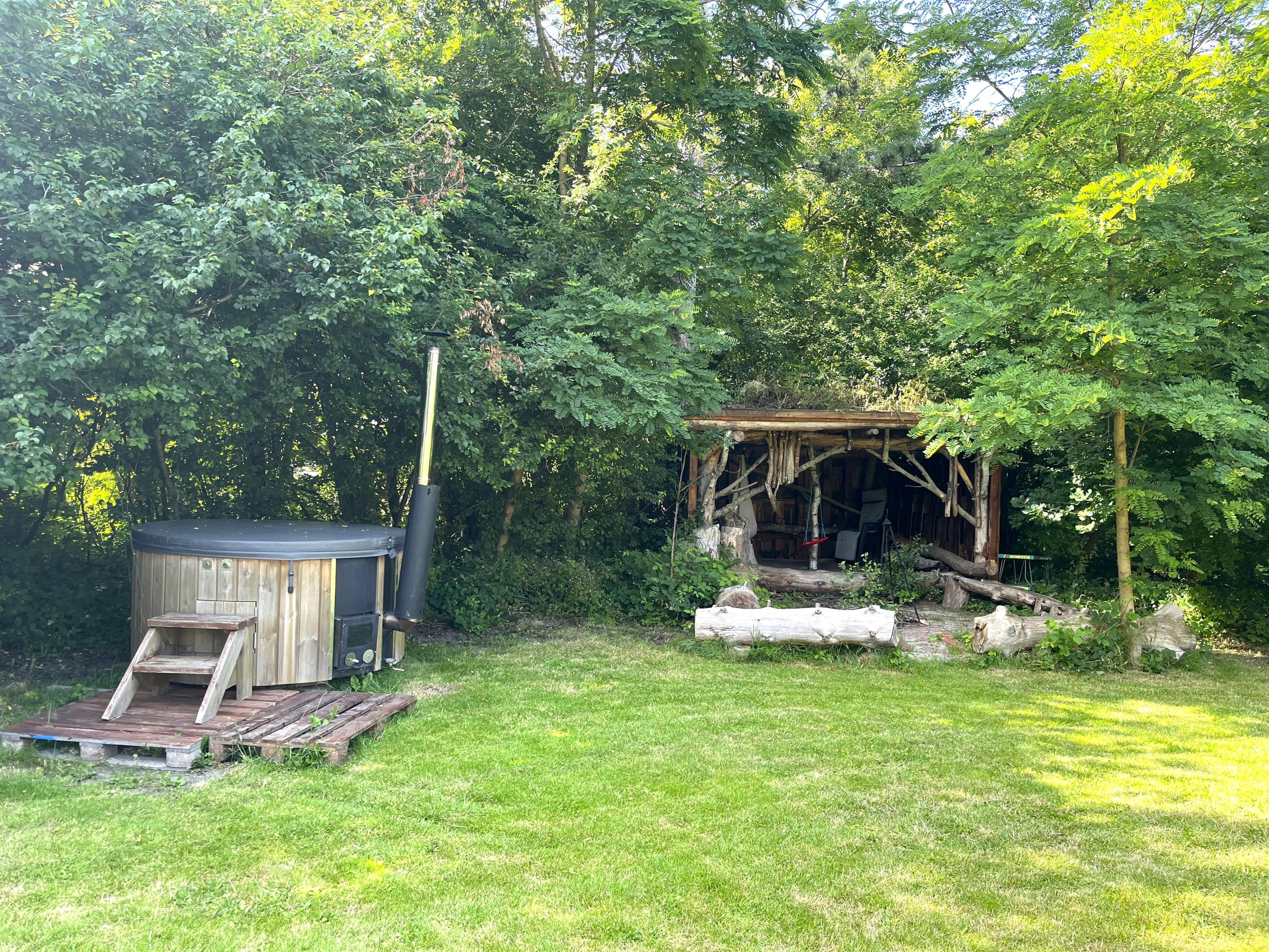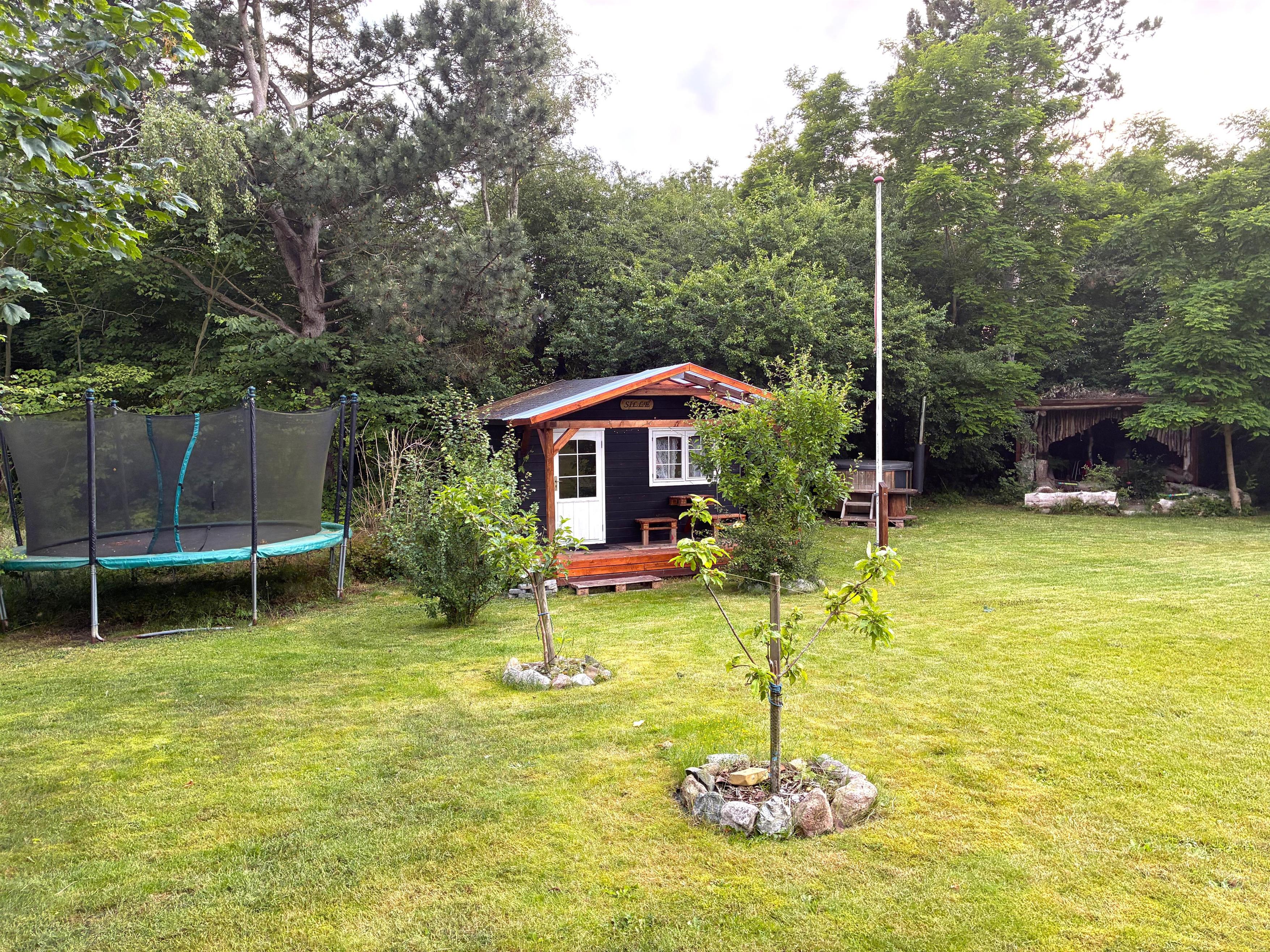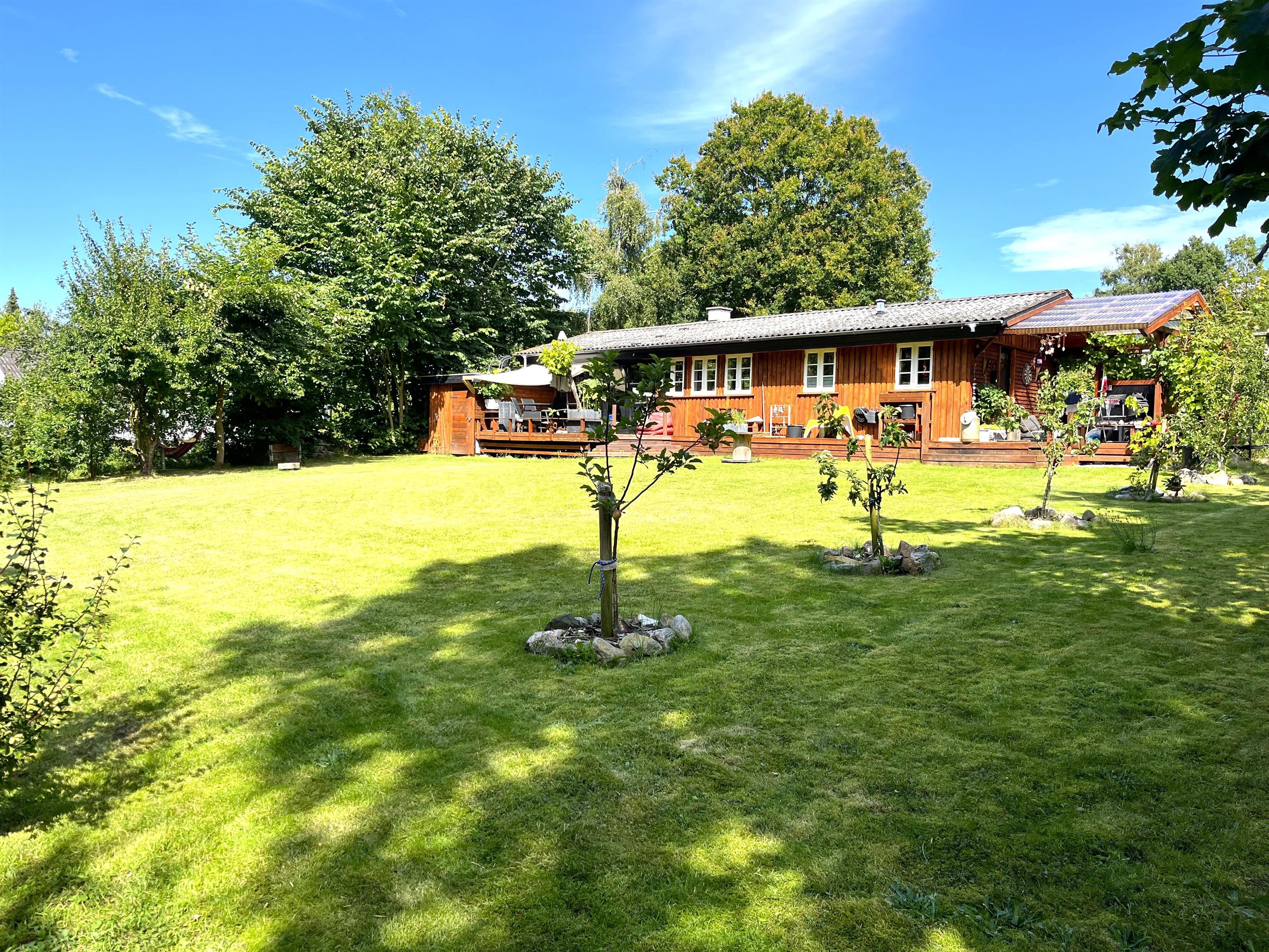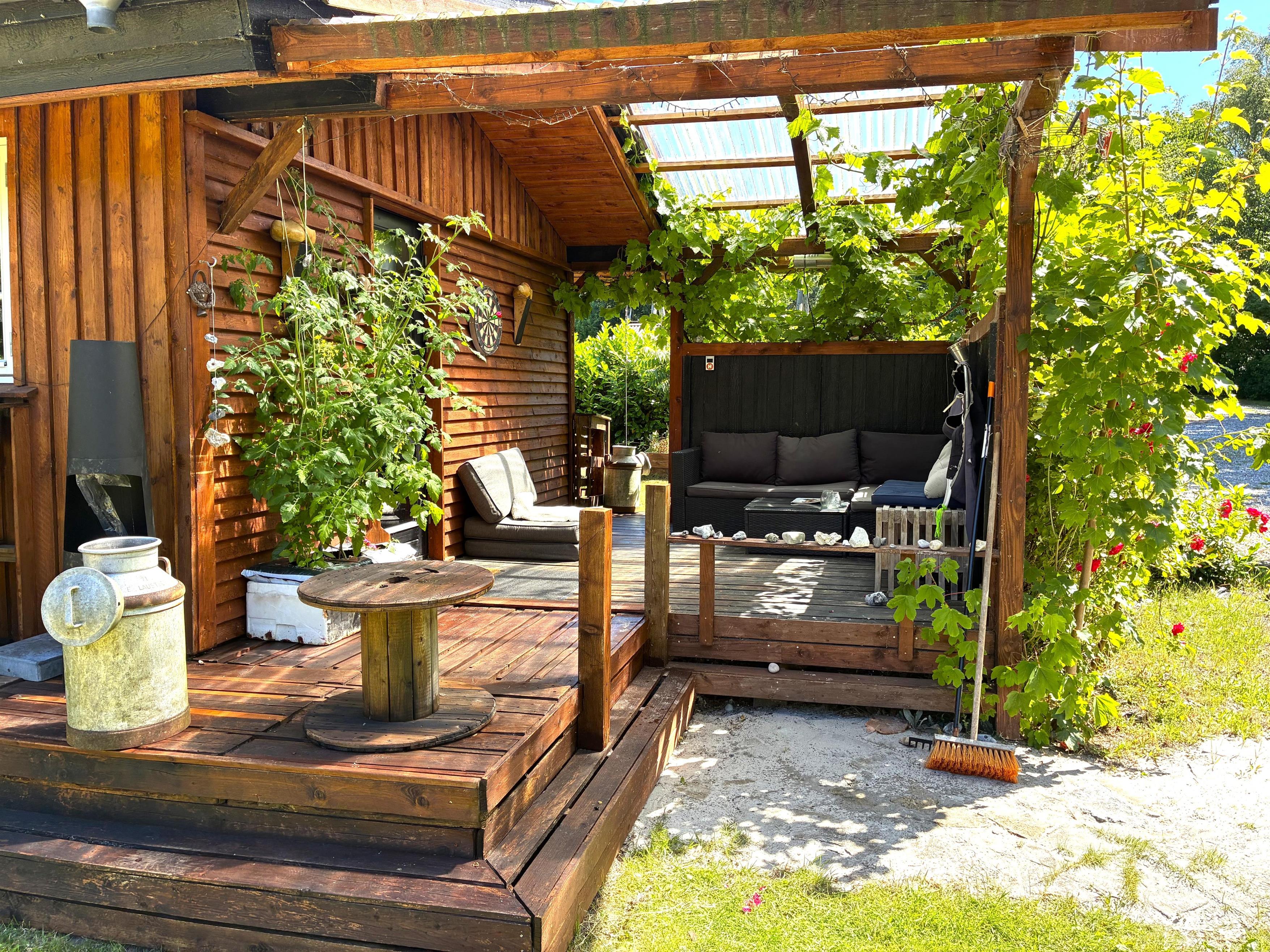 Træd ud på den skønne terrasse, hvor små kroge og hyggelige opholdspladser indbyder til afslapning i sommervejret. Her finder du både havemøbler, bålplads, vildmarksbad og hængekøjer – perfekte rammer for både ro og familietid. Haven giver rig mulighed for leg og udendørs spil. Stranden ligger blot få hundrede meter fra huset, så en frisk dukkert er aldrig langt væk.