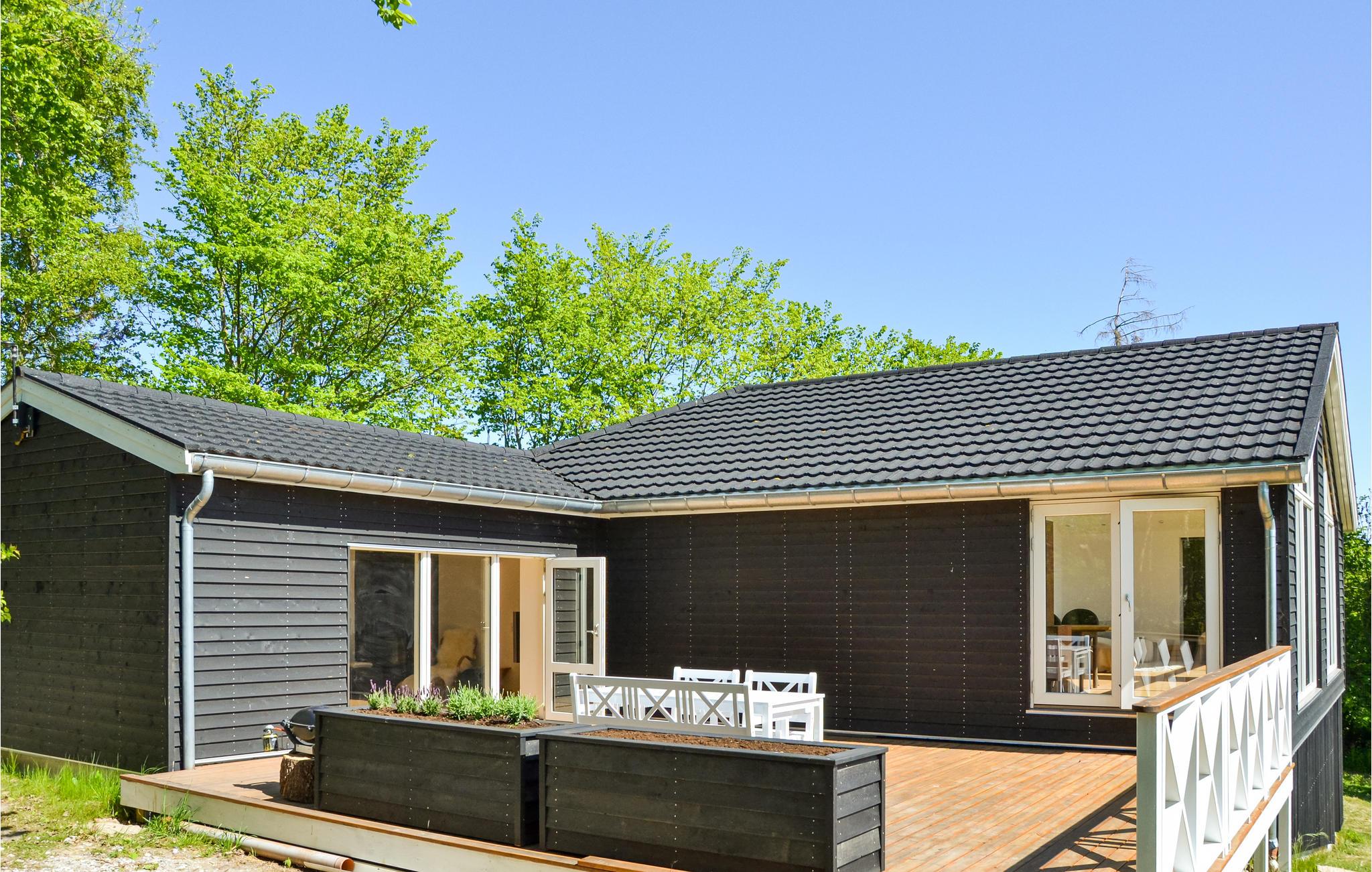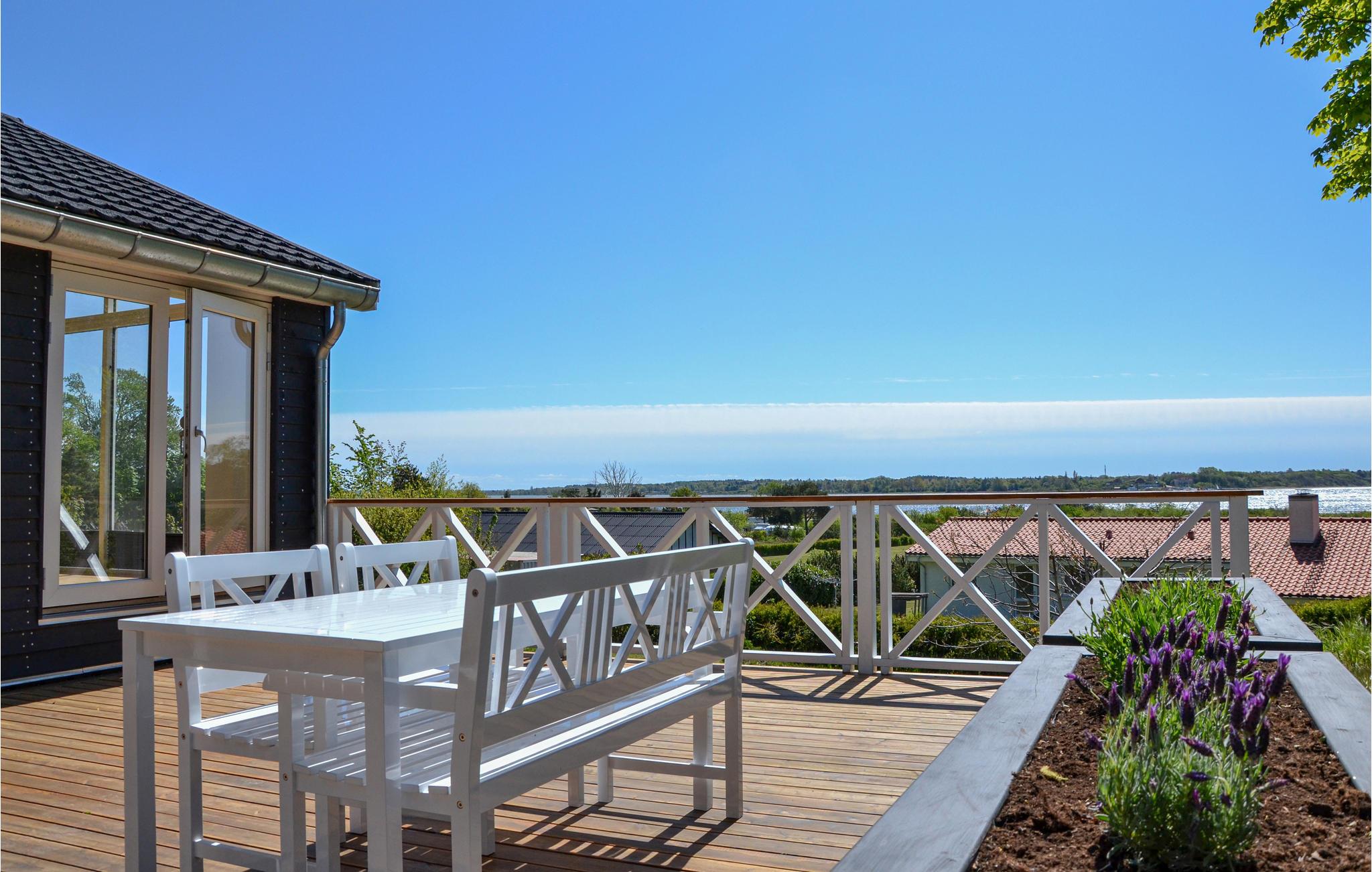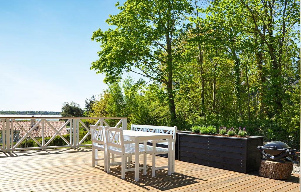 Udendørs finder I en stor, dejlig træterrasse med havemøbler hvor I rigtigt kan nyde udsigten og samle familien til hyggelige grillmiddage på de lune sommeraftener.