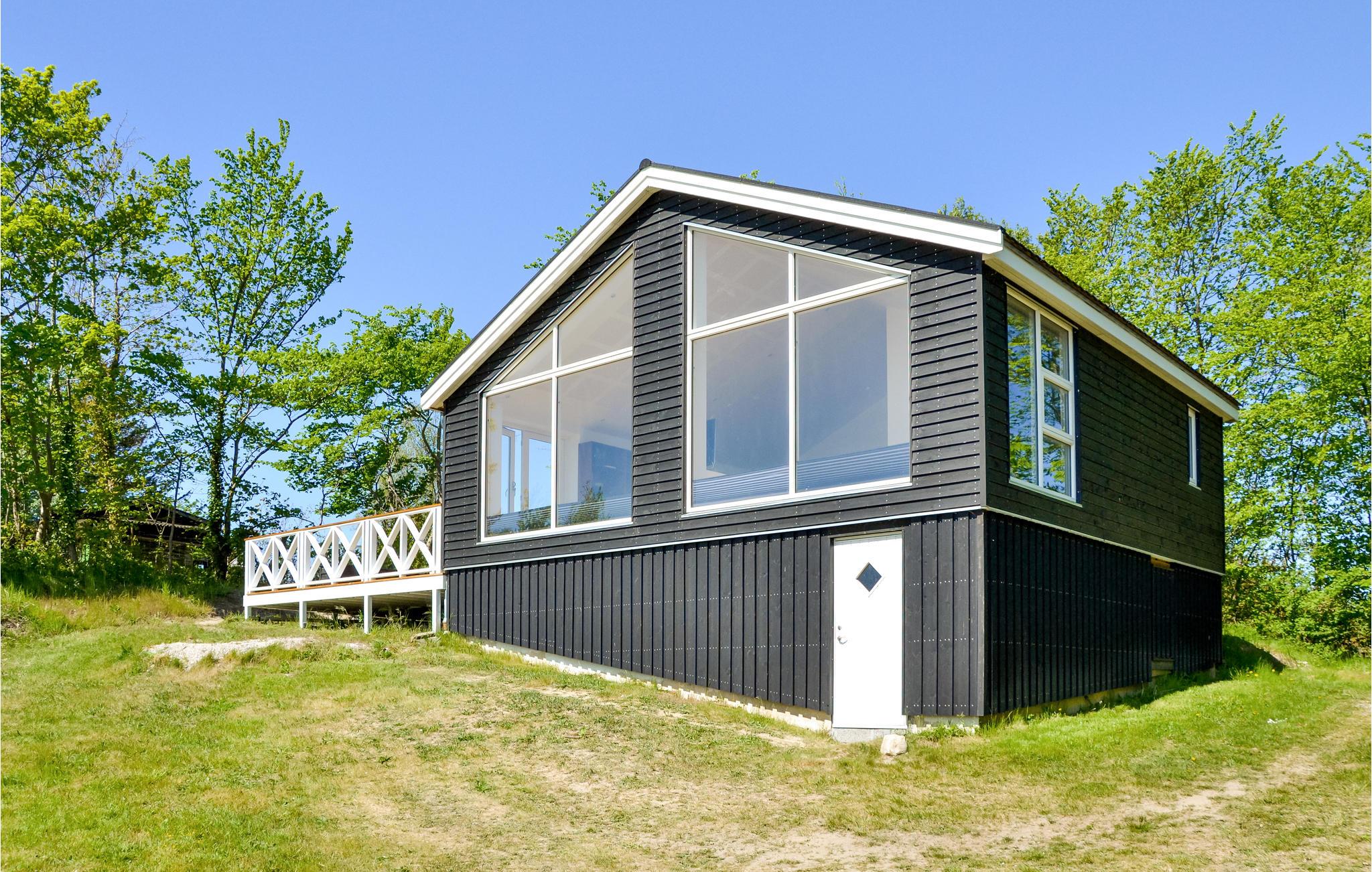 Smukt sommerhus med havudsigt, moderne indretning og stor terrasse nær sandstrand og fiskemuligheder.