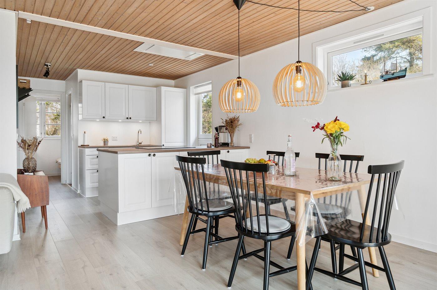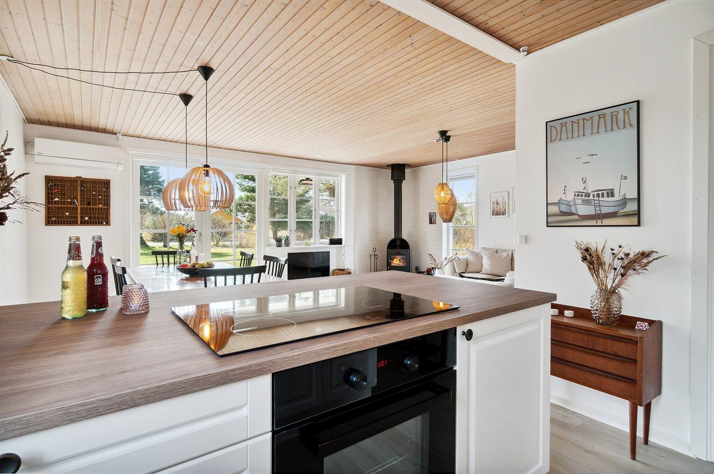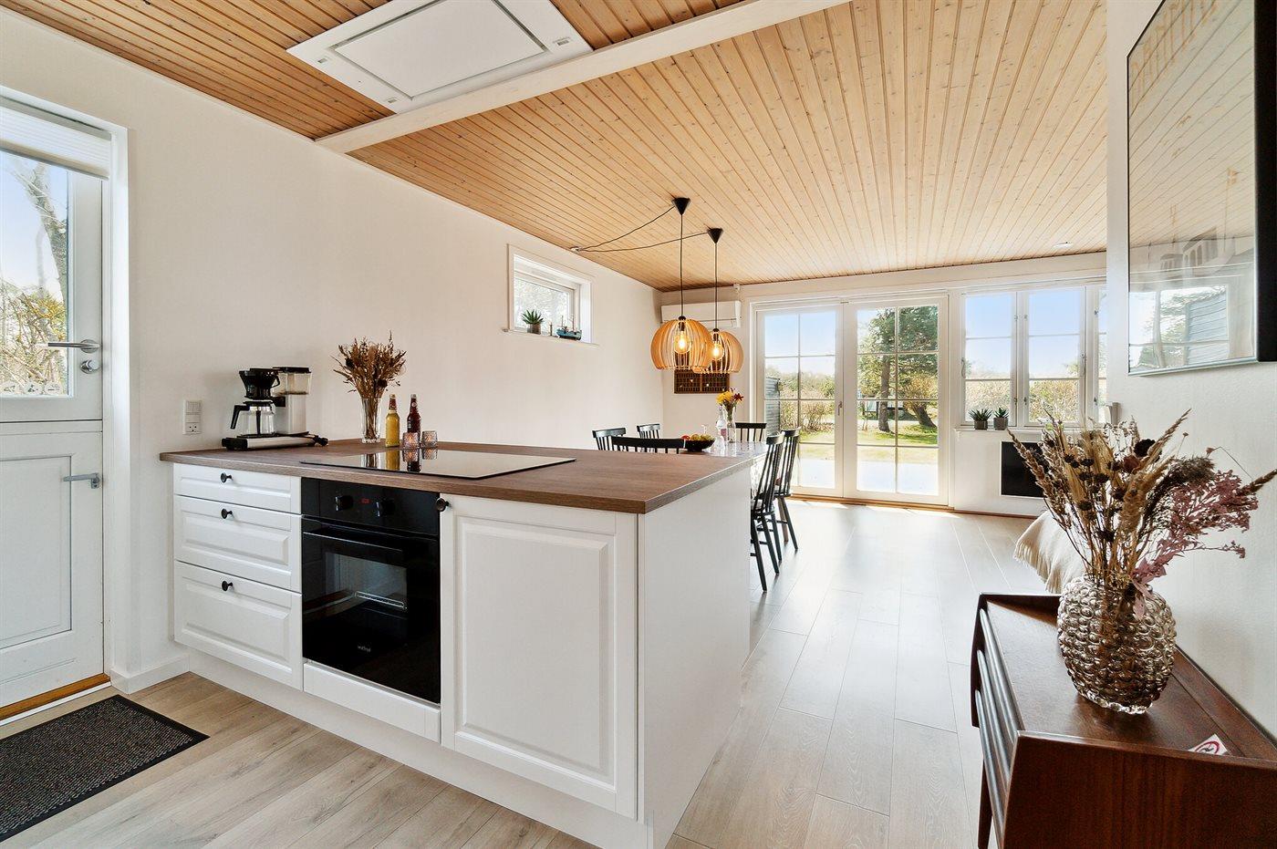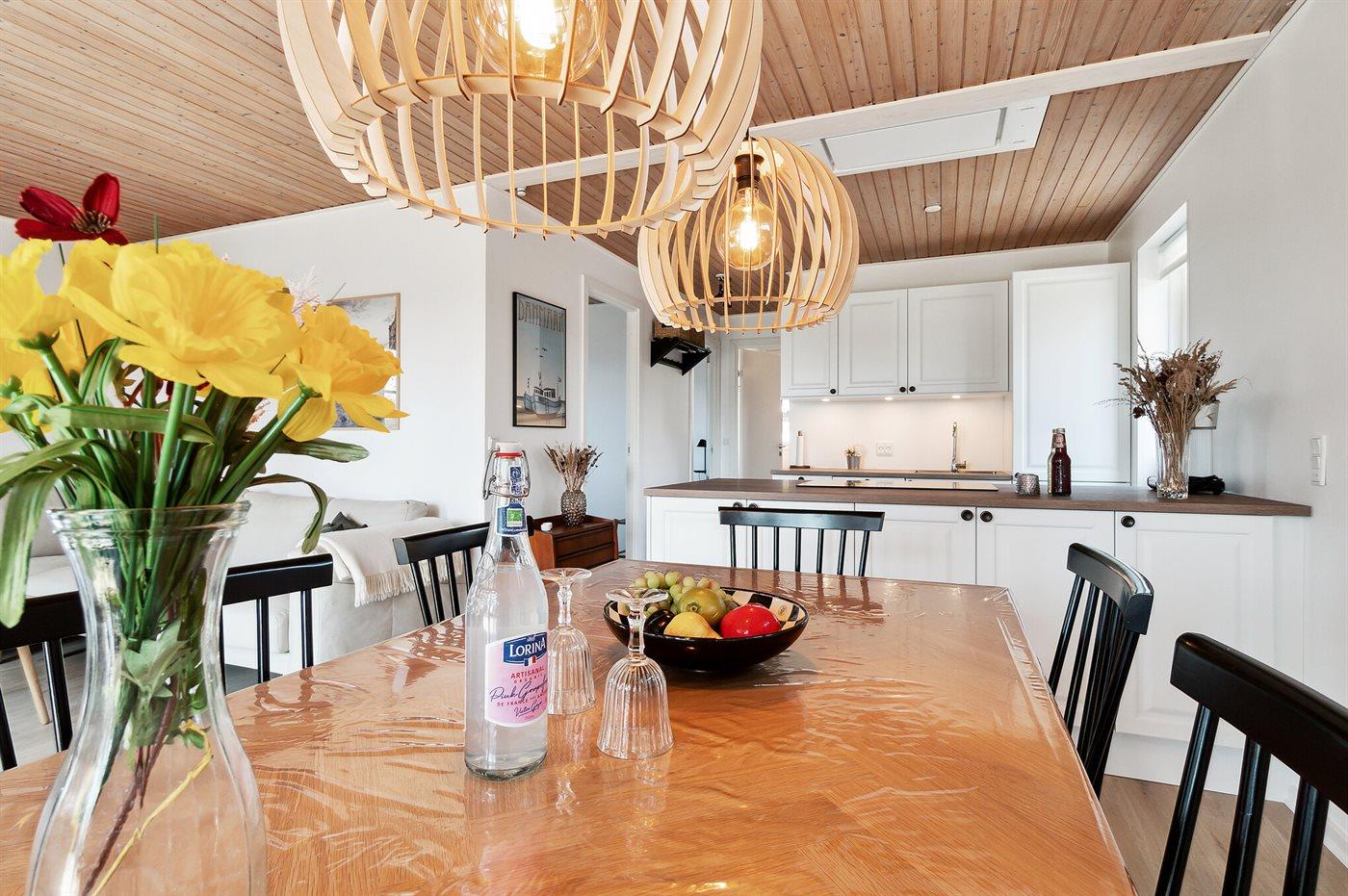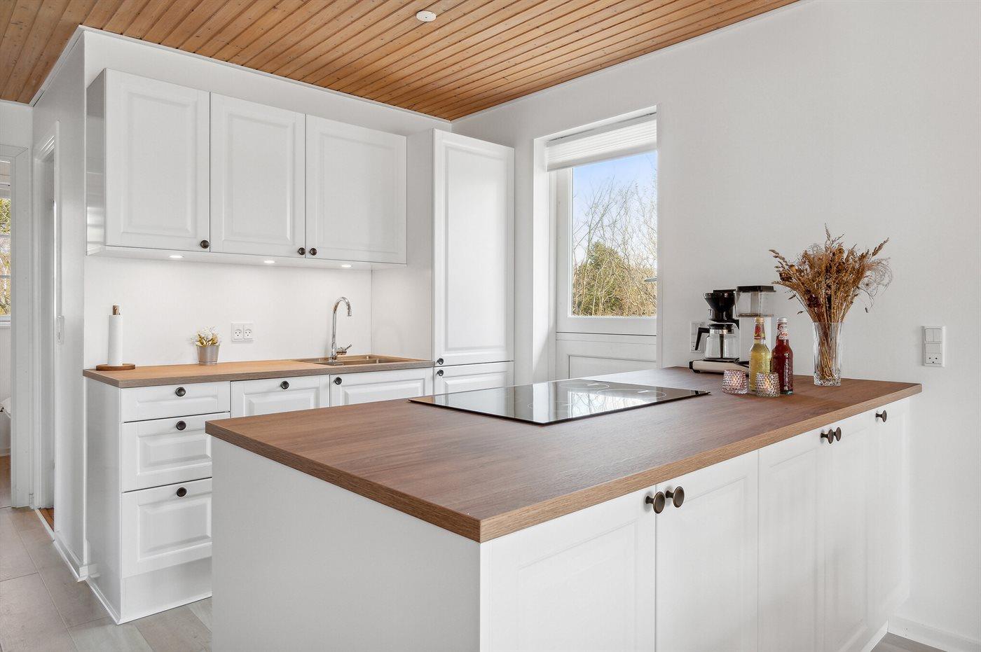 Køkkenet er udstyret med 1 køleskab. Der er 4 keramiske kogeplader, varmluftovn, mikrobølgeovn samt opvaskemaskine.