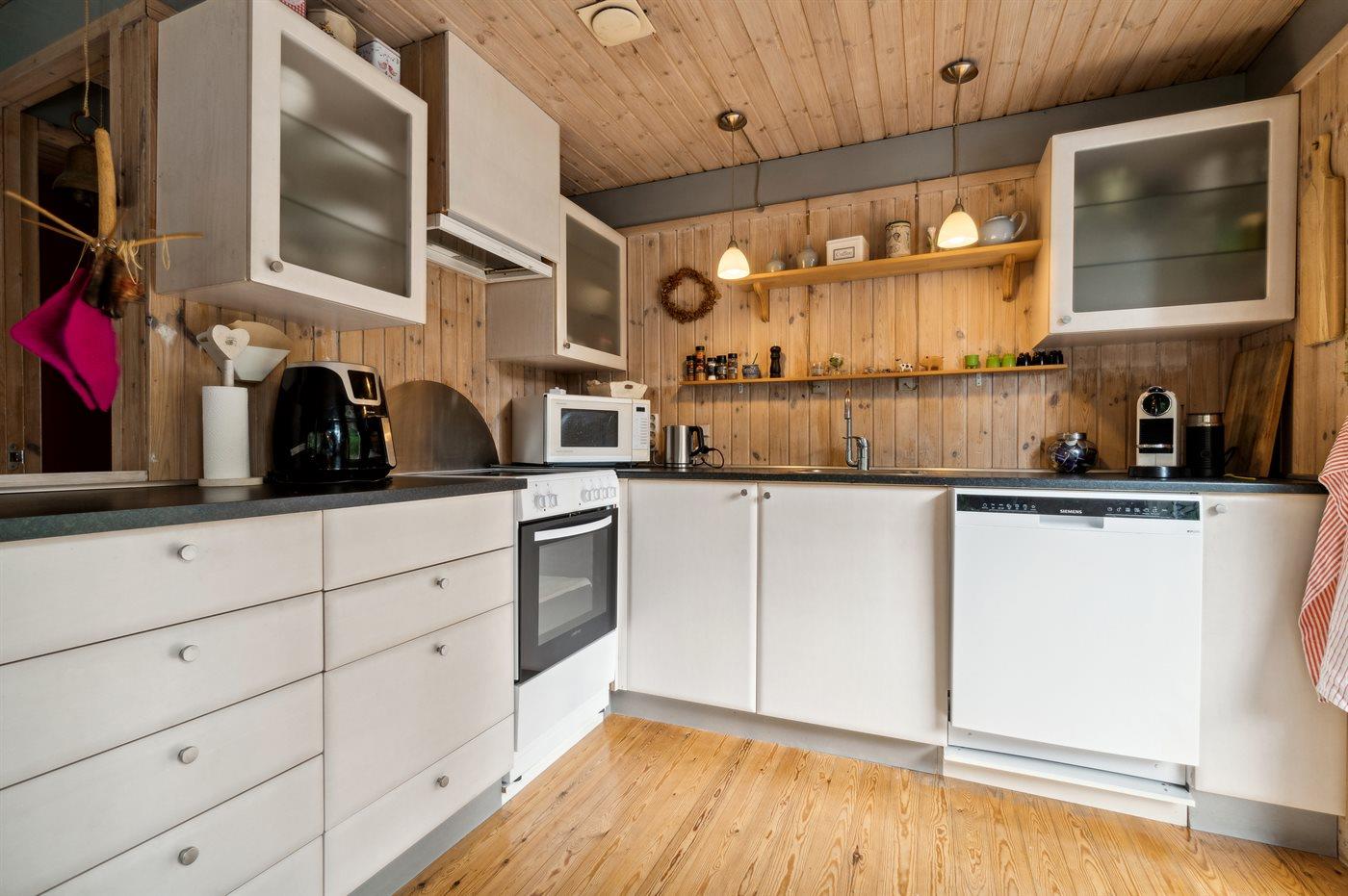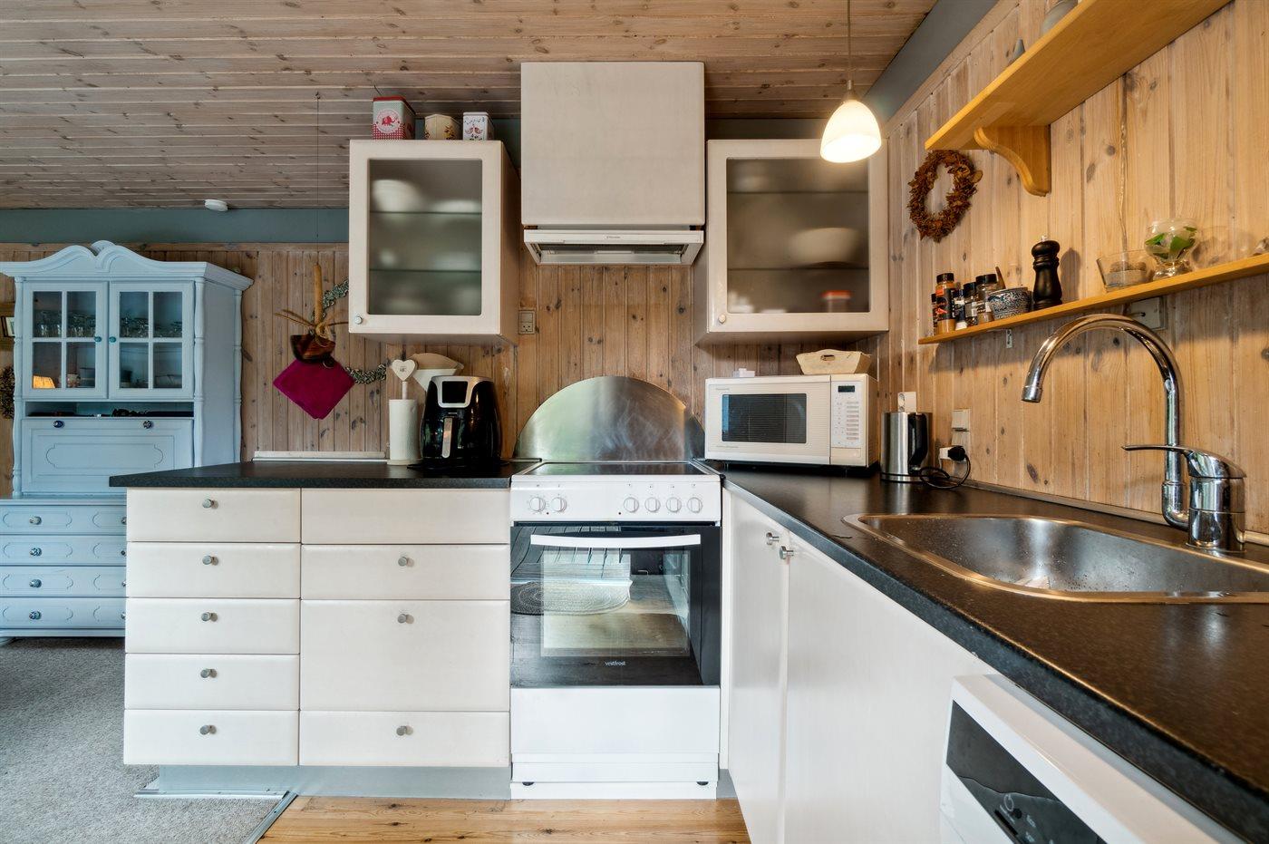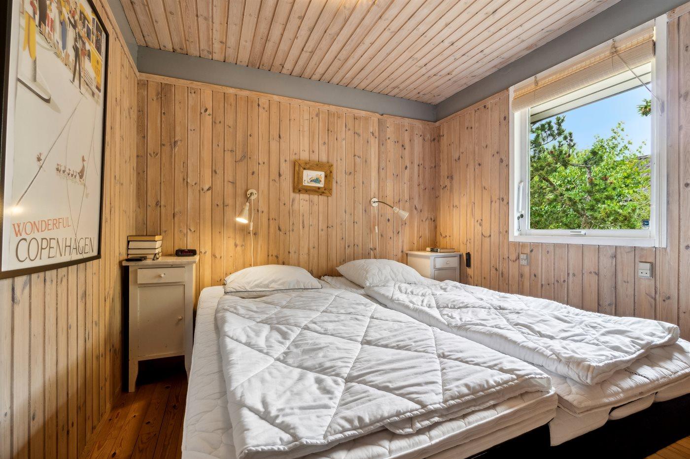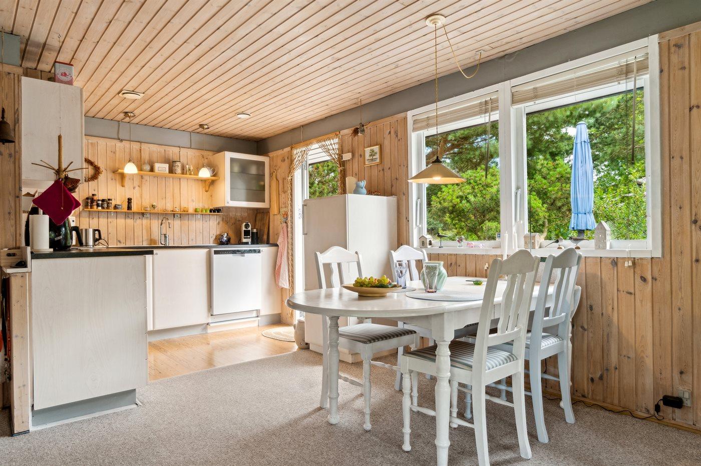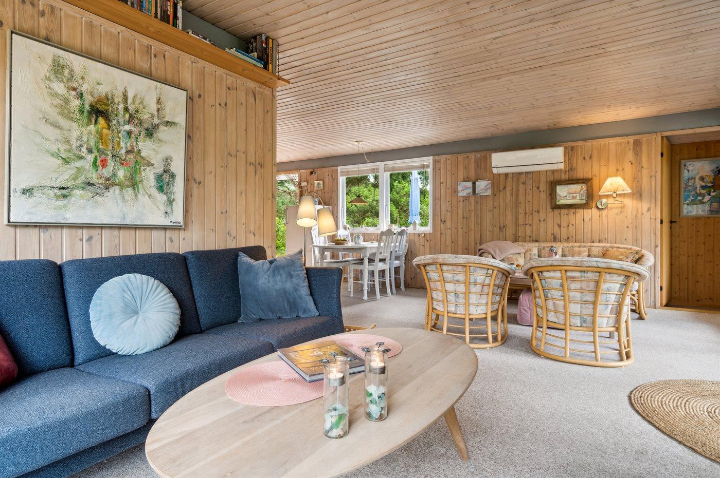Indvendig er der lyse trævægge og -lofter. Plankegulve, dog lyst gulvtæppe i opholdsstuen. I 2010 er der indrettet nyt køkken og badeværelse med bruseniche og vaskemaskine. Køkkenafdelingen er indrettet lyst og venligt med bl.a. mikroovn, opvaskemaskine og separat fryser (75 l). Den rummelige stue er bl.a. møbleret med 2 sofagrupper og udstyret med hyggelig brændeovn og TV. 3 soveværelser med god skabsplads; 1 med dobbeltseng (hvoraf 1 er med elevation), 1 med 2 enkeltsenge og 1 med 1 enkeltseng. Der er installeret trådløs internetforbindelse.