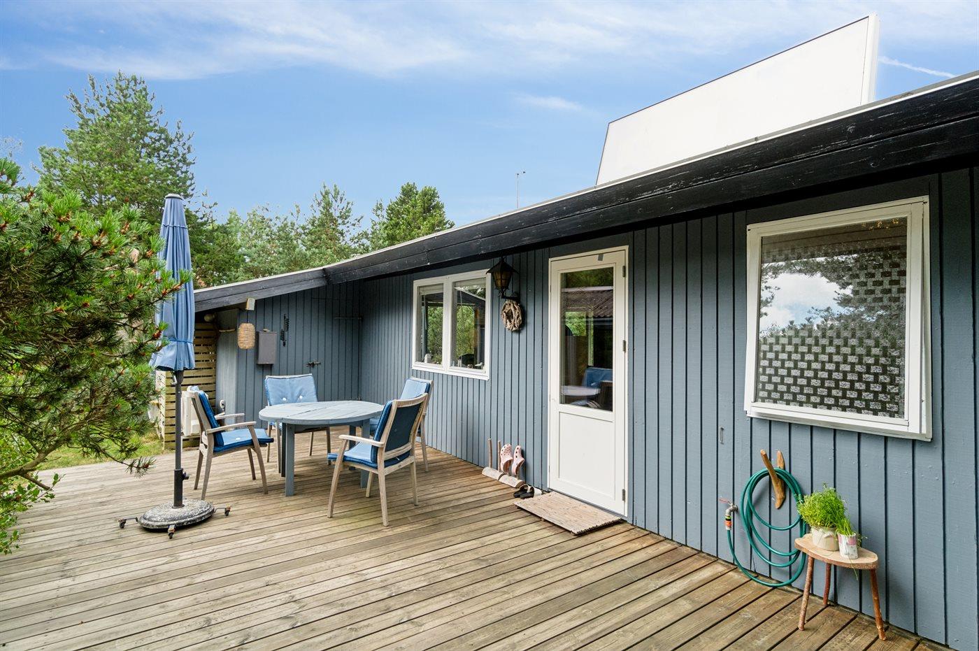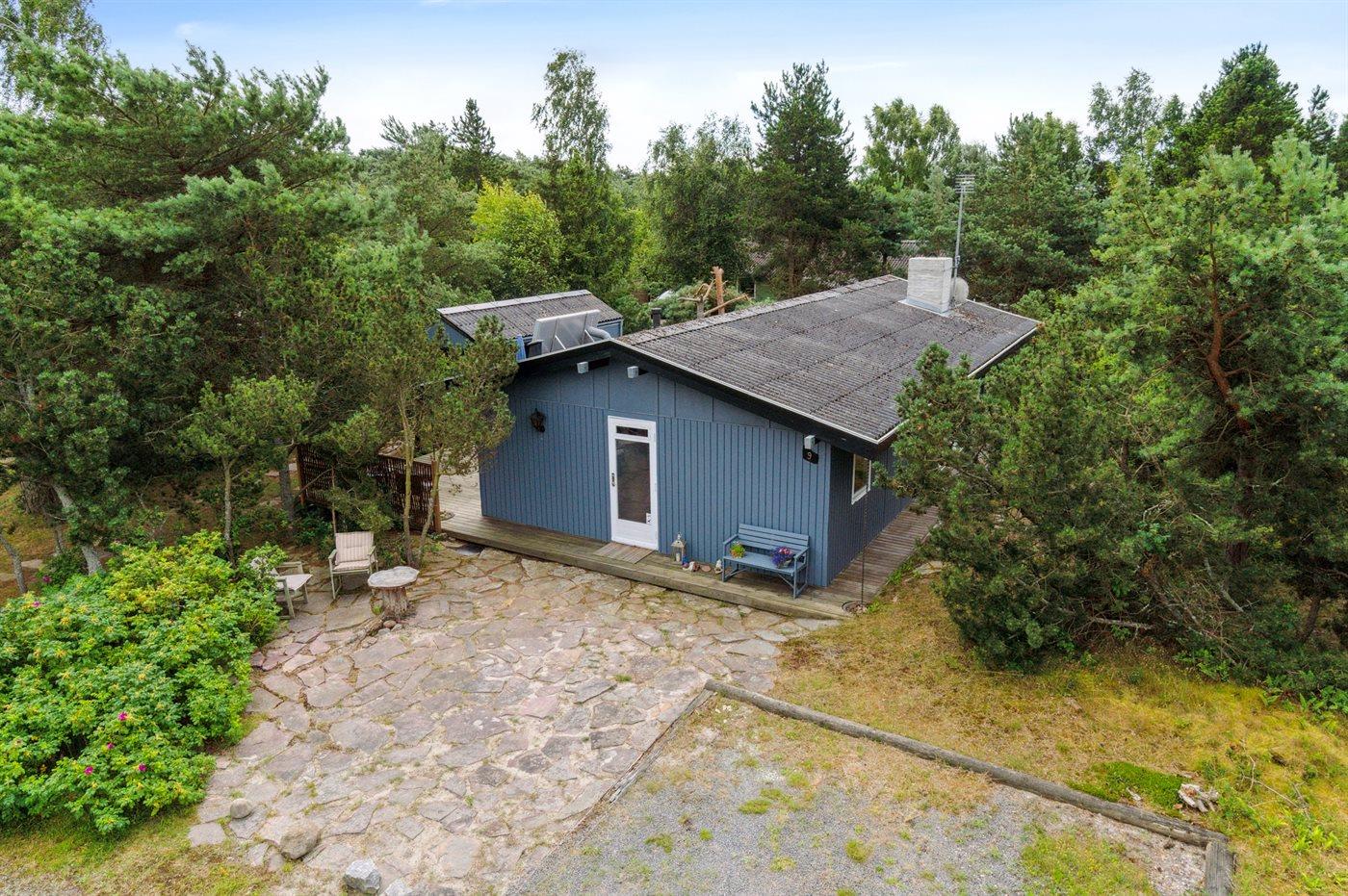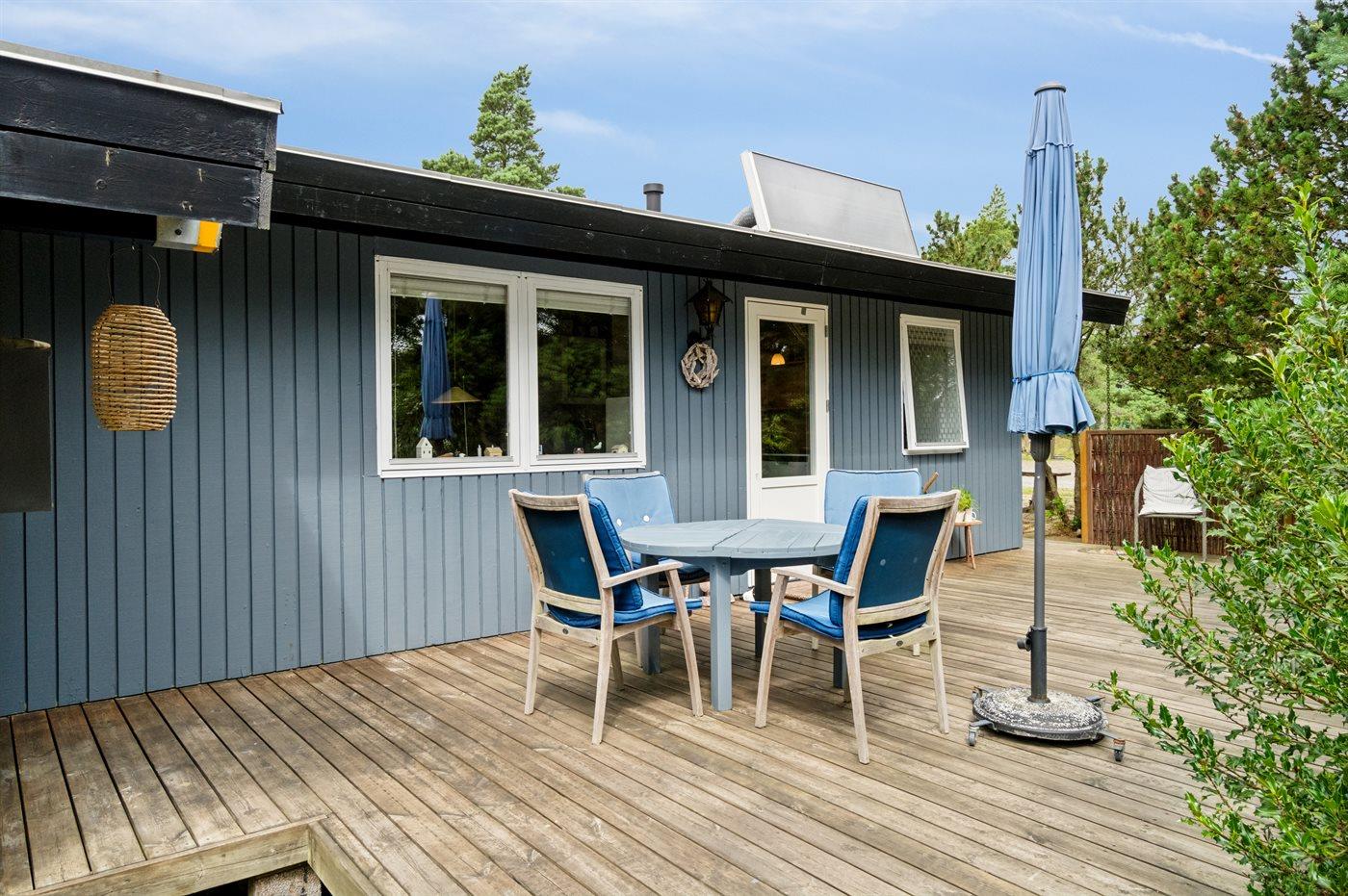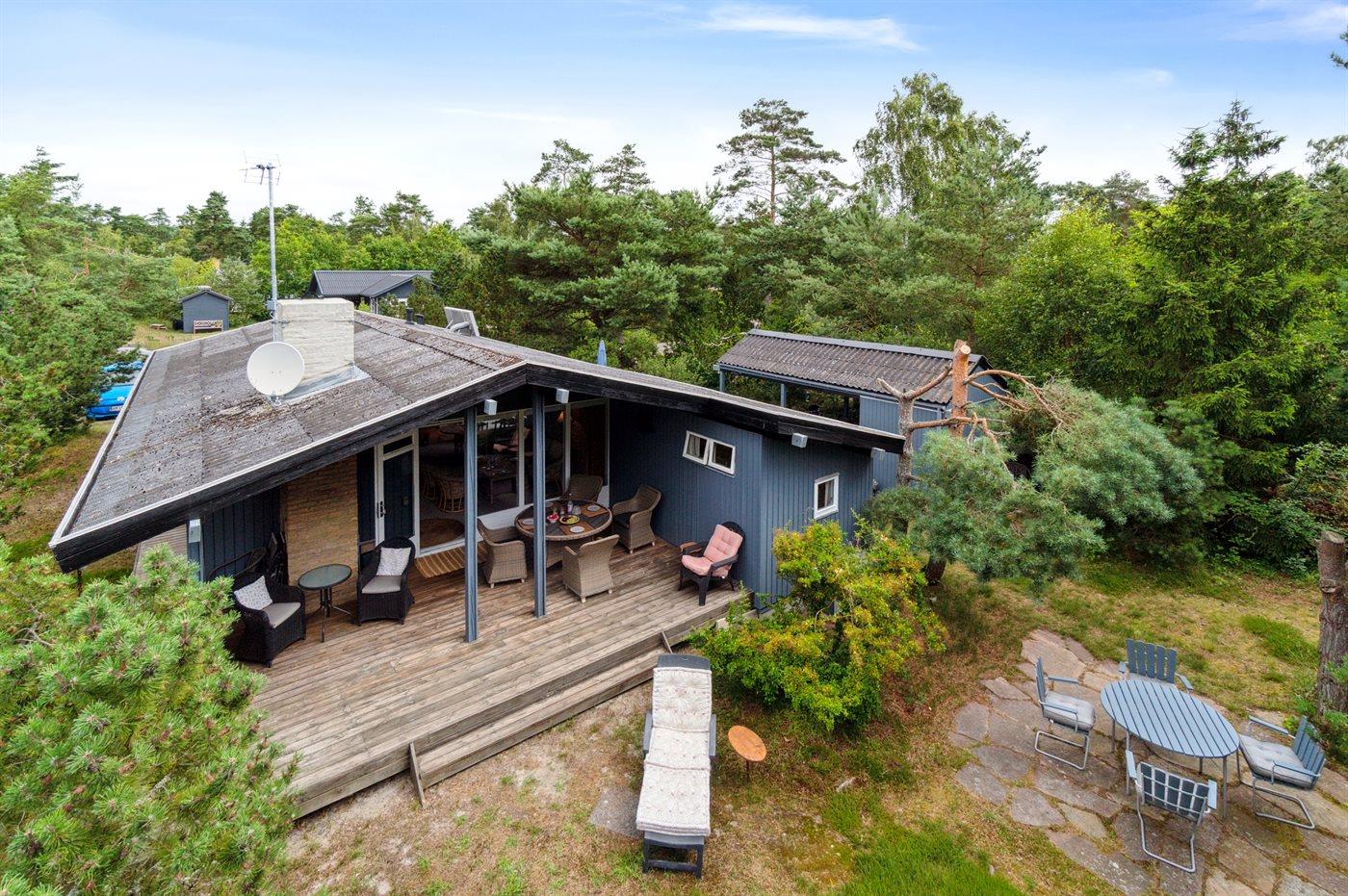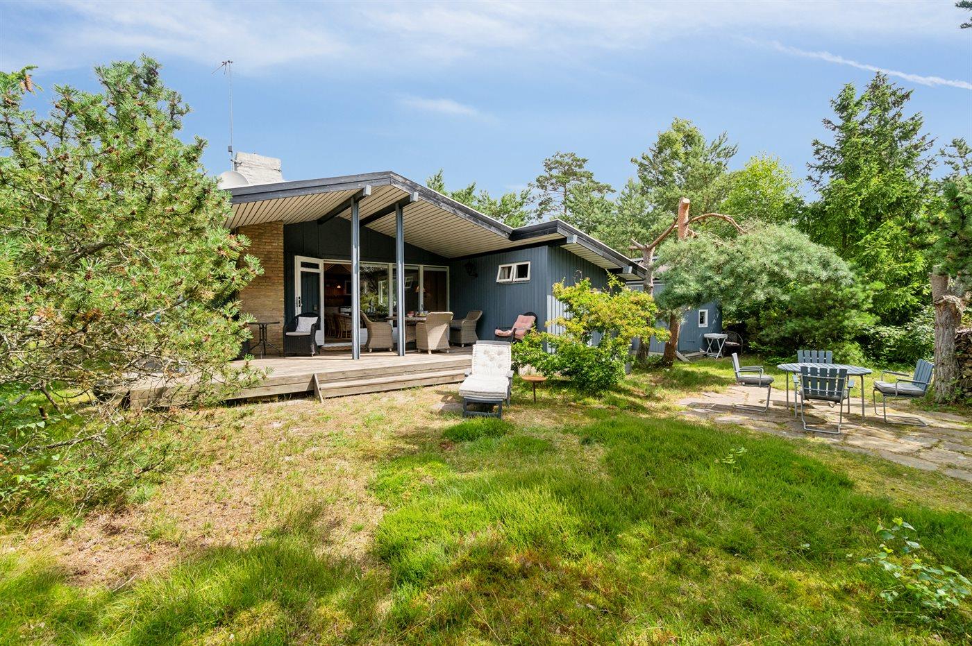 Huset ligger på en læfyldt naturgrund, og fra træterrasserne kan I nyde den bevoksede grunds små lækroge. Der er til huset både carport og P-plads. Ferieboligen er udstyret med 1 energibesparende luft til luft varmepumpe.