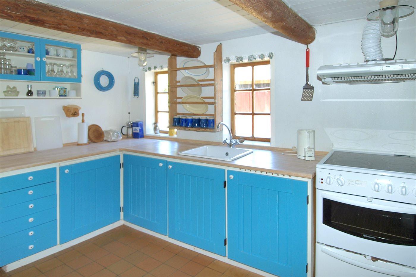 Tidligere landejendom i bindingsværk, bygget i 1875 og moderniseret i 1999, beliggende på en stor ugeneret naturgrund med levende hegn og træer op til sommerhusområdet ved Sømarken - tæt på stranden, røgeriet og den lille hyggelige havn. På grunden er der gynge til børnene samt god plads til leg og boldspil. Huset er rummeligt og rustikt indrettet. Køkkenet er bl.a. udstyret med varmluftovn og komfur med keramiske kogeplader. Opvaskemaskine og vaskemaskine i grovkøkken. Dette hus har tidligere rummet et bageri og af nostalgiske hensyn, så er både bageovn og gruekedel stadig bevaret sammen med et rigtig gammelt komfur, der syner flot - vi anbefaler dog, at de moderne udgaver benyttes, når maden skal forberedes. Stor opholdsstue med spiseplads, brændeovn, TV med parabol (digital), DVD-afspiller og stereoanlæg med CD-afspiller. Endvidere en lille, hyggelig opholdsstue med brændeovn. Sovepladserne fordeler sig på 1 soveværelse med dobbeltseng samt 1 med 2 enkeltsenge. I den store stue er der endvidere opgang til hems med 2 enkeltsenge. Badeværelse med bruseniche. Gratis internetforbindelse (egen computer skal medbringes) samt bordtennis til rådighed. Der er dels trægulve, dels linoleumsgulve, dels klinkegulve i huset. Det hyggelige sommerhus er velegnet til en afslappende ferie og ligger i et roligt, børnevenligt ferieområde. I området er der endvidere gode fiskemuligheder og Dueodde Golfbane med 18 huller ligger også tæt på huset. Bemærk: Lav dørhøjde (170 cm) enkelte steder i huset.