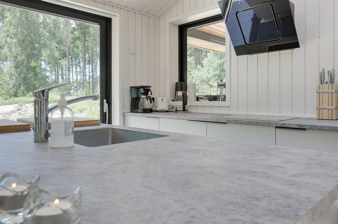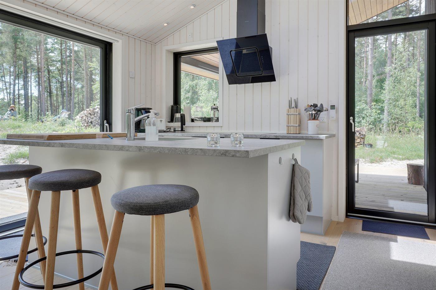 Køkkenet er udstyret med 1 køleskab. Der er 4 keramiske kogeplader, varmluftovn, mikrobølgeovn samt opvaskemaskine.