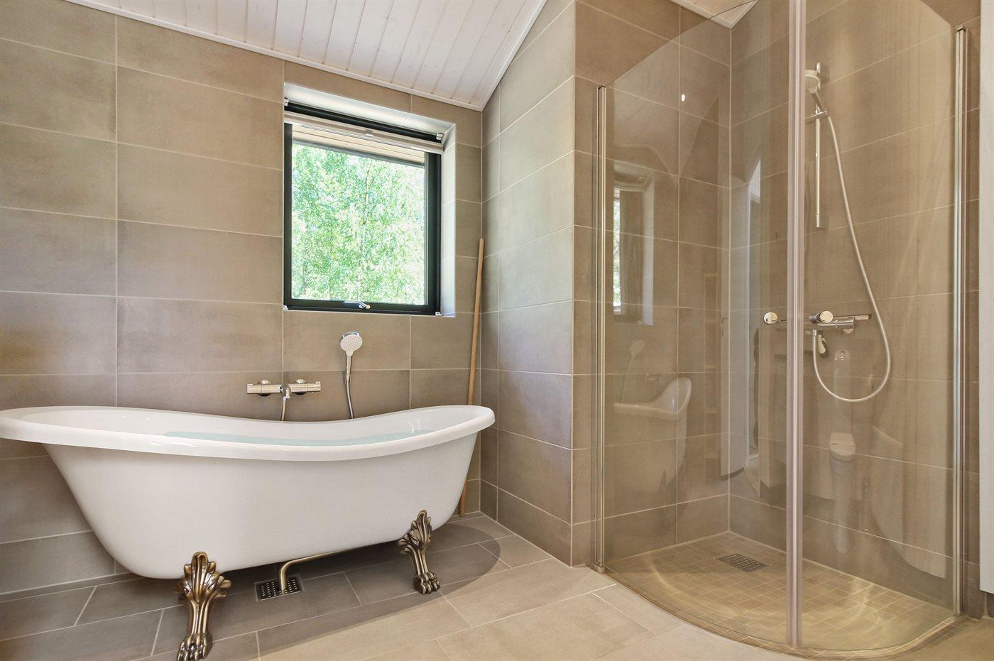 Der er 2 badeværelser med bruseniche og 2 toiletter. Der er gulvvarme på 2 badeværelser.. Badekar.