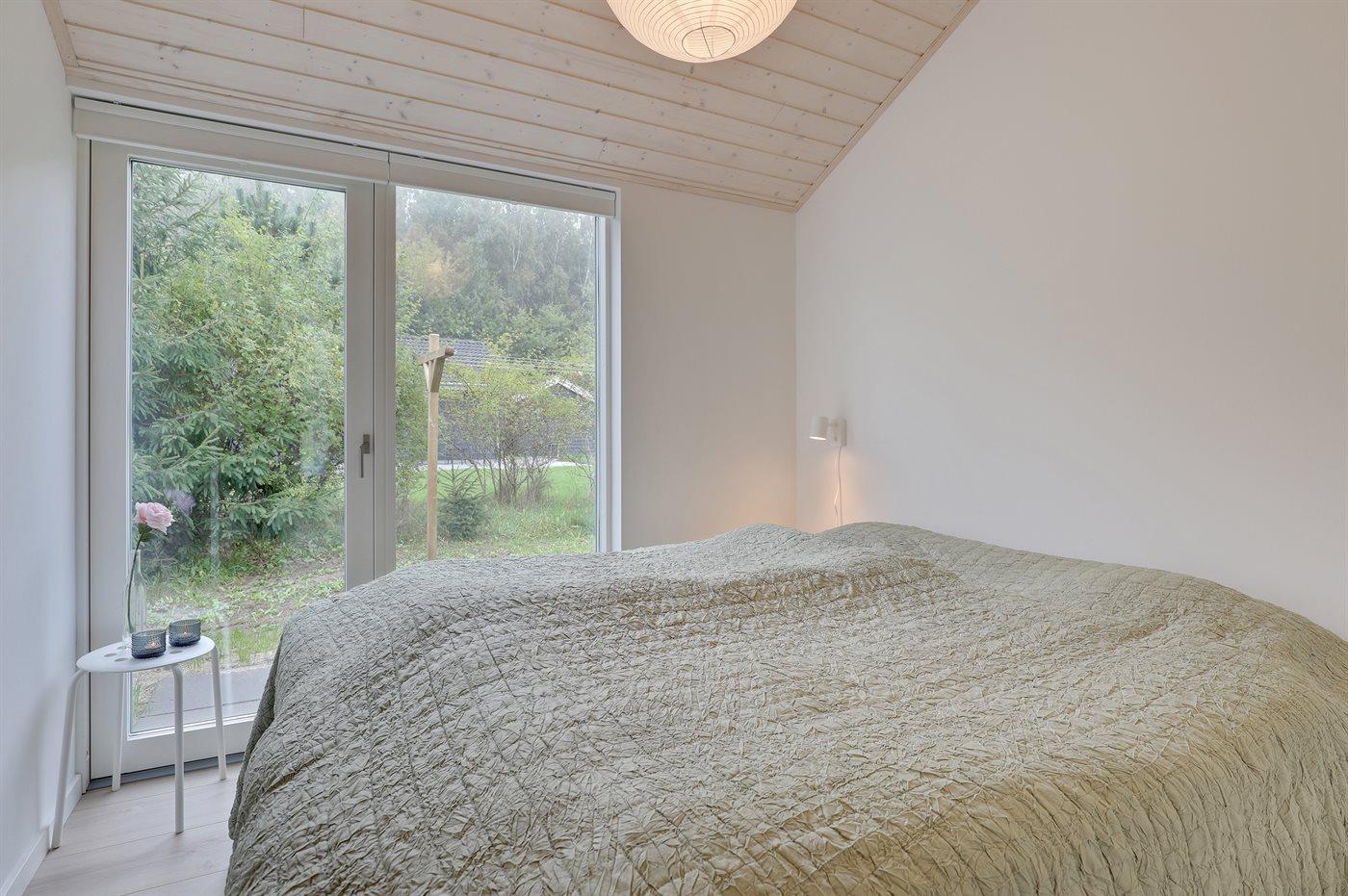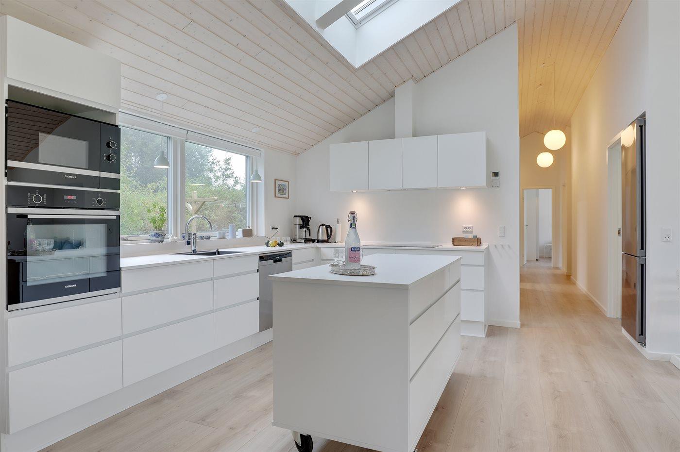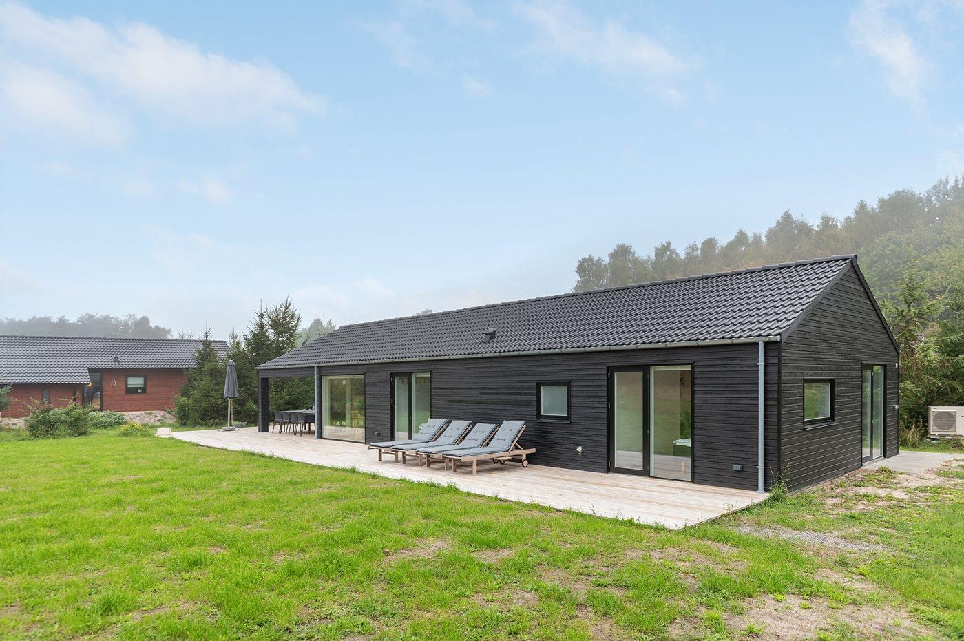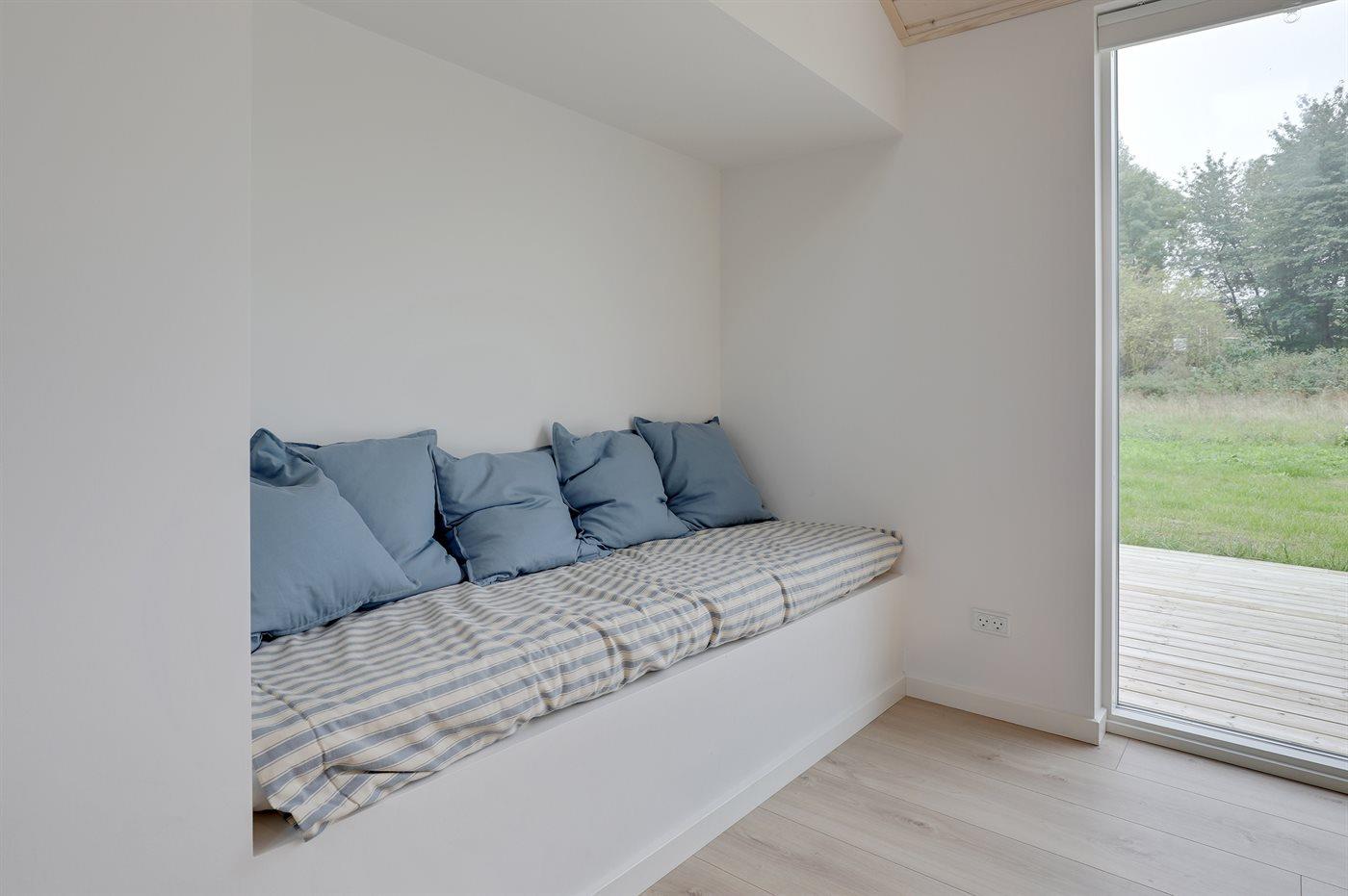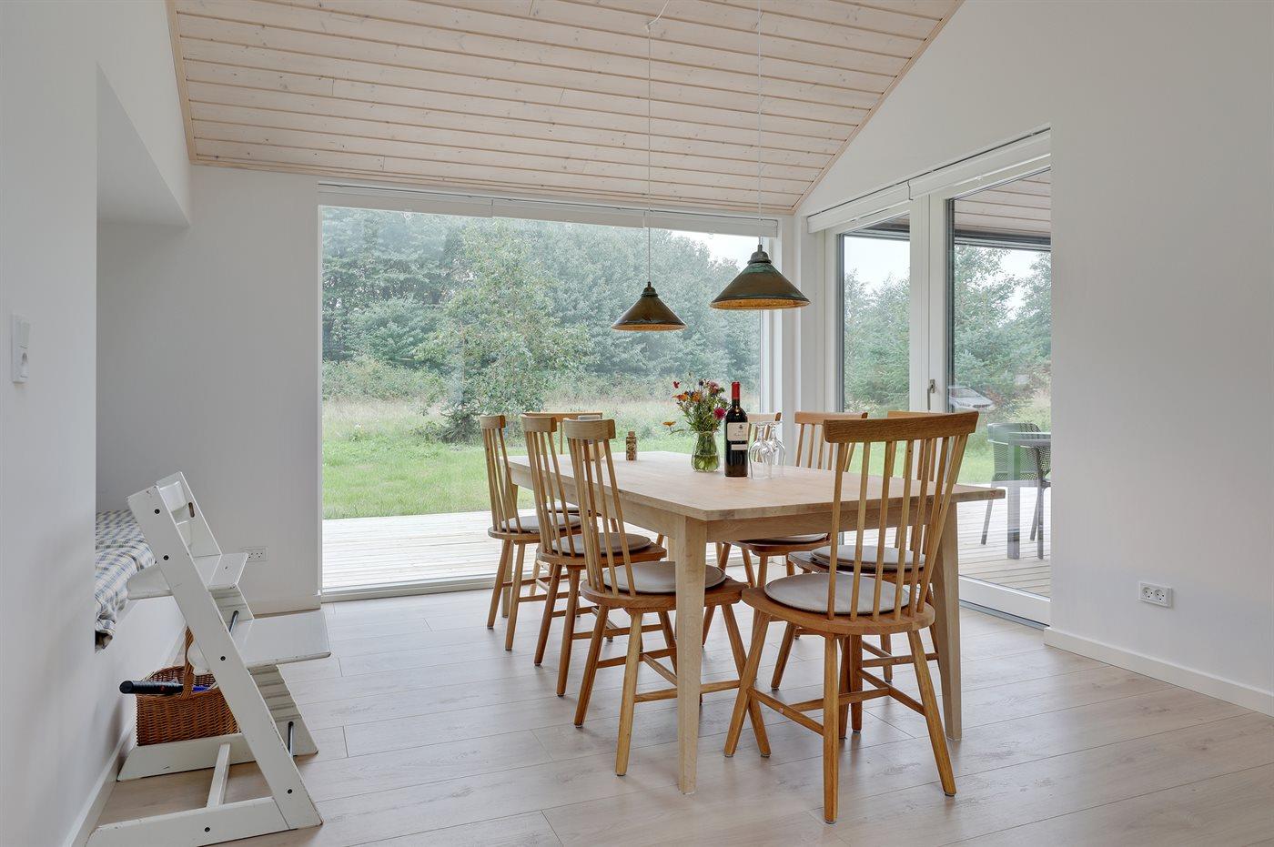 Helt nyt sommerhus fra 2021, omgivet af træterrasser, velbeliggende på lukket sidevej i et roligt feriehusområde nær sandstrand, røgeri og Michelin-restaurant. Huset er indrettet lyst og indbydende med alkove i opholdsstuen.