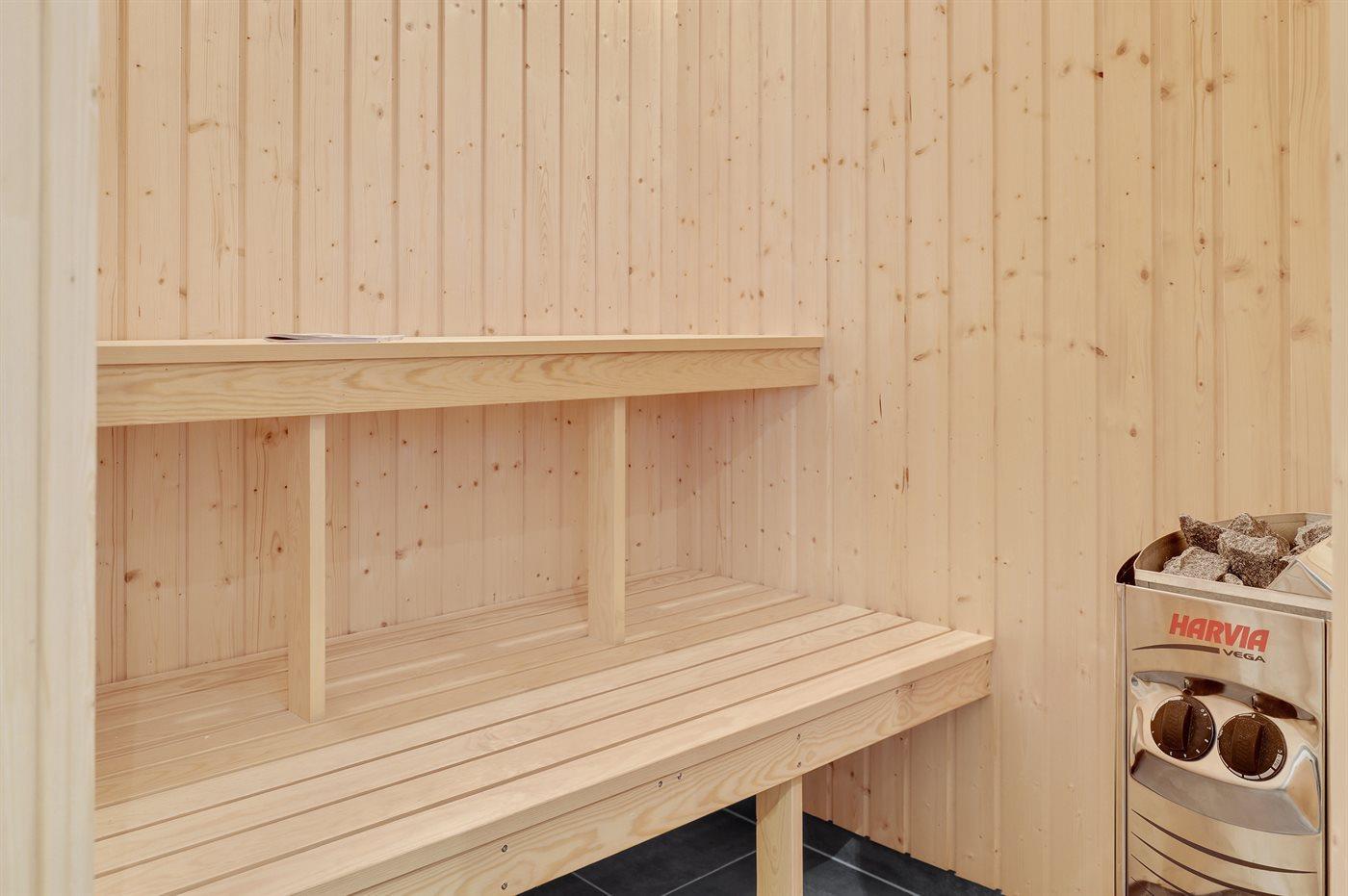 Der er 2 badeværelser med bruseniche og 2 toiletter. Der er gulvvarme på 2 badeværelser. I saunaen er der mulighed for afslapning.